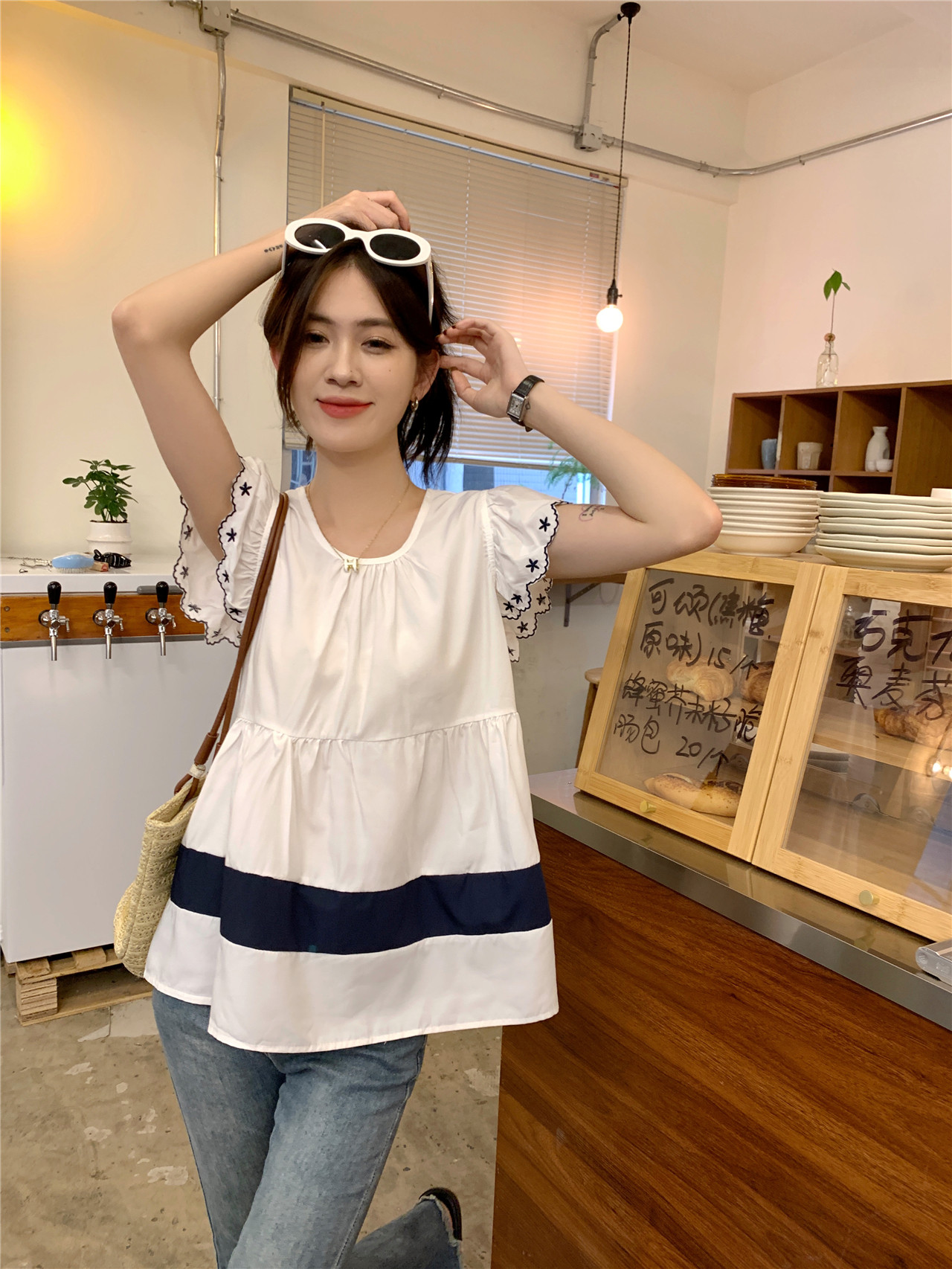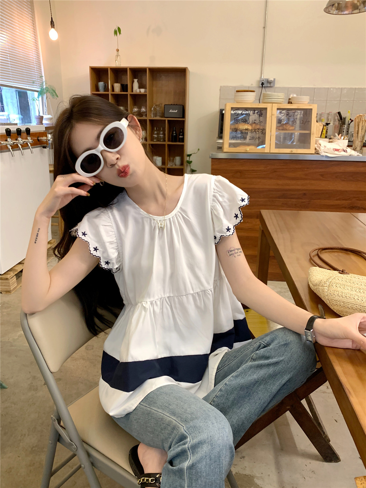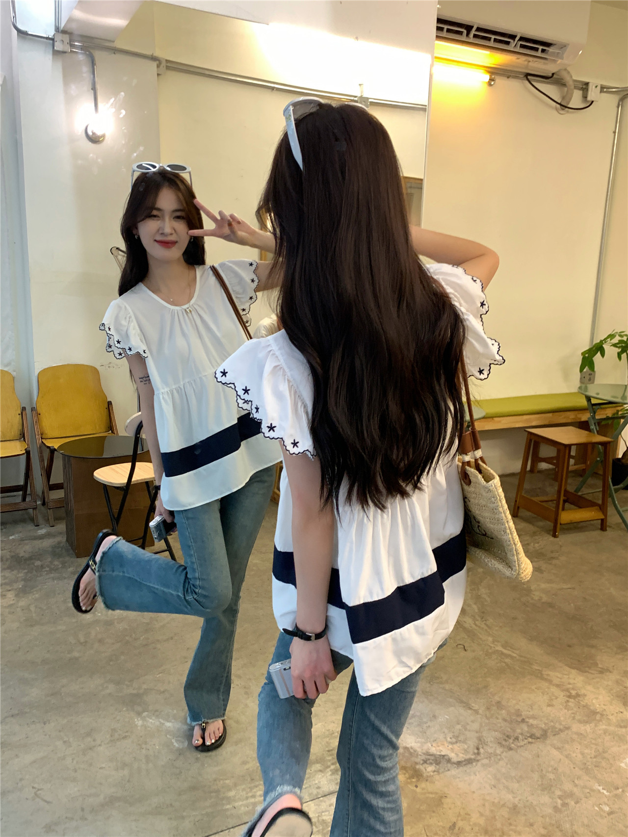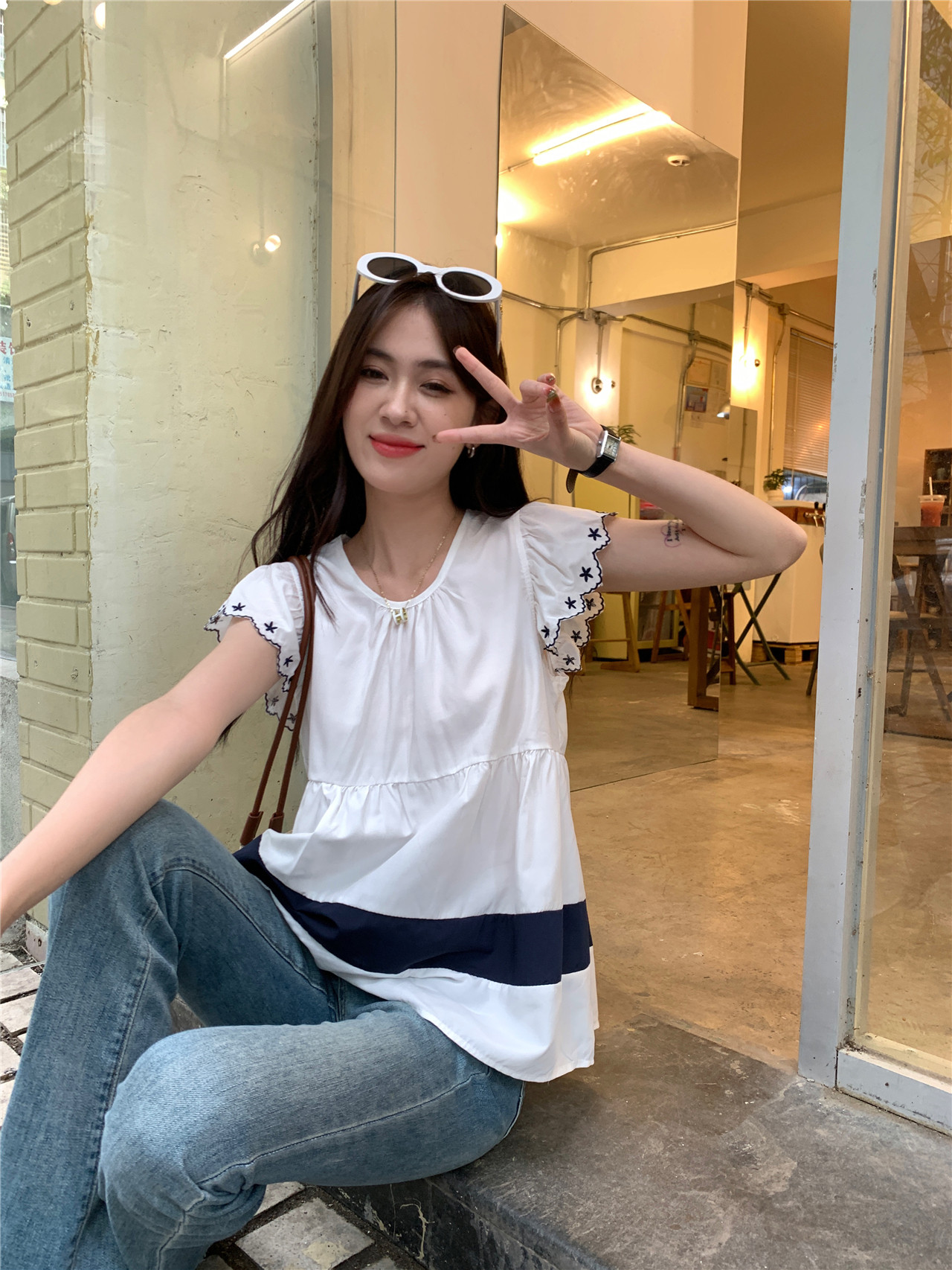 RM18198#法式甜美风衬衫女夏季飞飞袖设计感绣花拼接宽松显瘦上衣