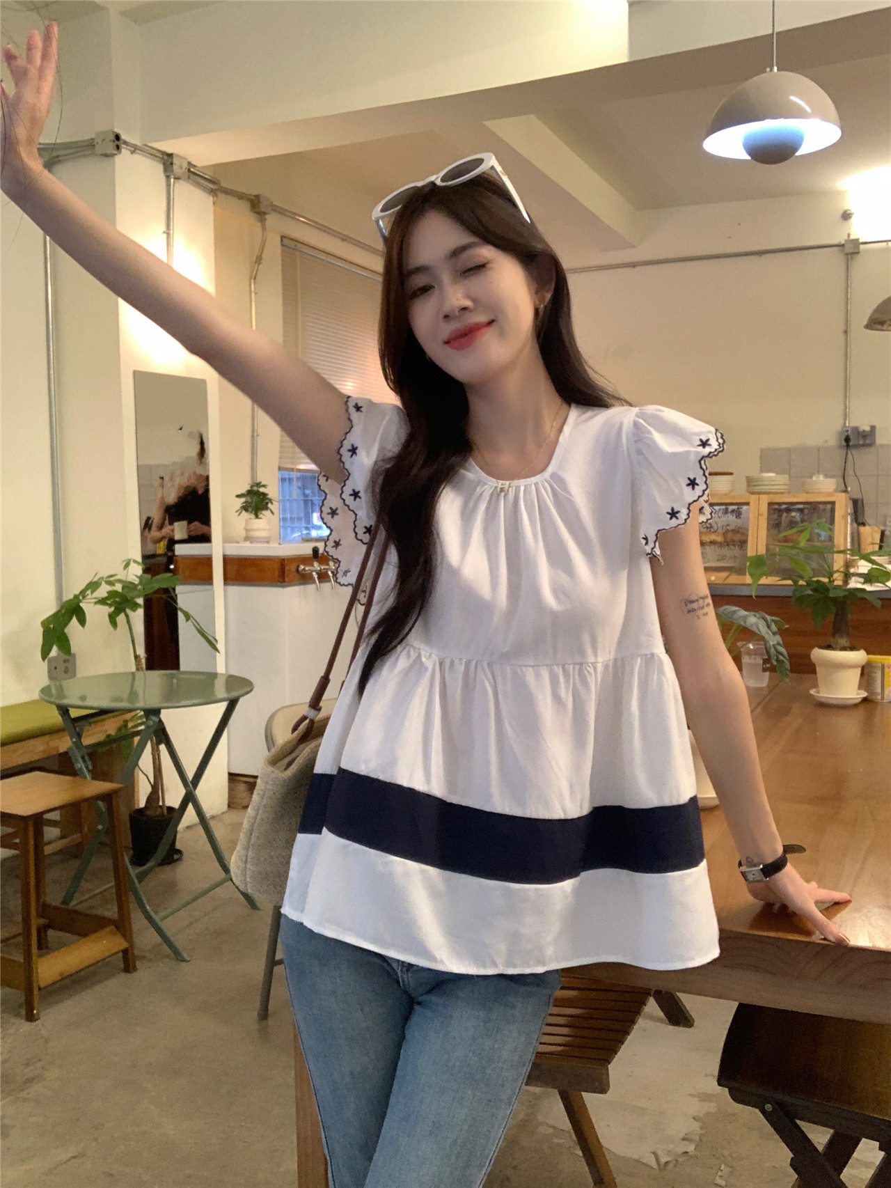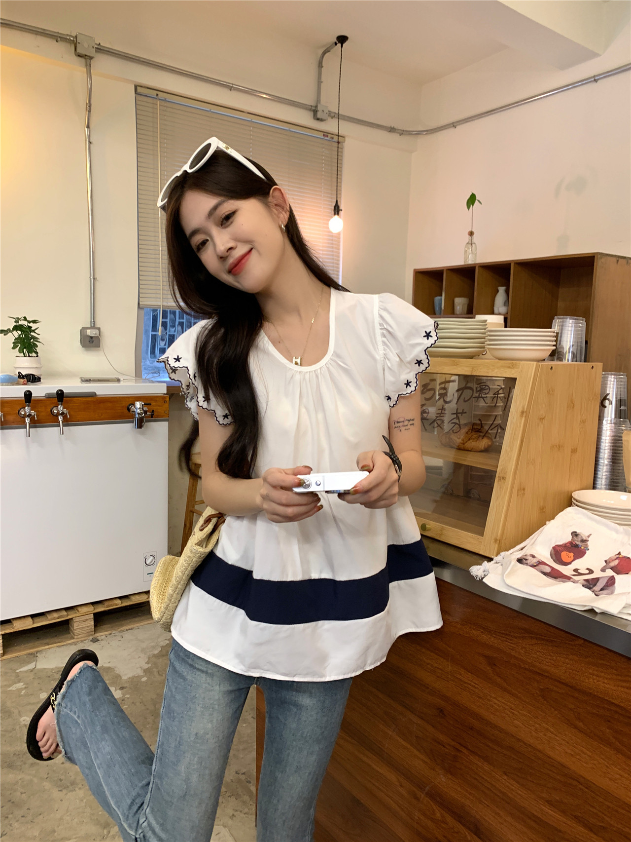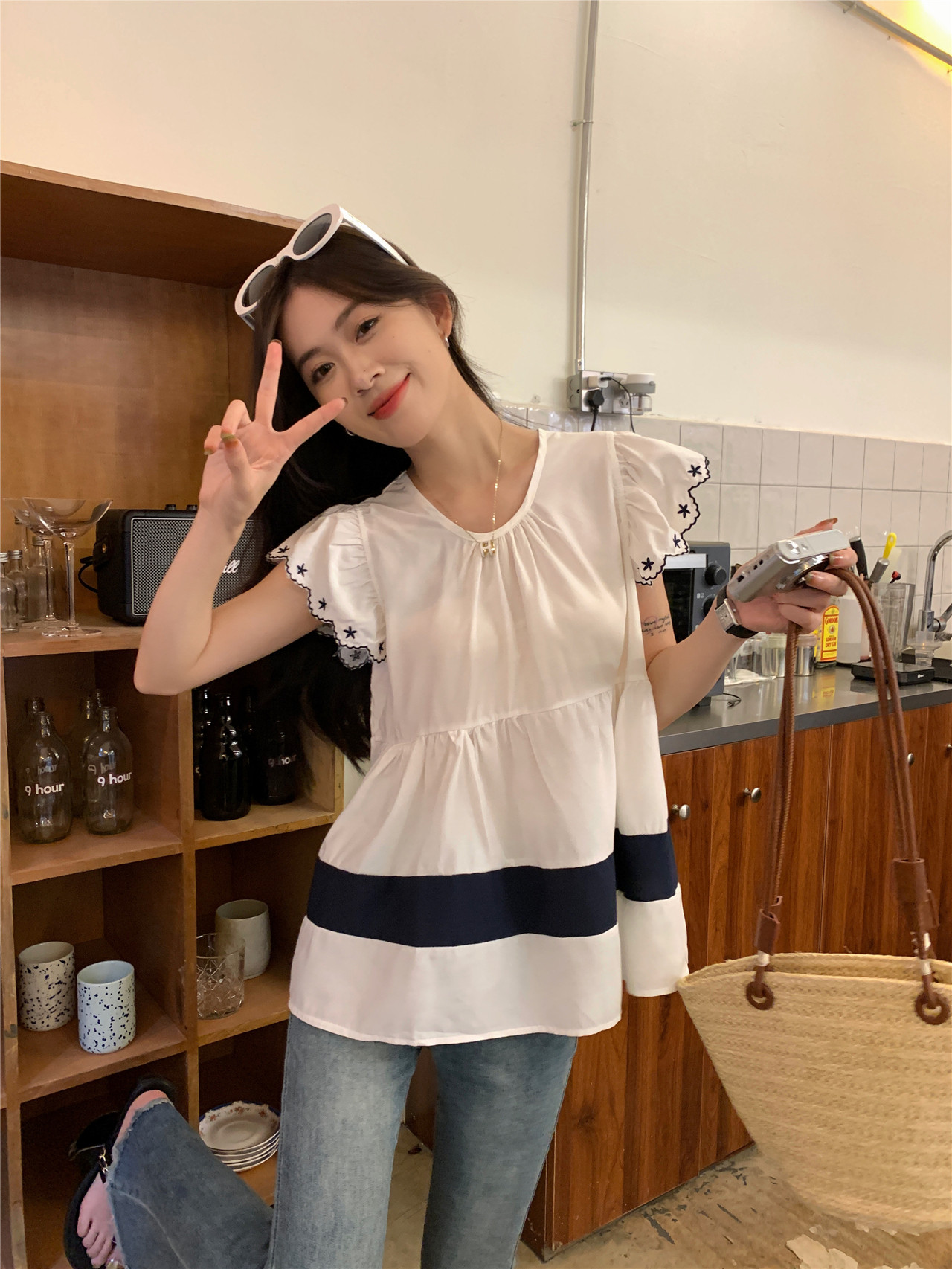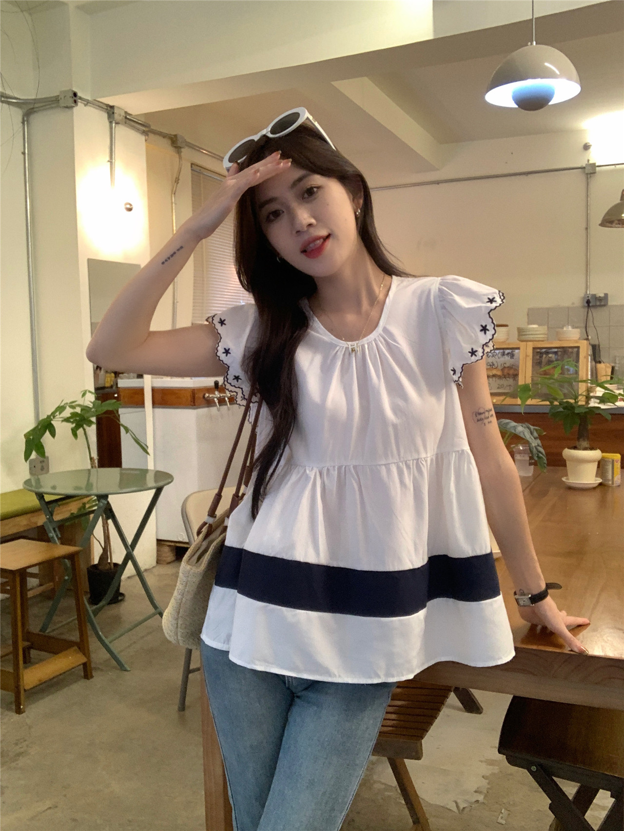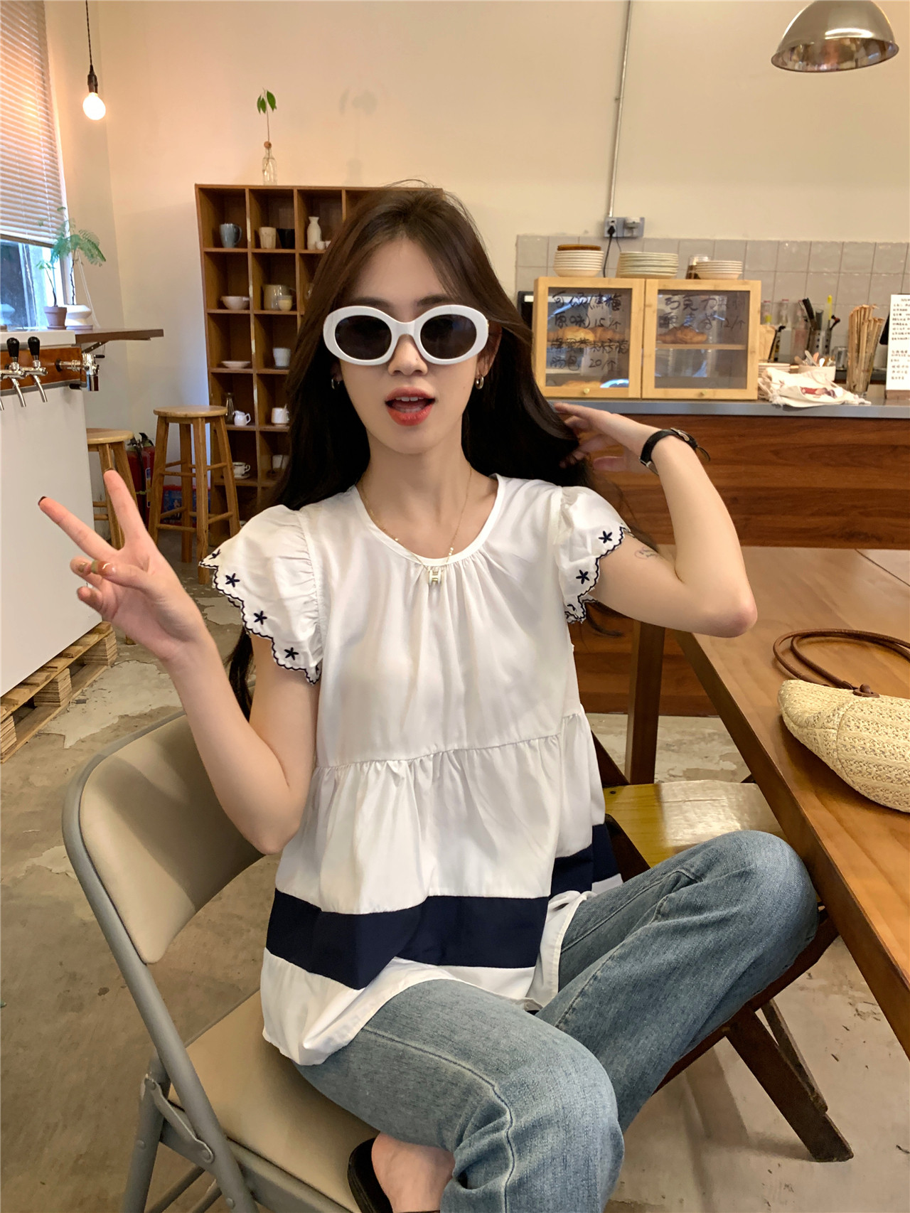 RM18198#法式甜美风衬衫女夏季飞飞袖设计感绣花拼接宽松显瘦上衣