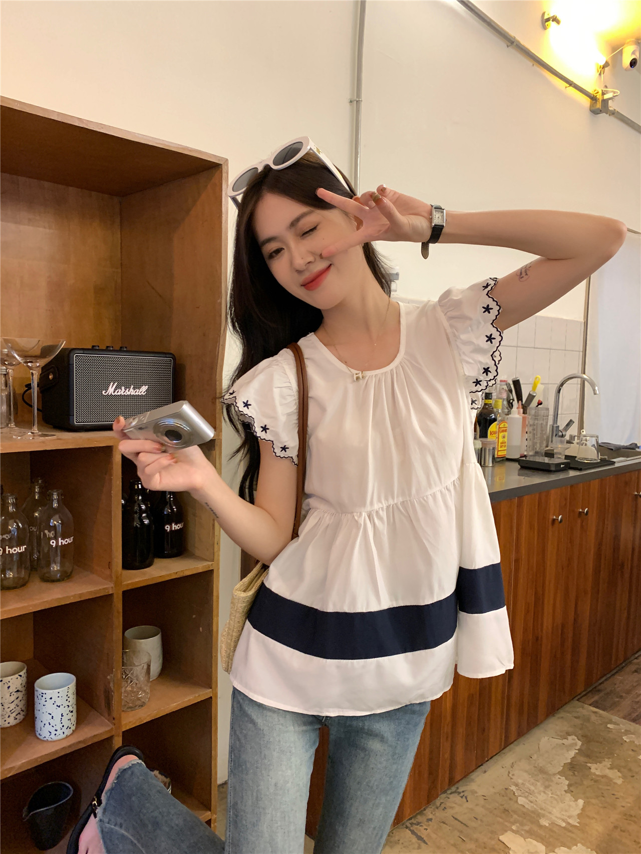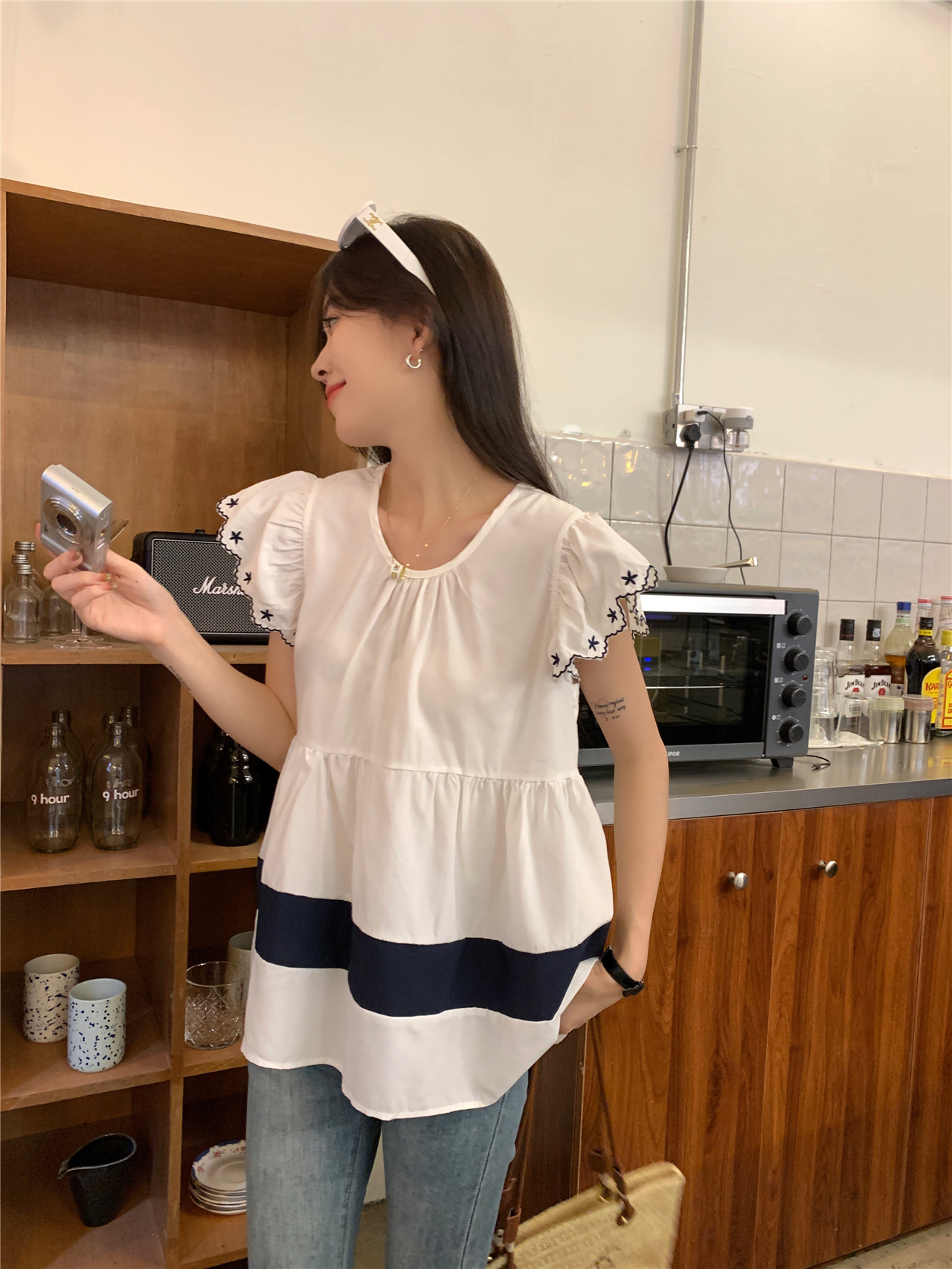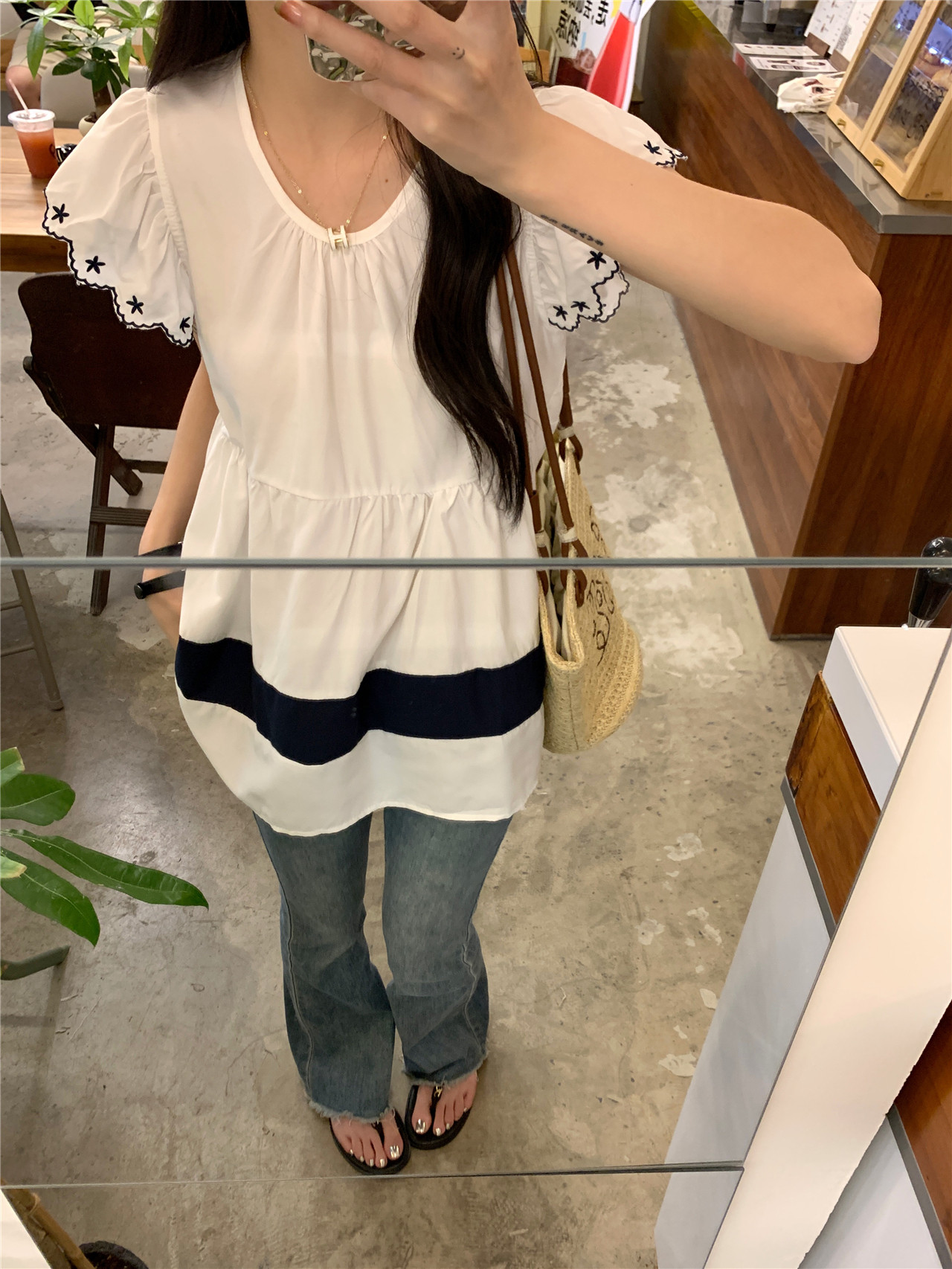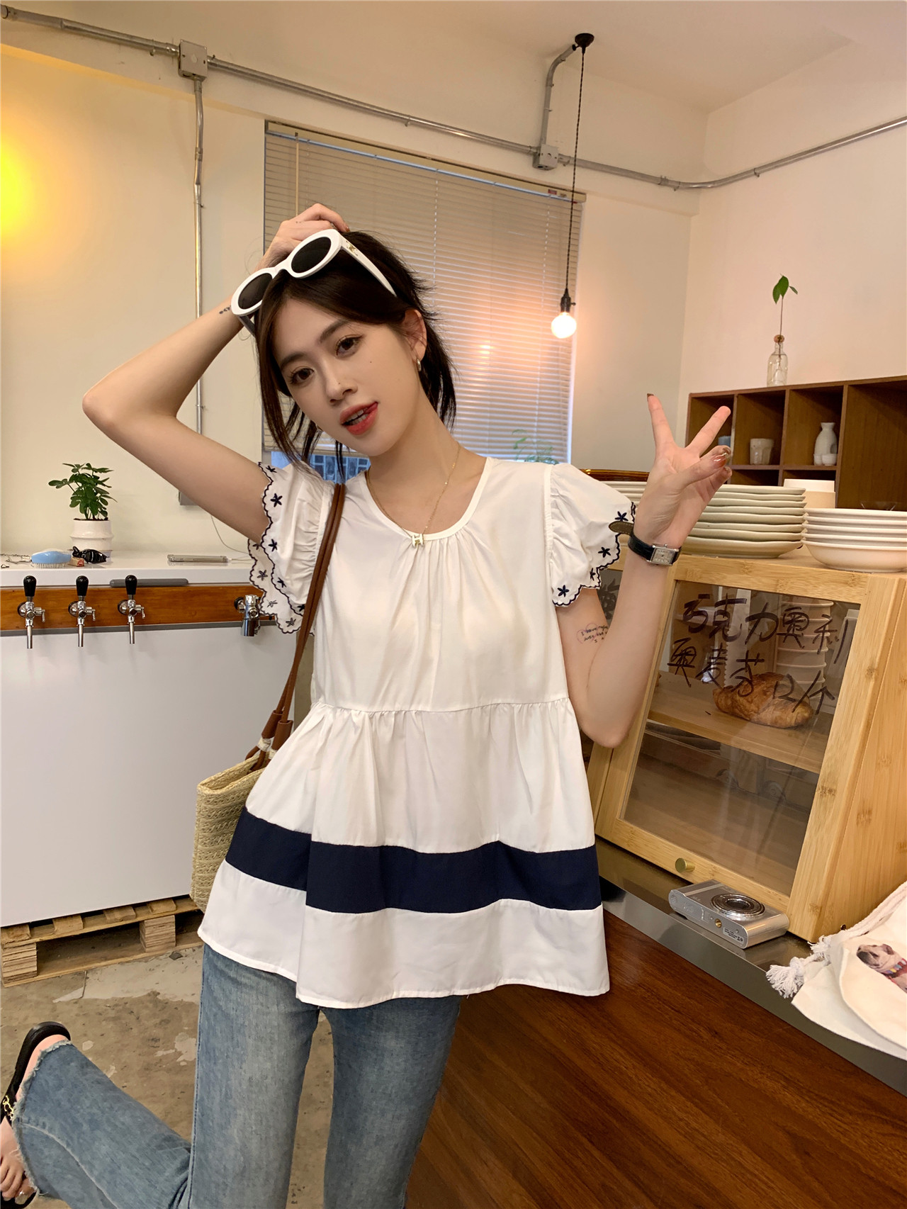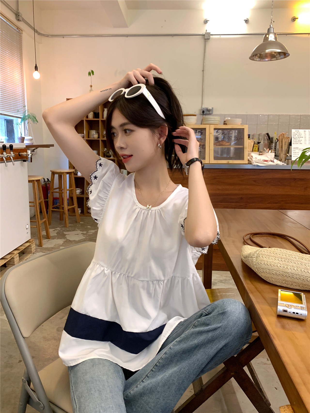 RM18198#法式甜美风衬衫女夏季飞飞袖设计感绣花拼接宽松显瘦上衣