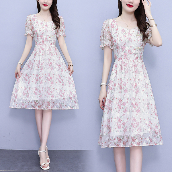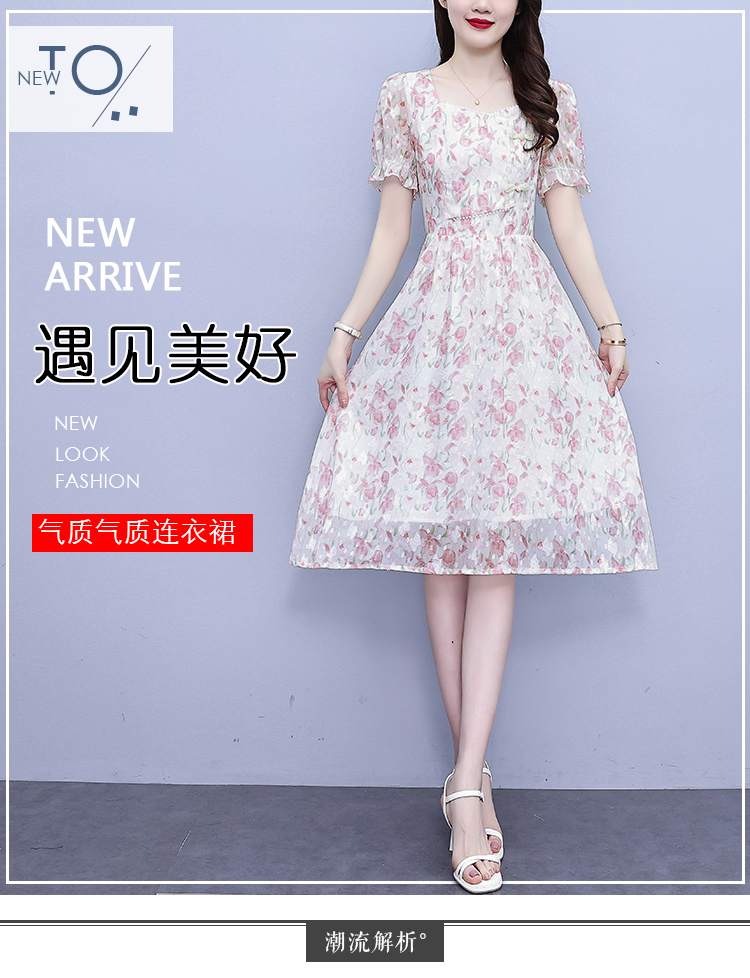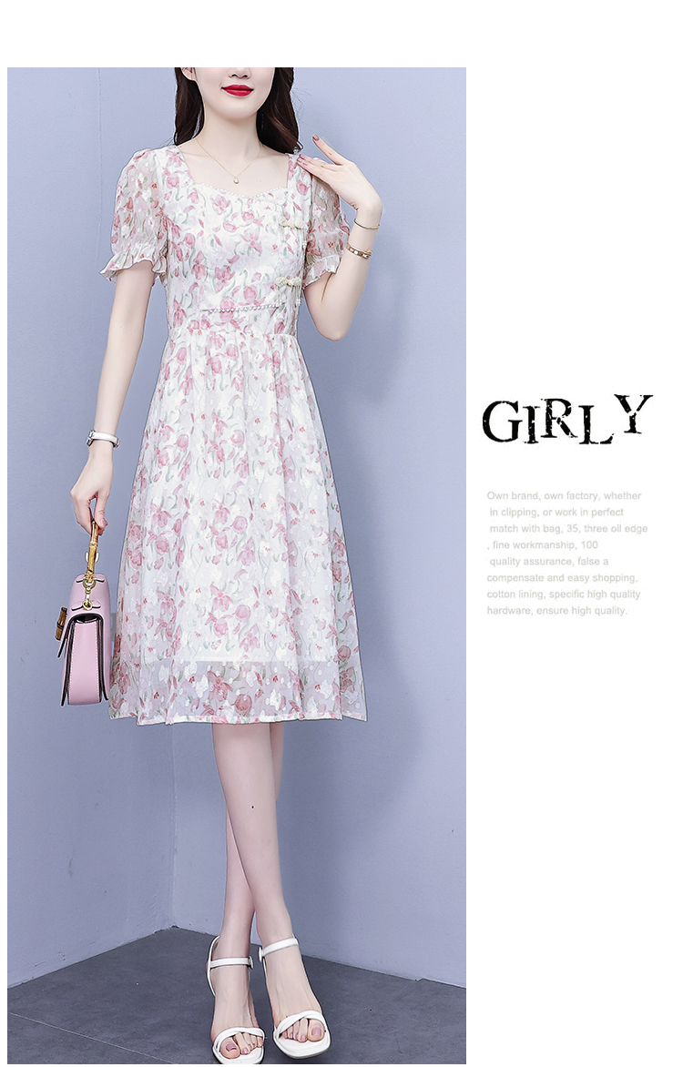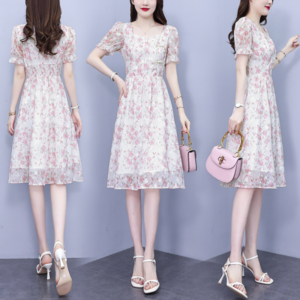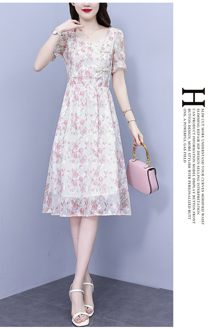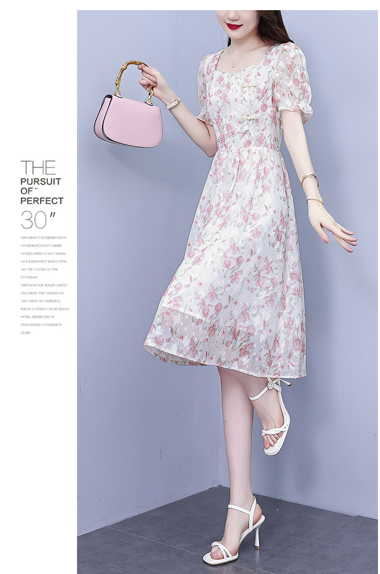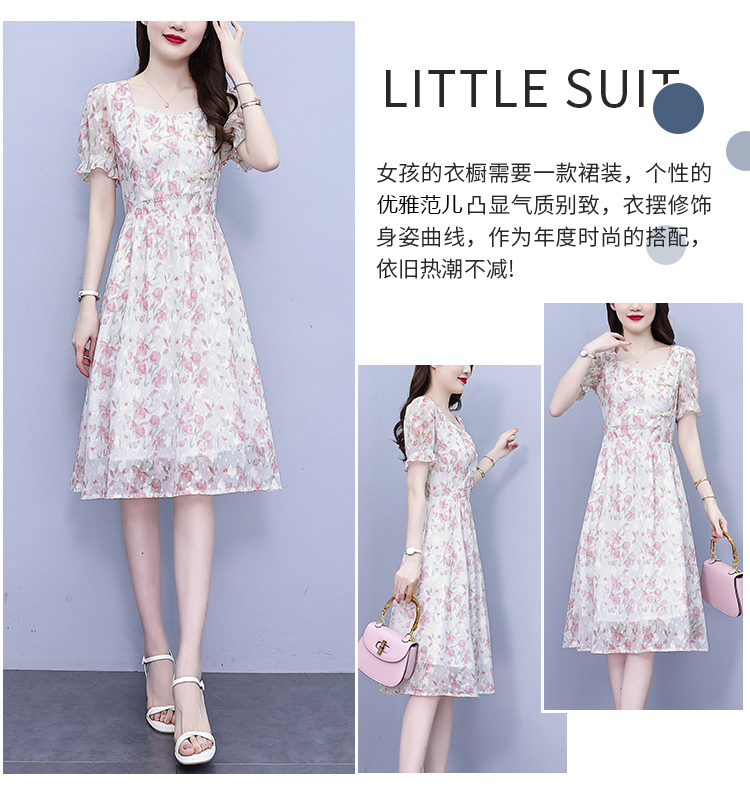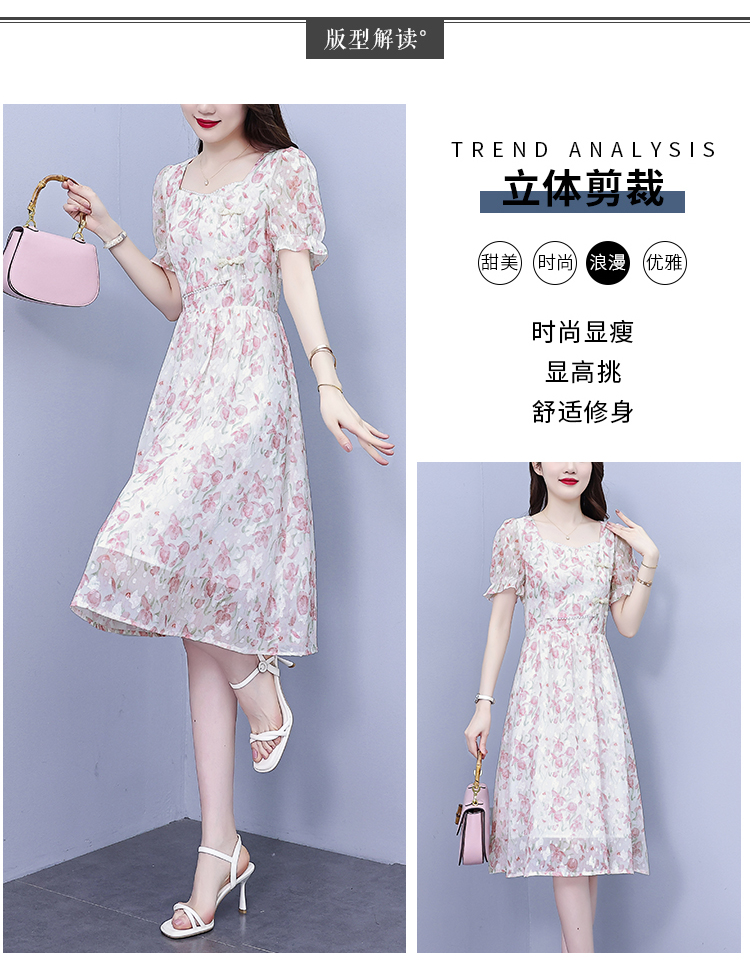 RM18220#大码女装2023年夏季新款新中式碎花雪纺显瘦度假风方领连衣裙