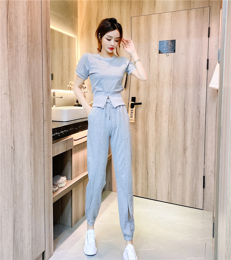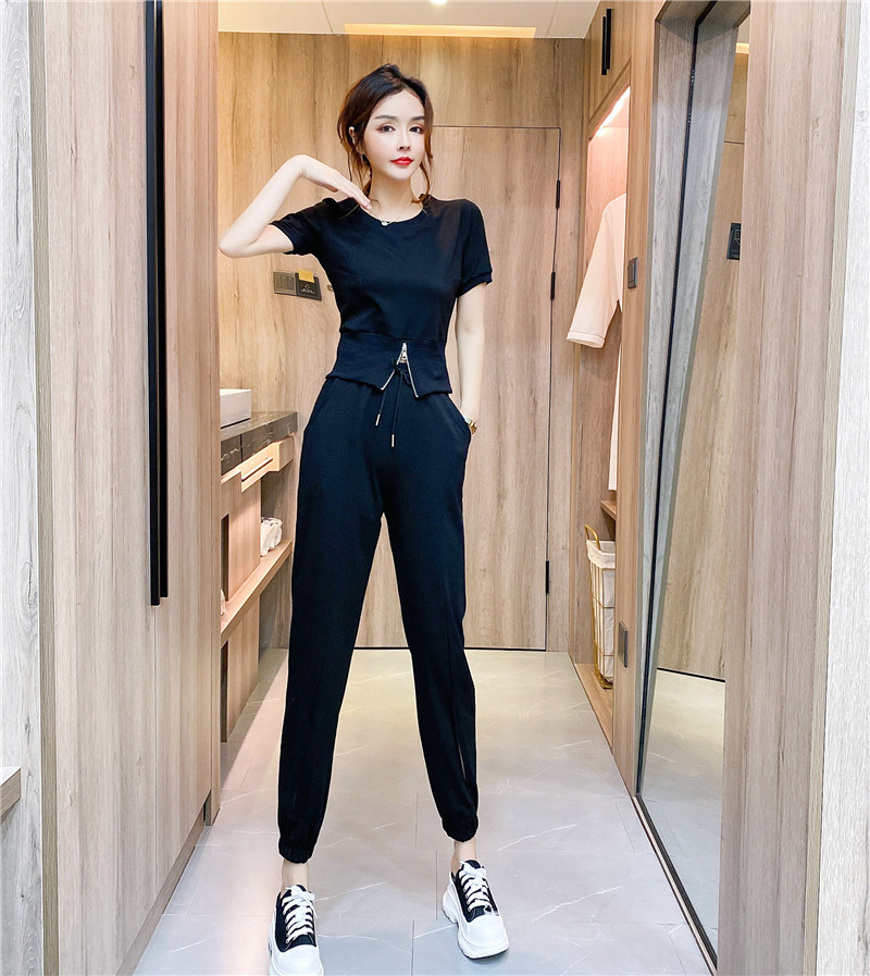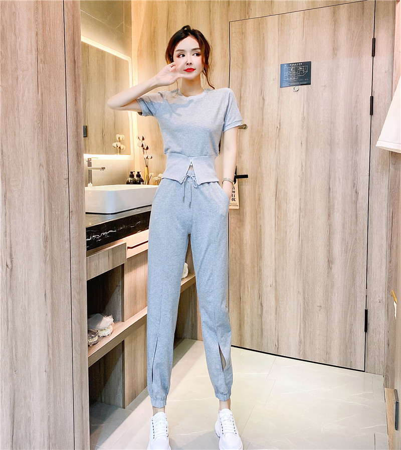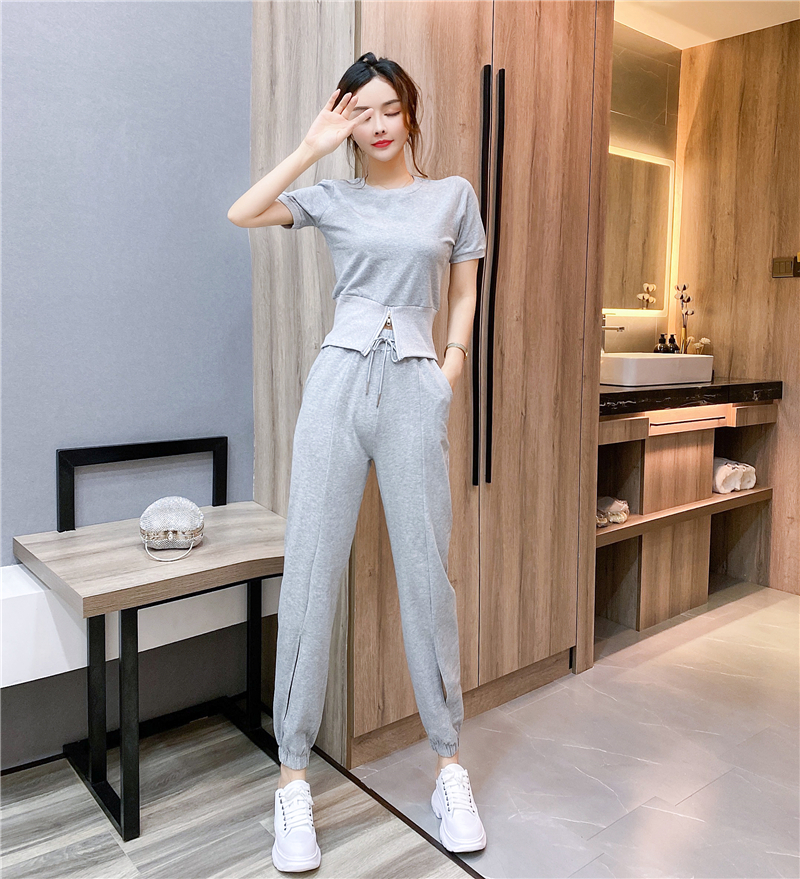 RM18232#夏季时尚网红休闲运动拉链开叉上衣镂空长裤套装