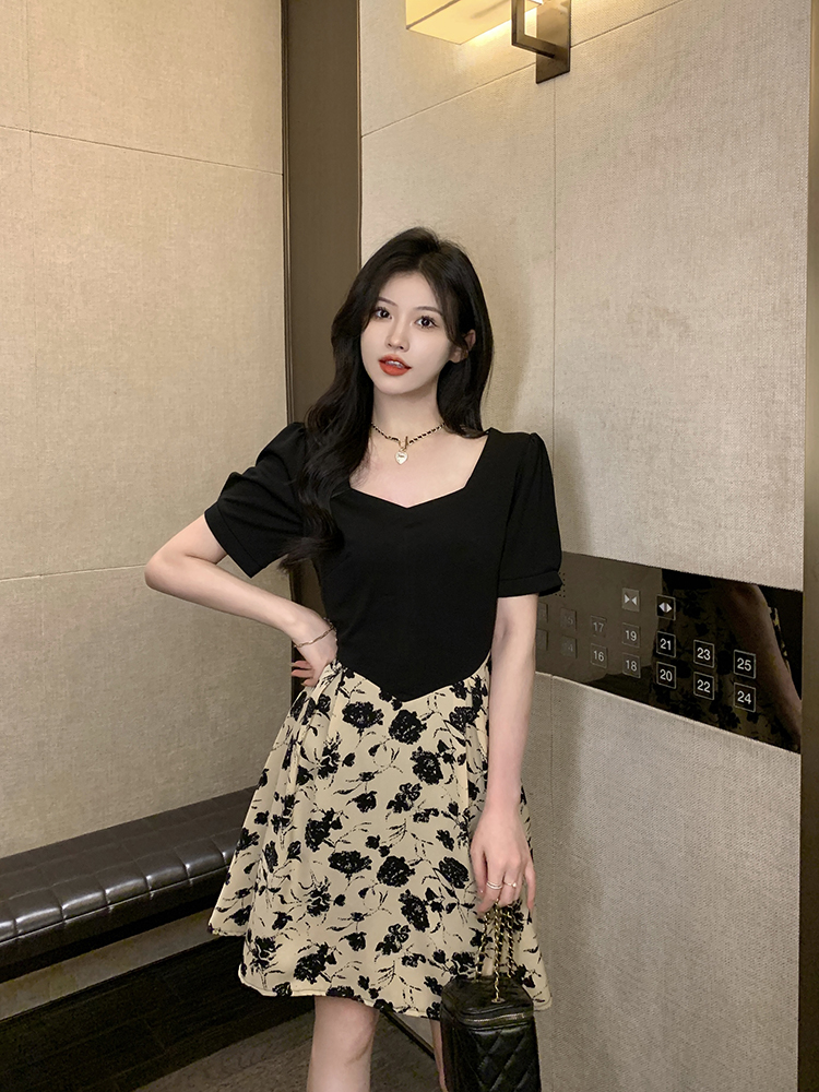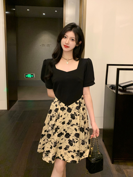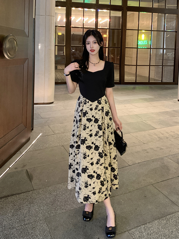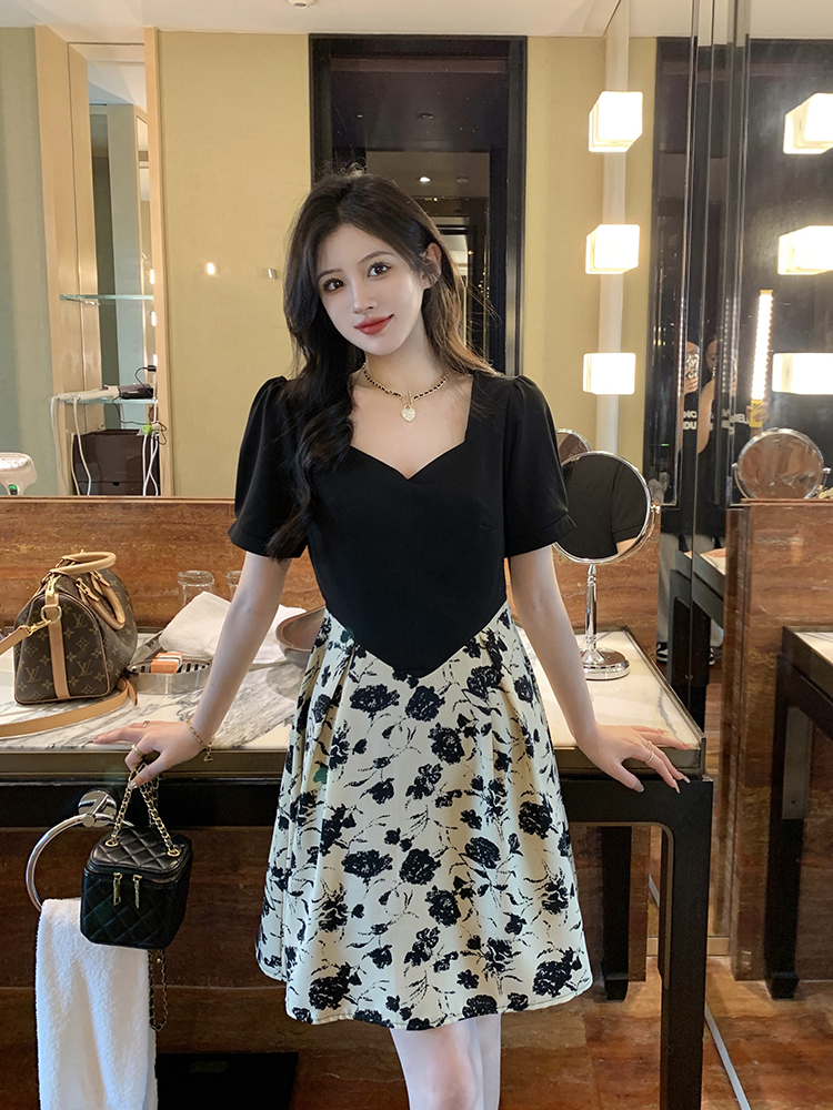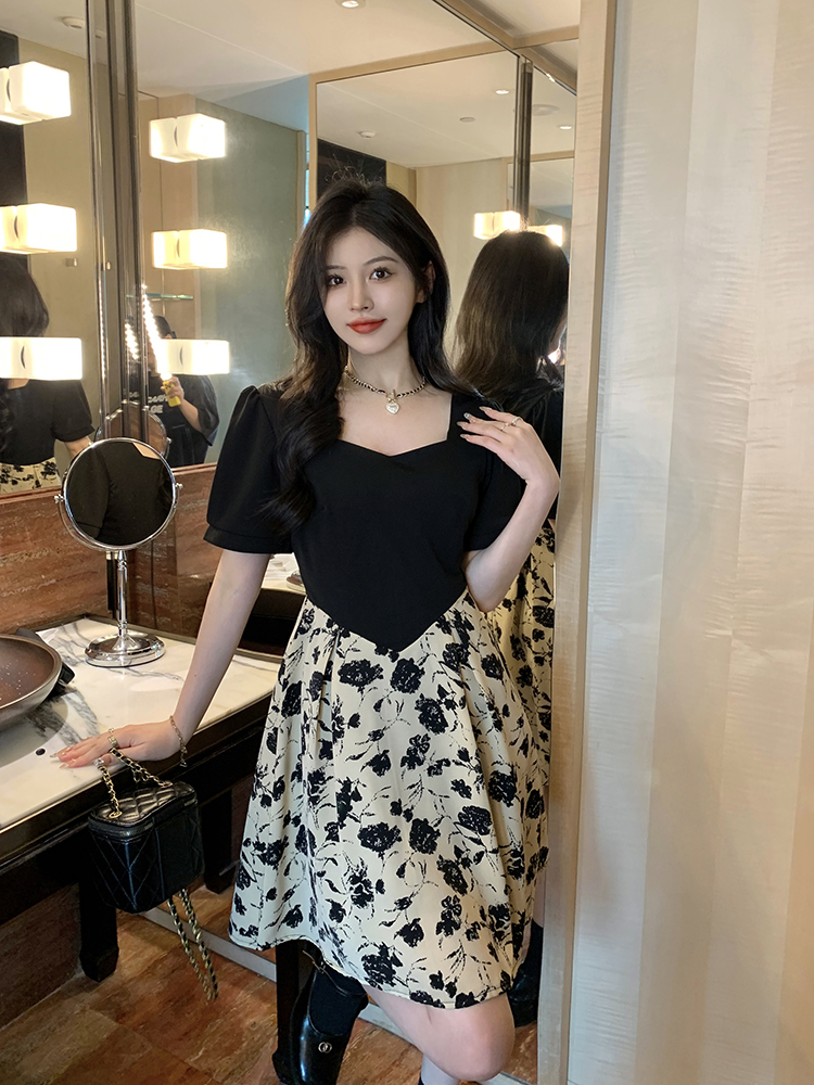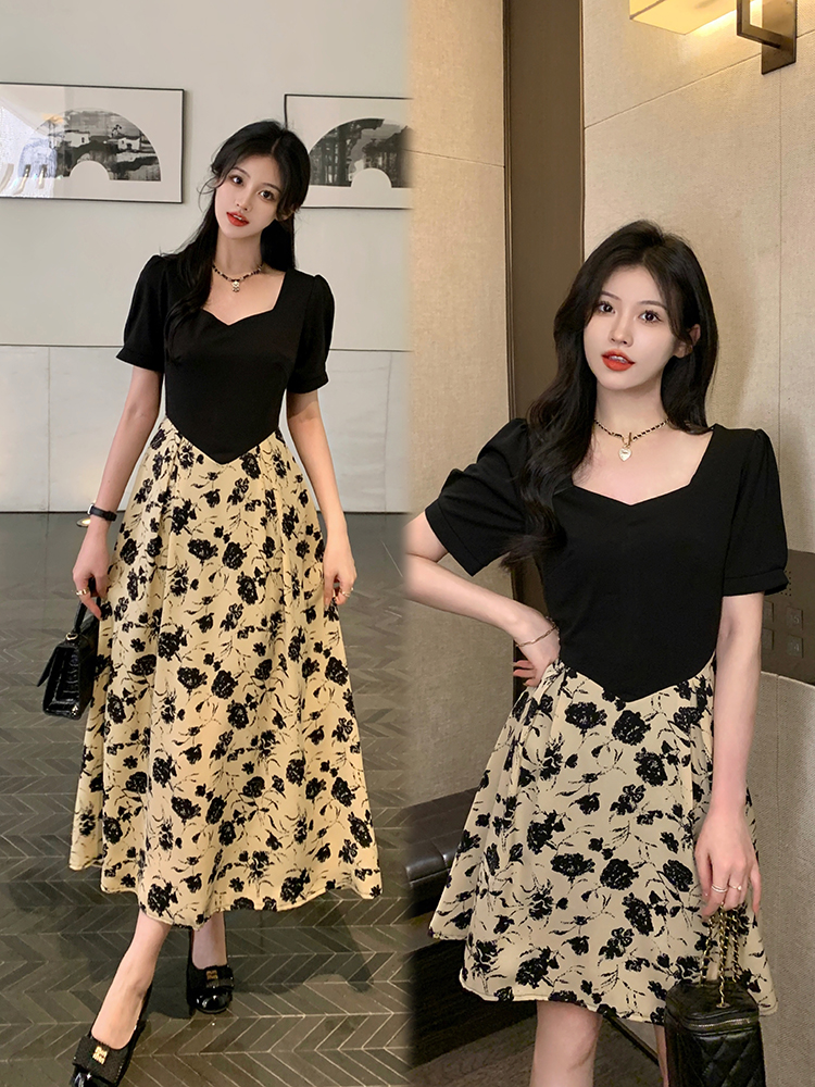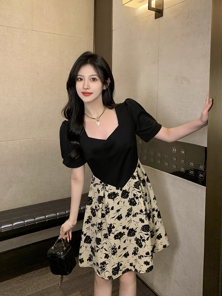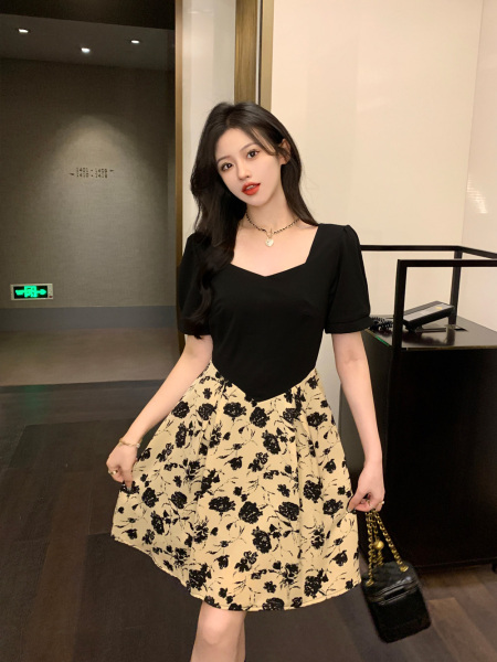 RM18236#大码女装落日夜玫 气质拼接碎花度假风连衣裙胖MM藏肉显瘦