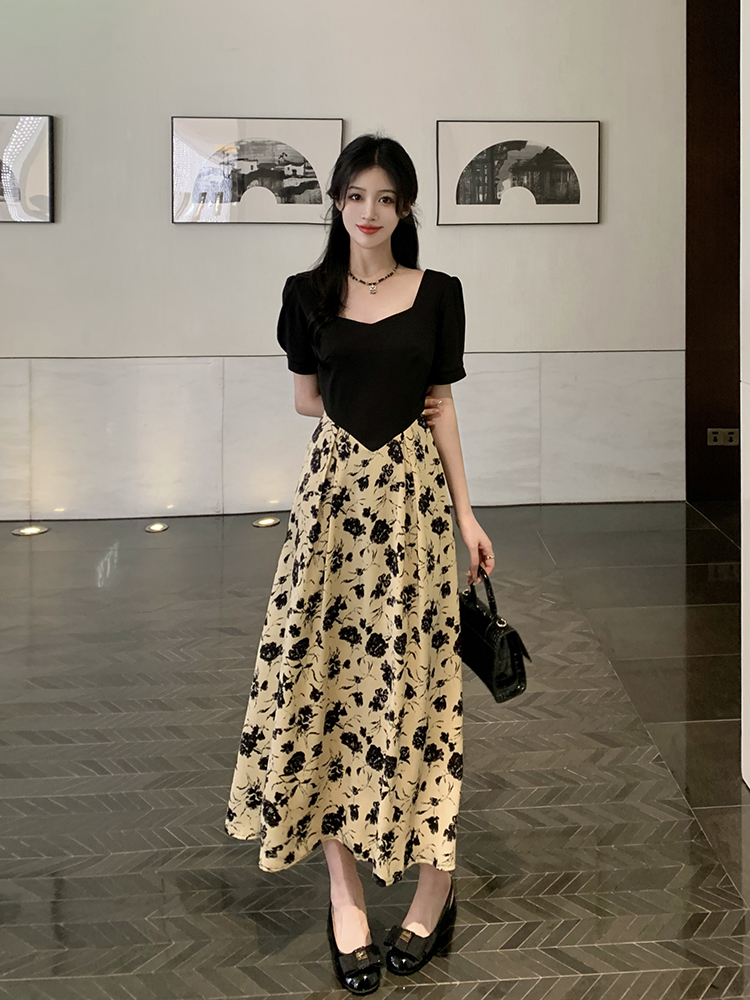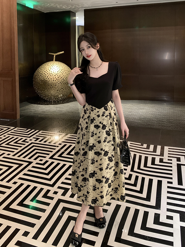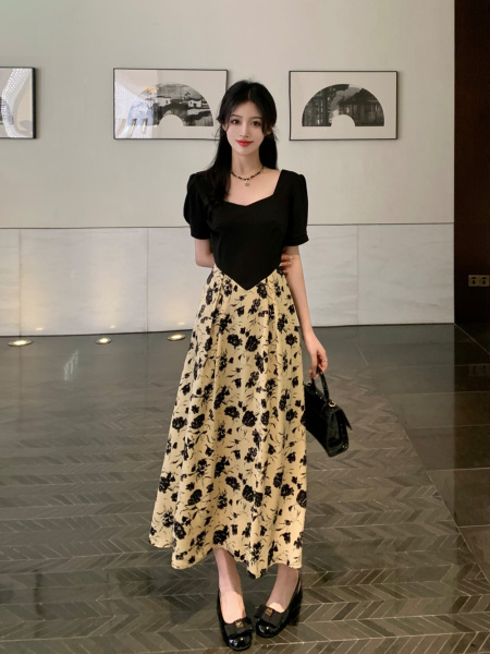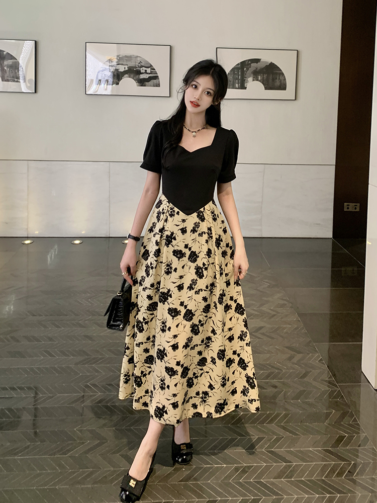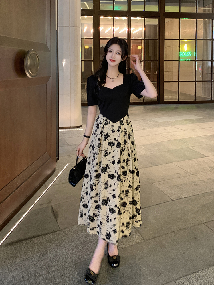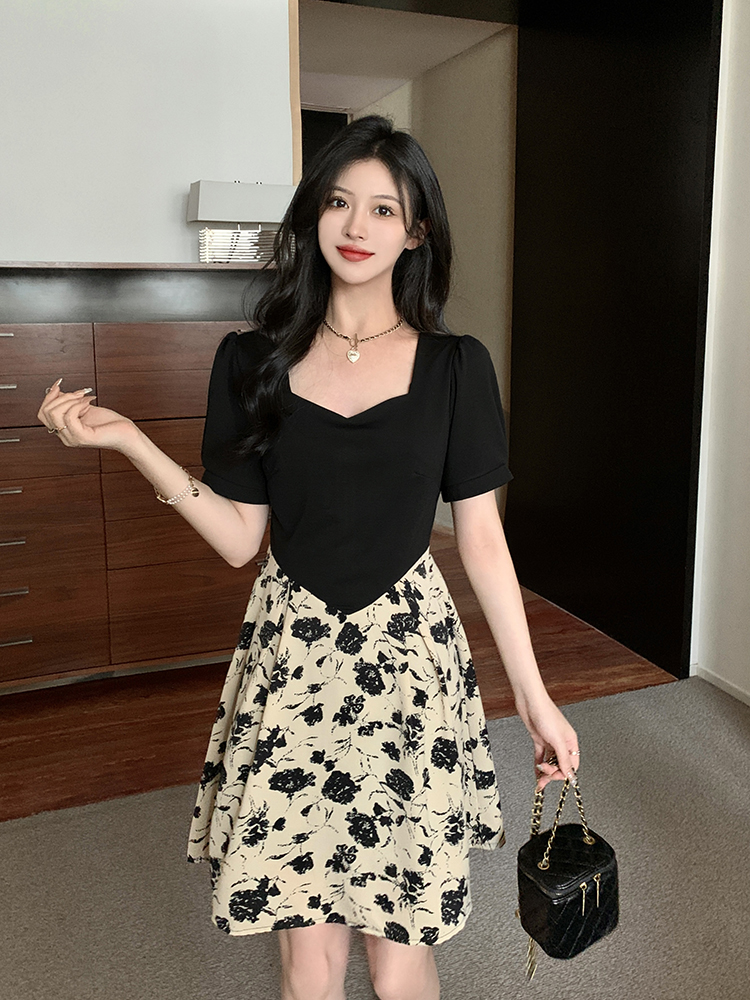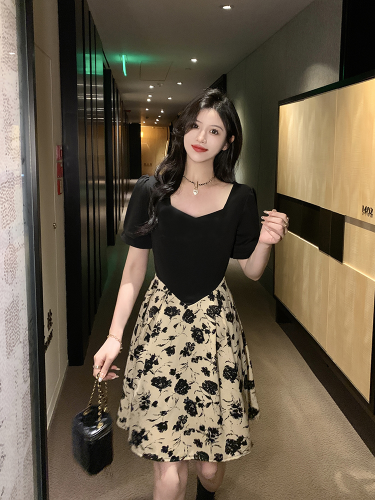 RM18236#大码女装落日夜玫 气质拼接碎花度假风连衣裙胖MM藏肉显瘦