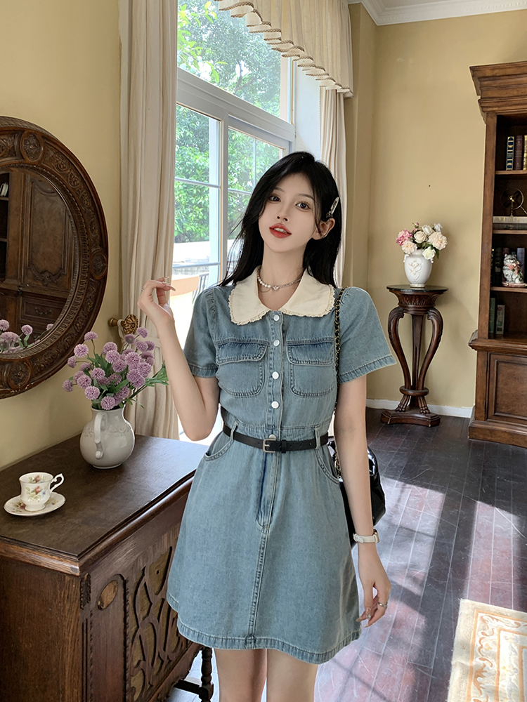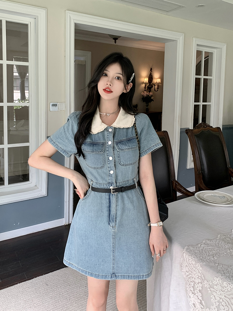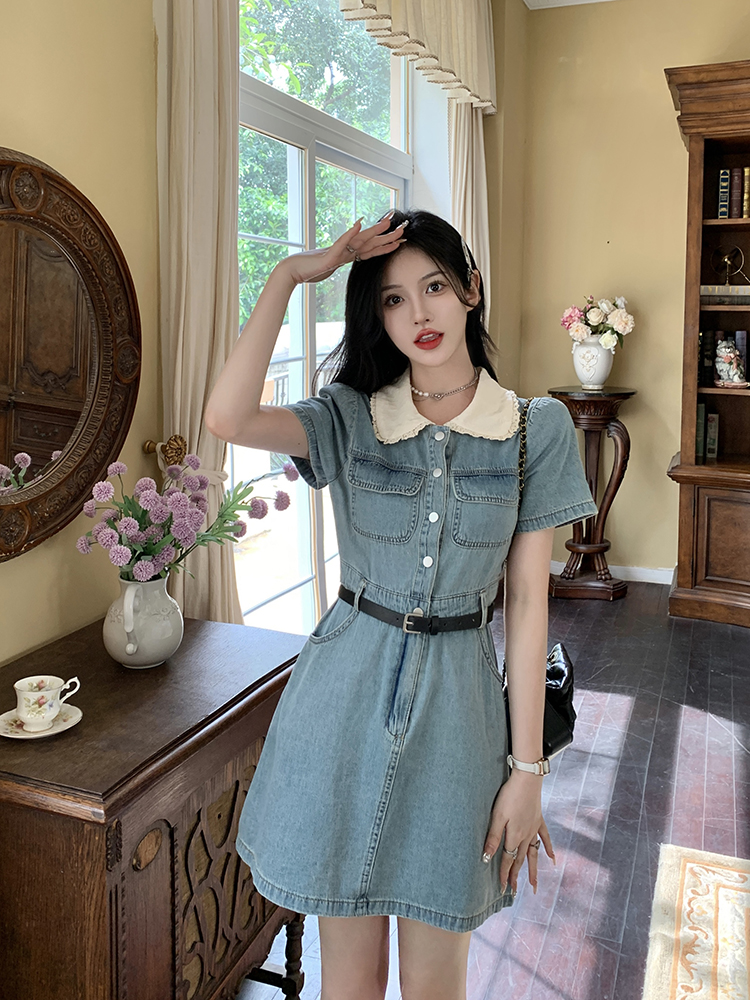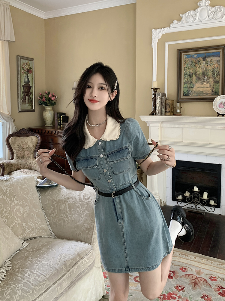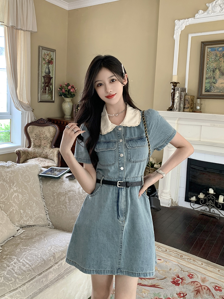 RM18238#大码女装娃娃领牛仔裙胖MM夏季复古法式气质收腰少女连衣裙