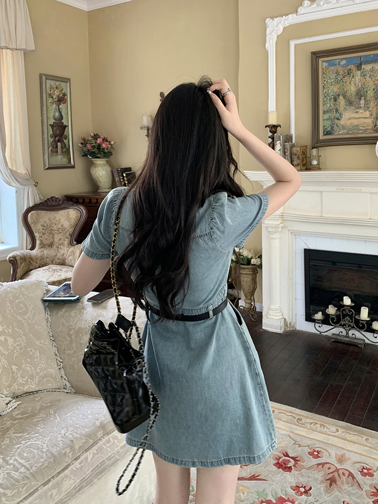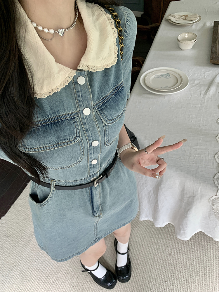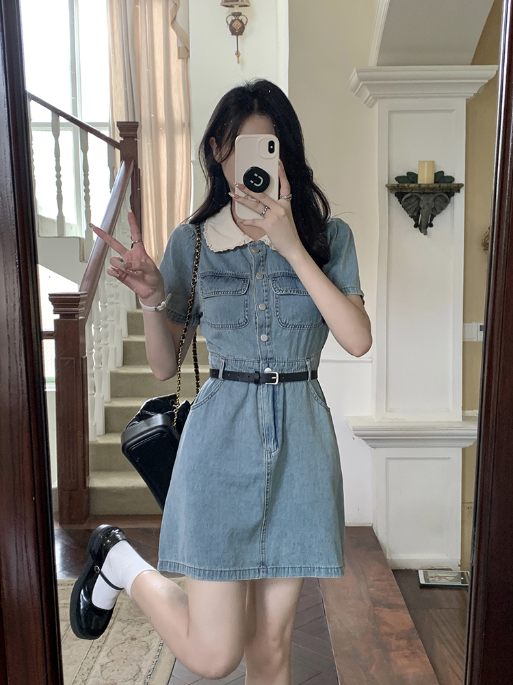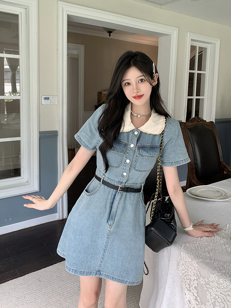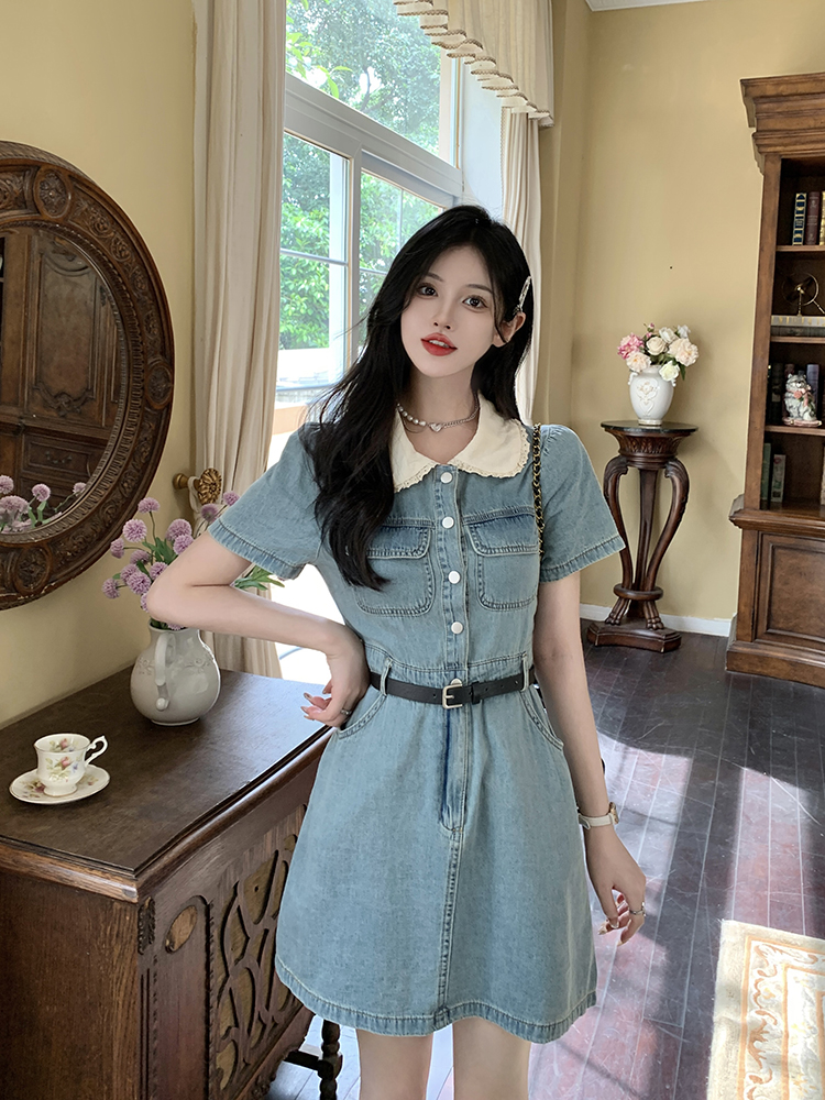RM18238#大码女装娃娃领牛仔裙胖MM夏季复古法式气质收腰少女连衣裙