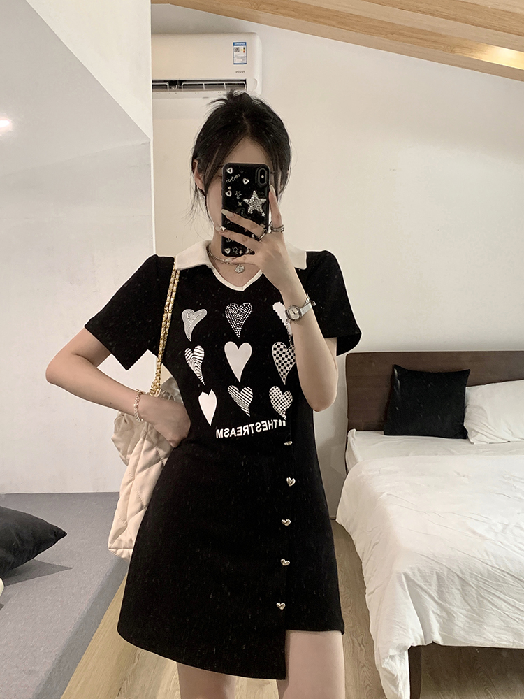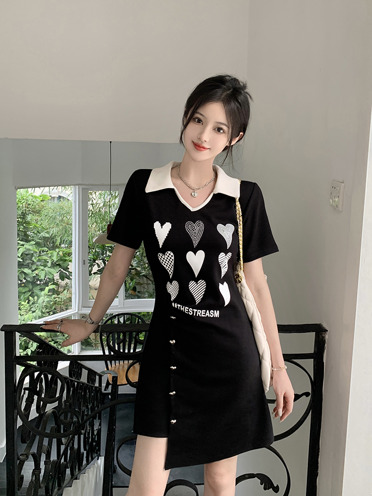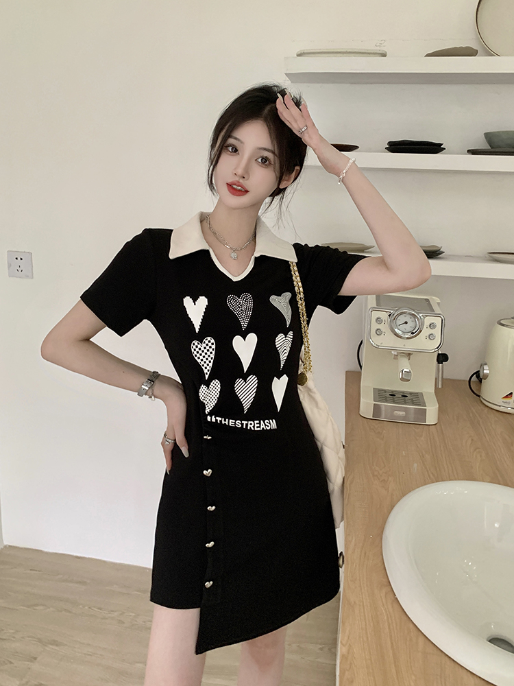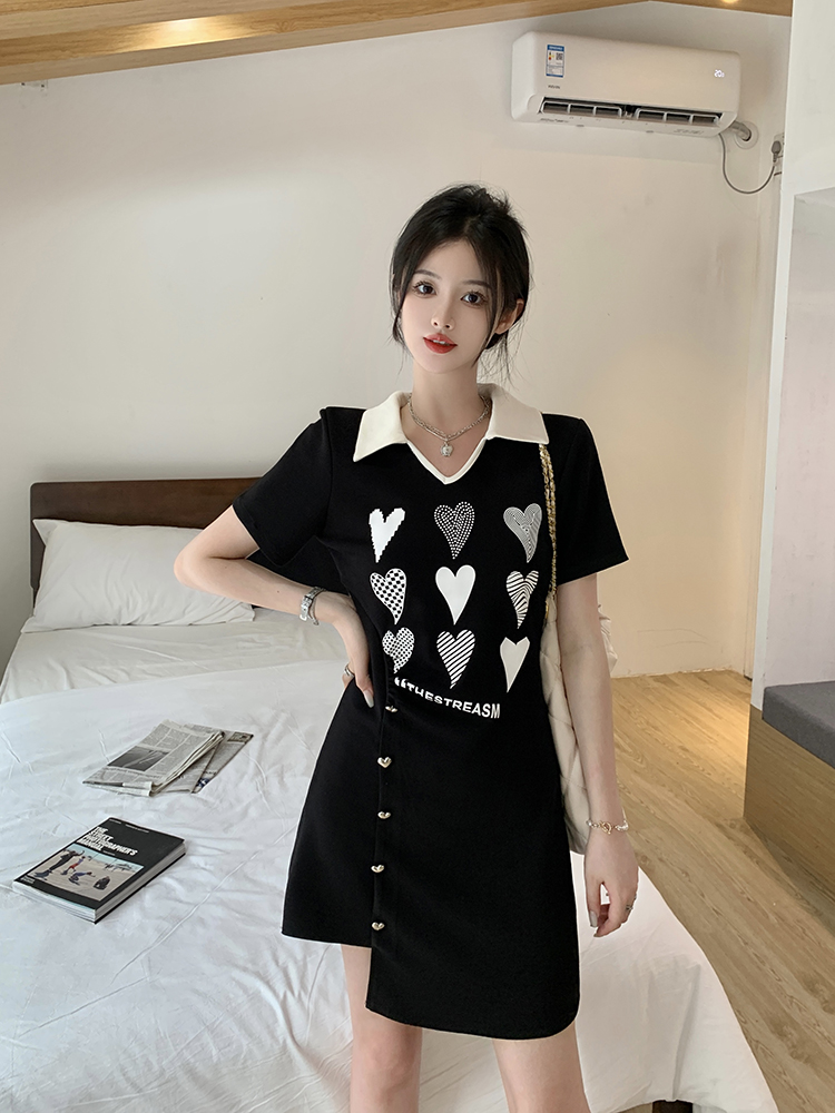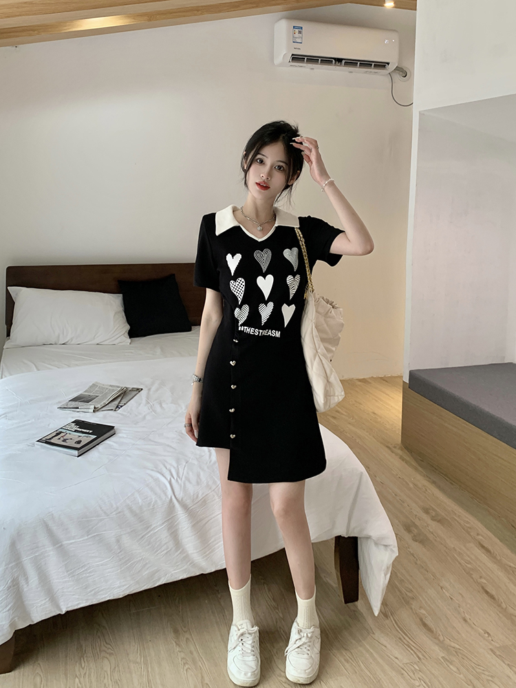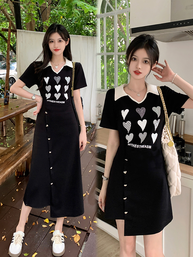 RM18245#大码女装新款胖妹翻领拼色气质爱心重工收腰显瘦连衣裙