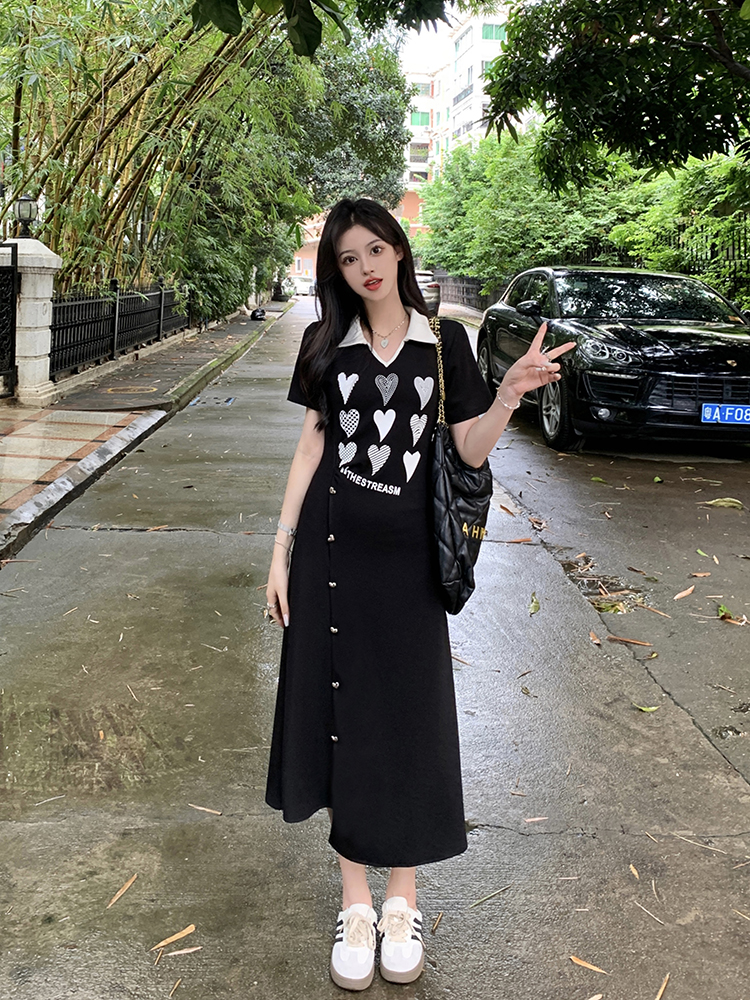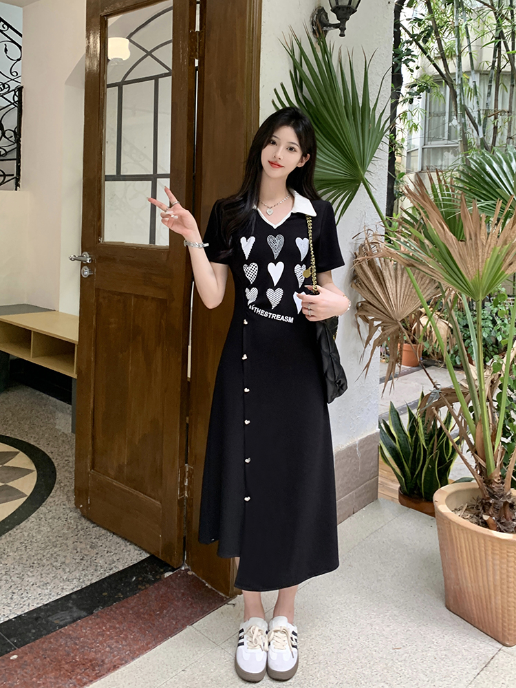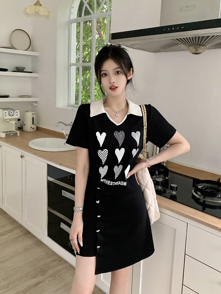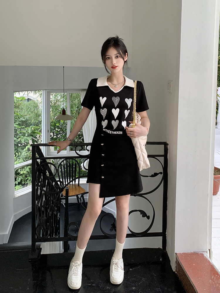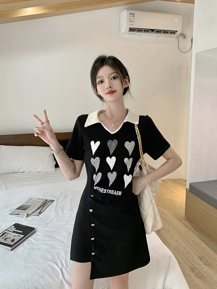 RM18245#大码女装新款胖妹翻领拼色气质爱心重工收腰显瘦连衣裙