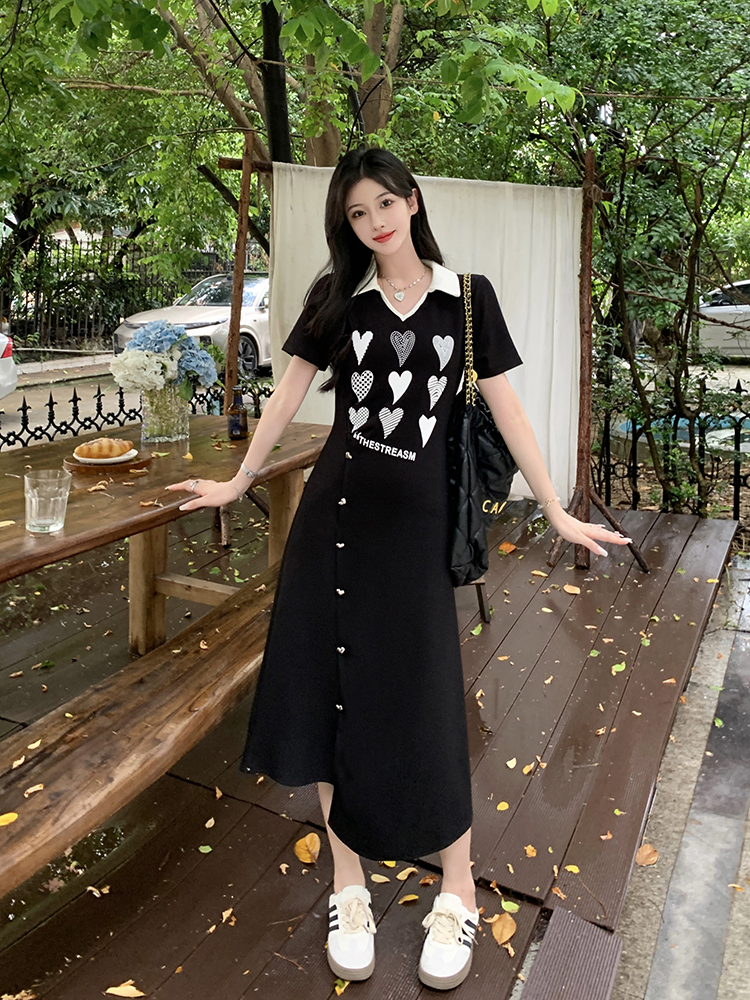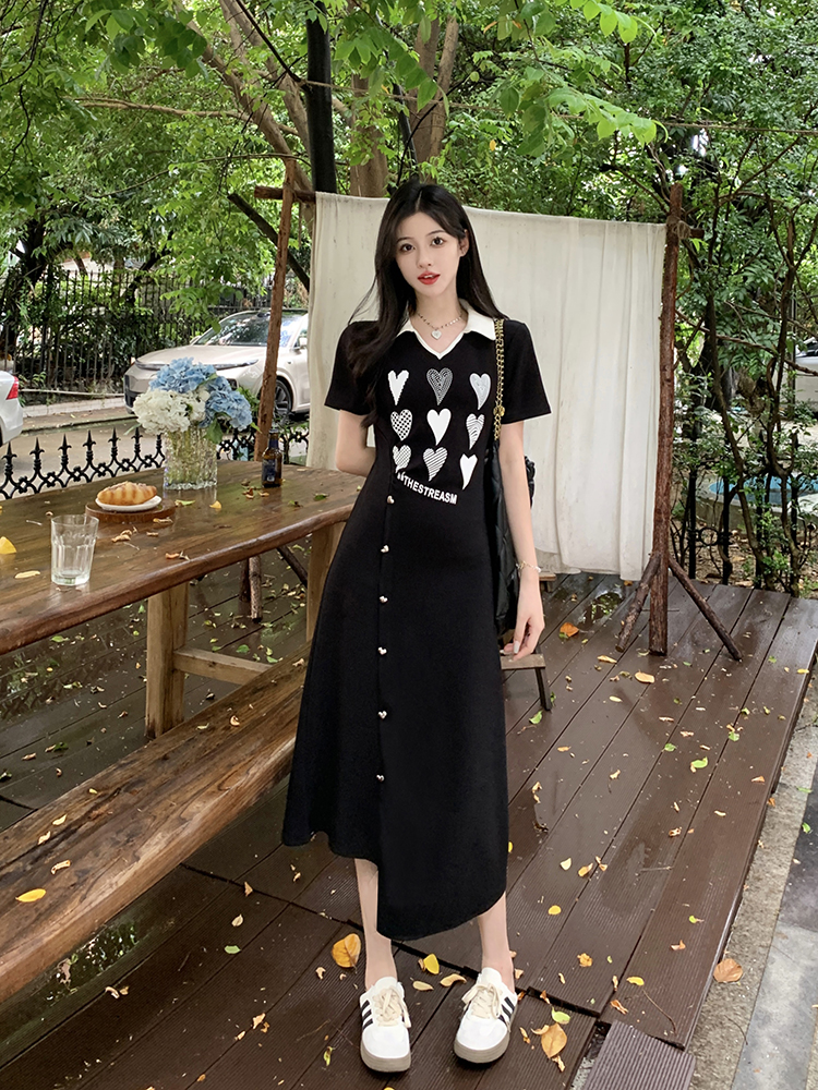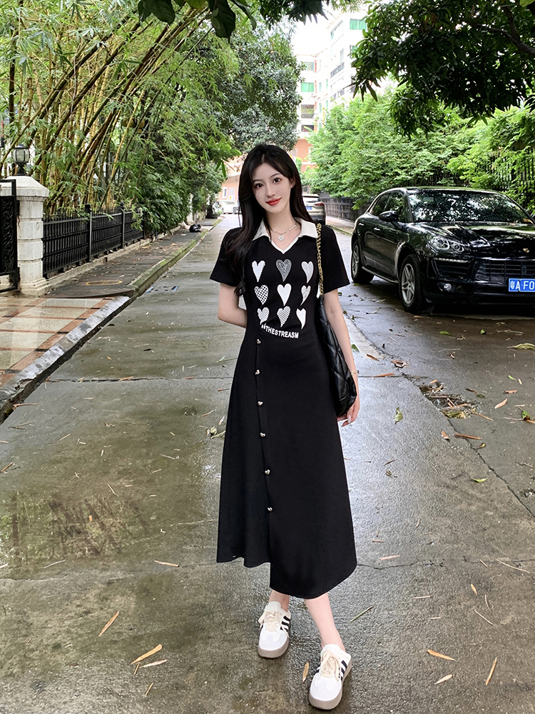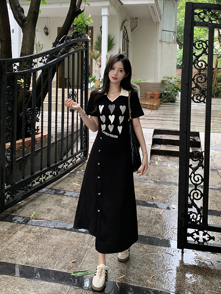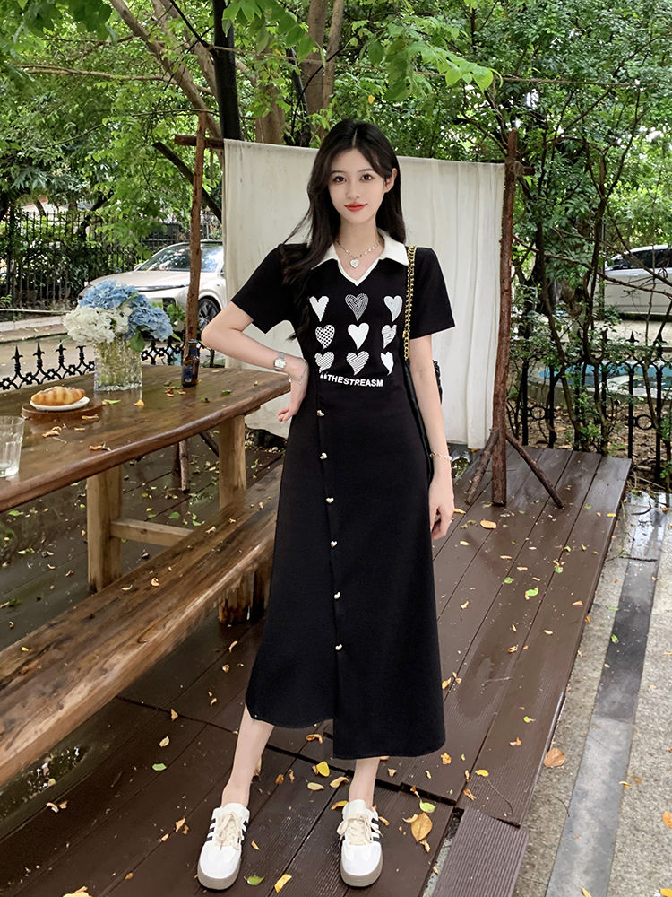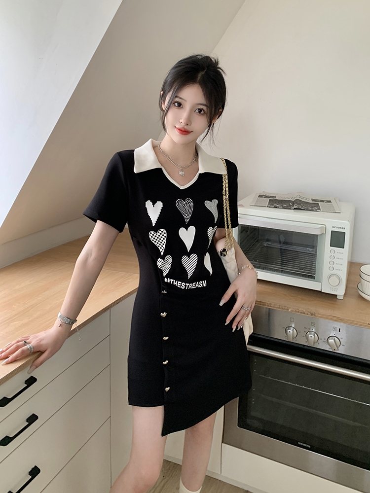 RM18245#大码女装新款胖妹翻领拼色气质爱心重工收腰显瘦连衣裙