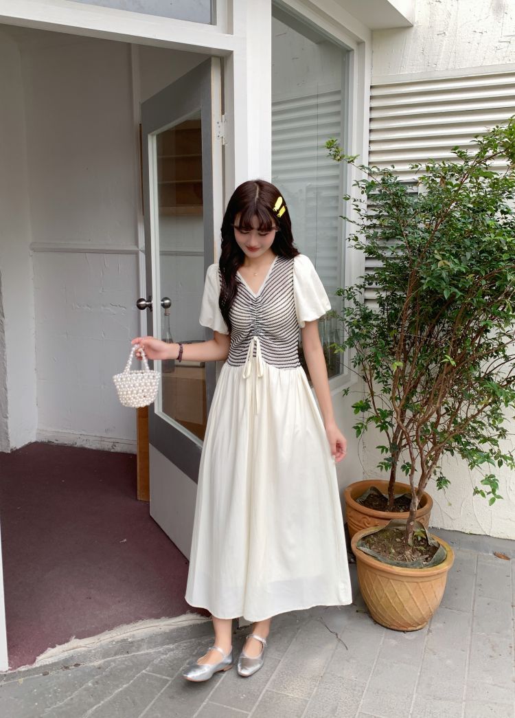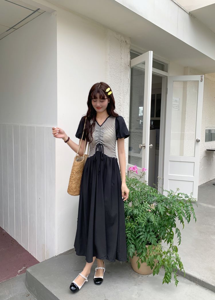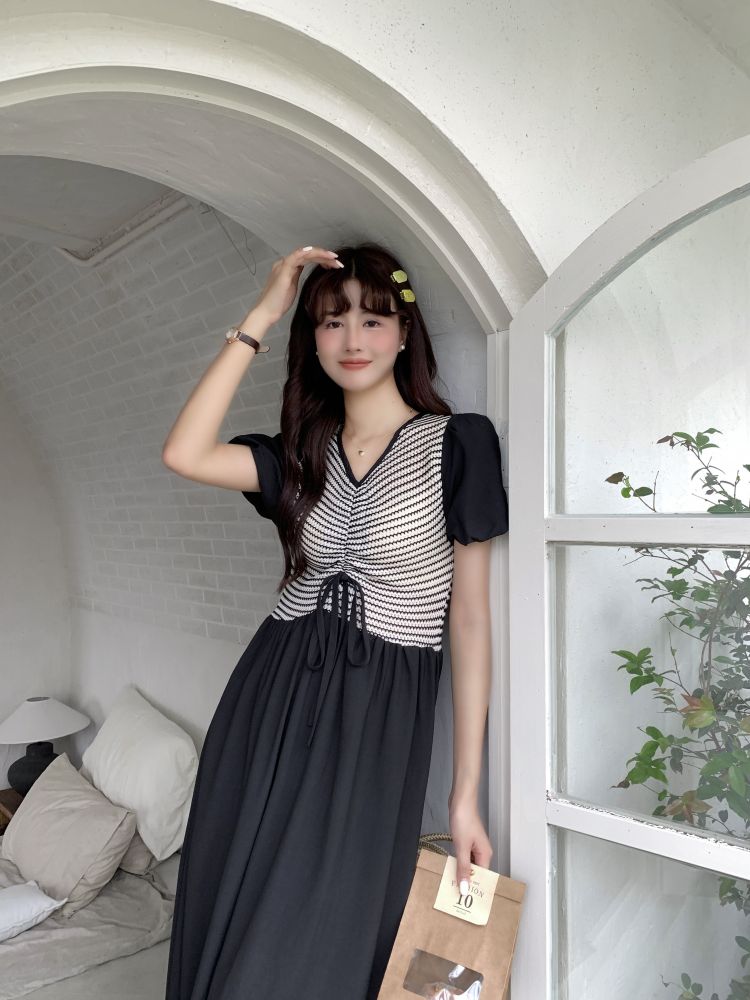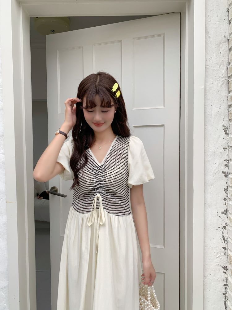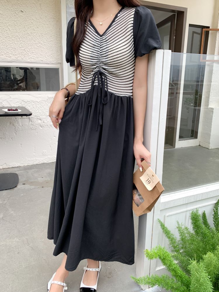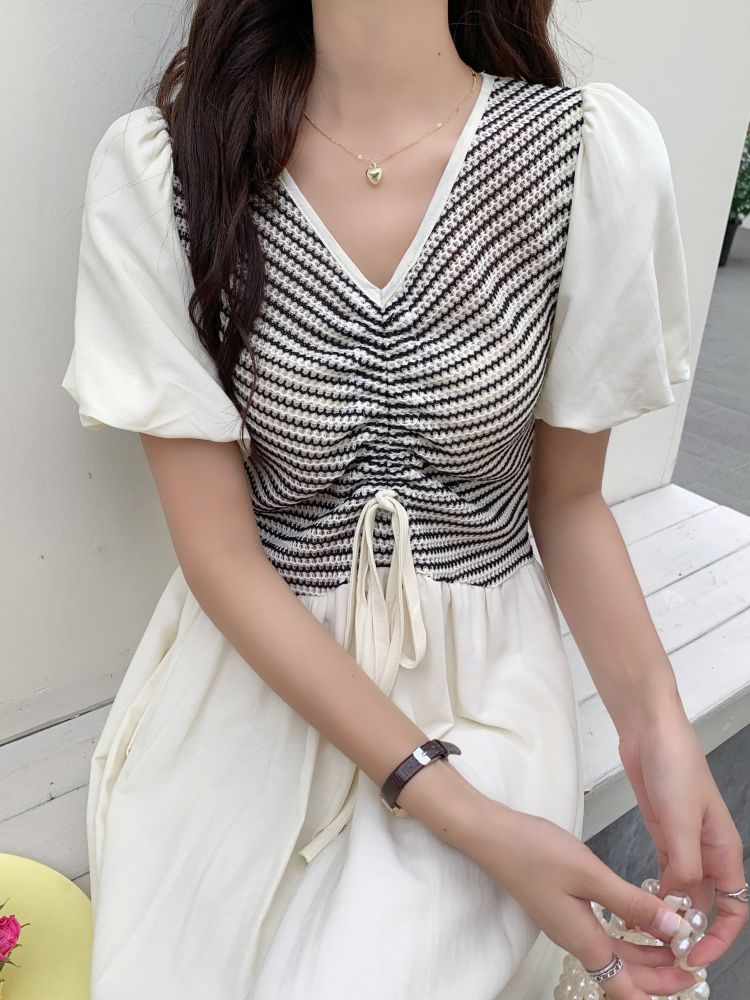RM18252#设计感条纹拼接假两件连衣裙女法式复古中长款连衣裙子