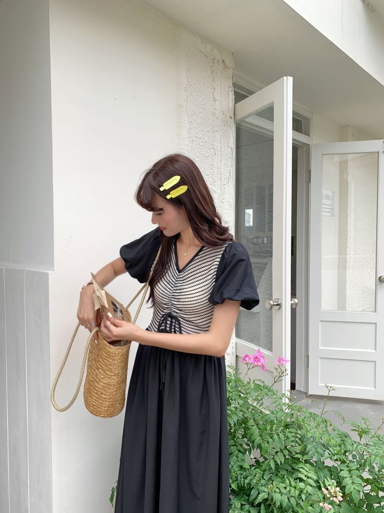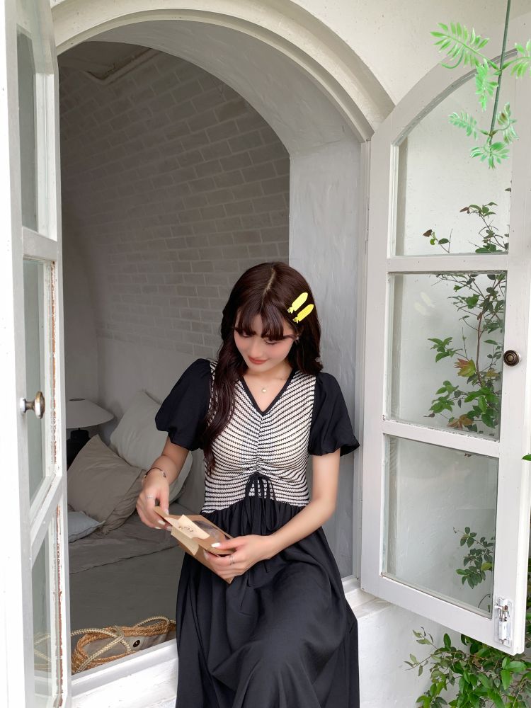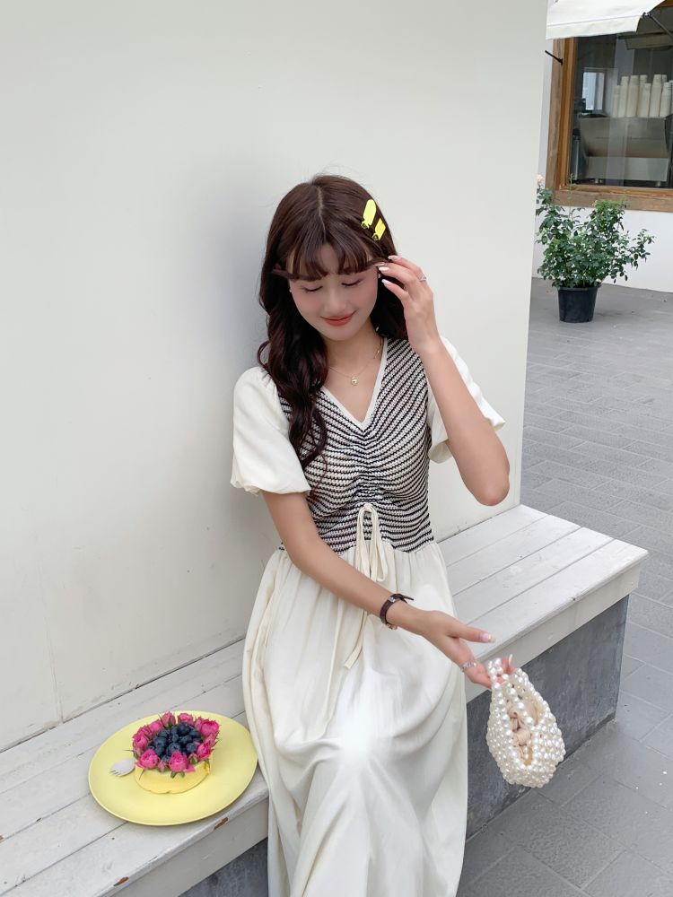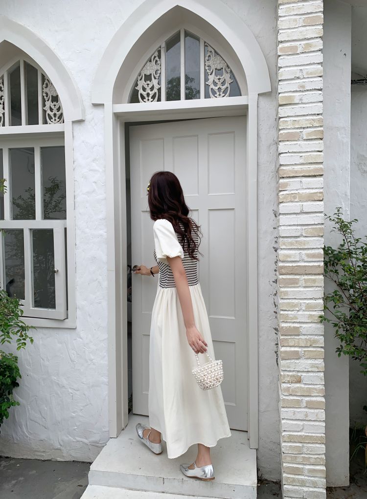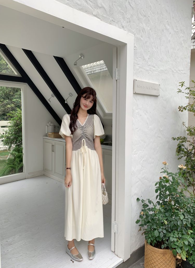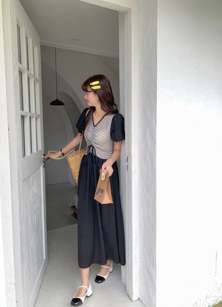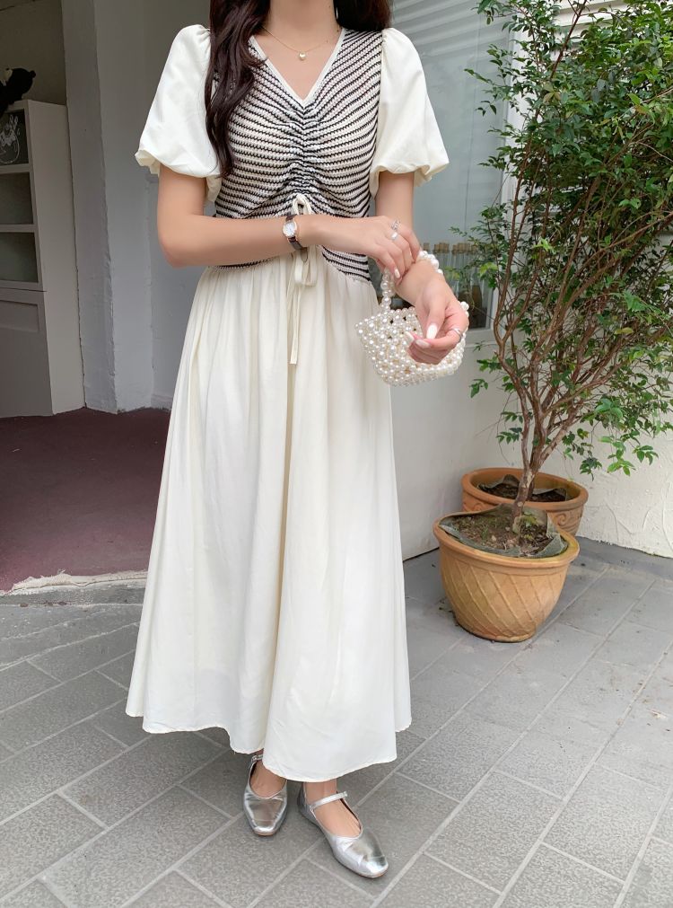 RM18252#设计感条纹拼接假两件连衣裙女法式复古中长款连衣裙子