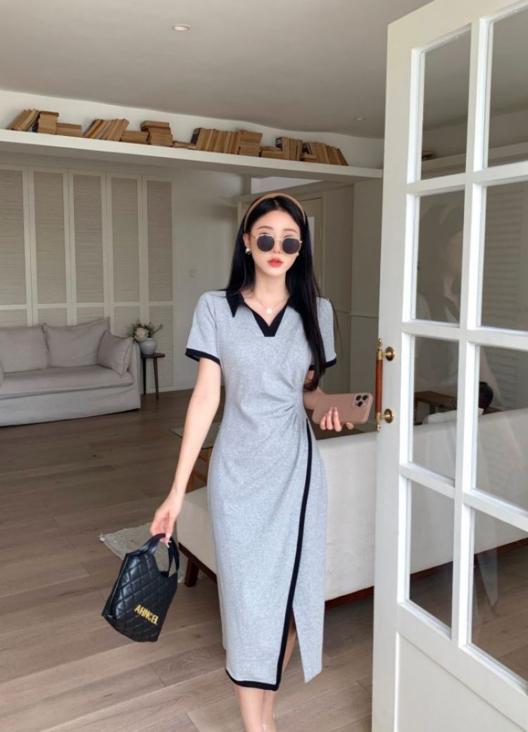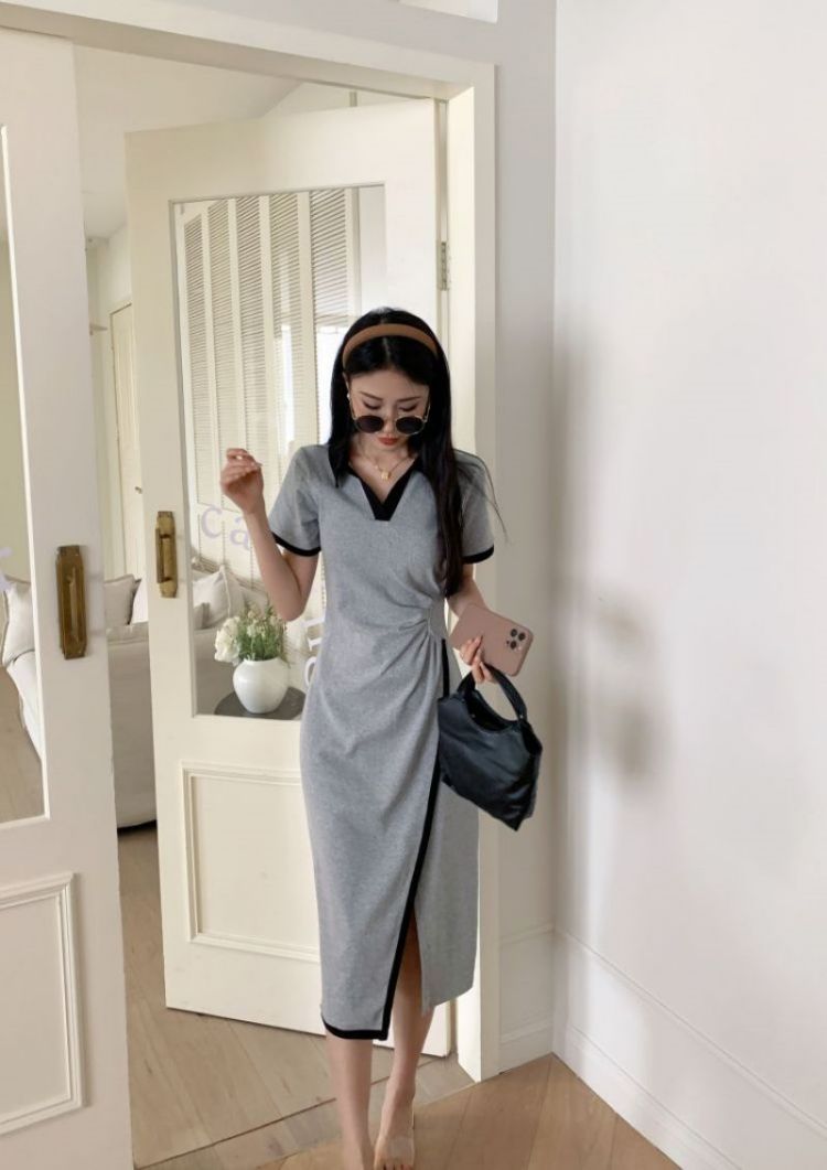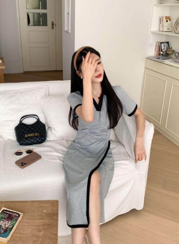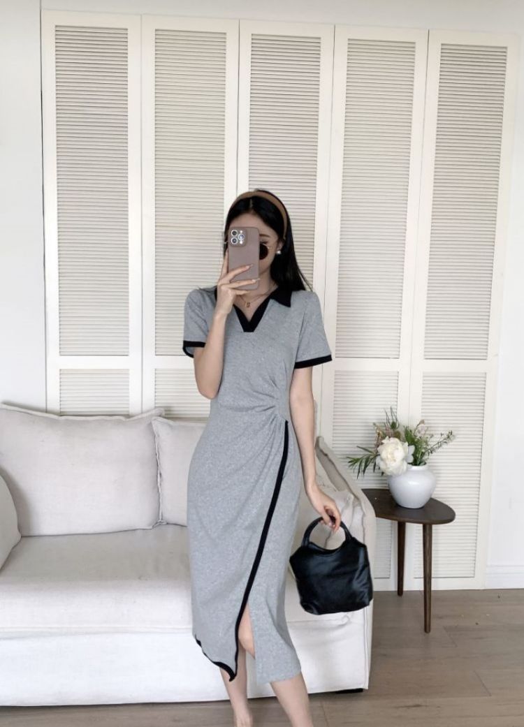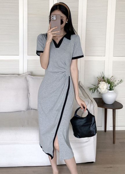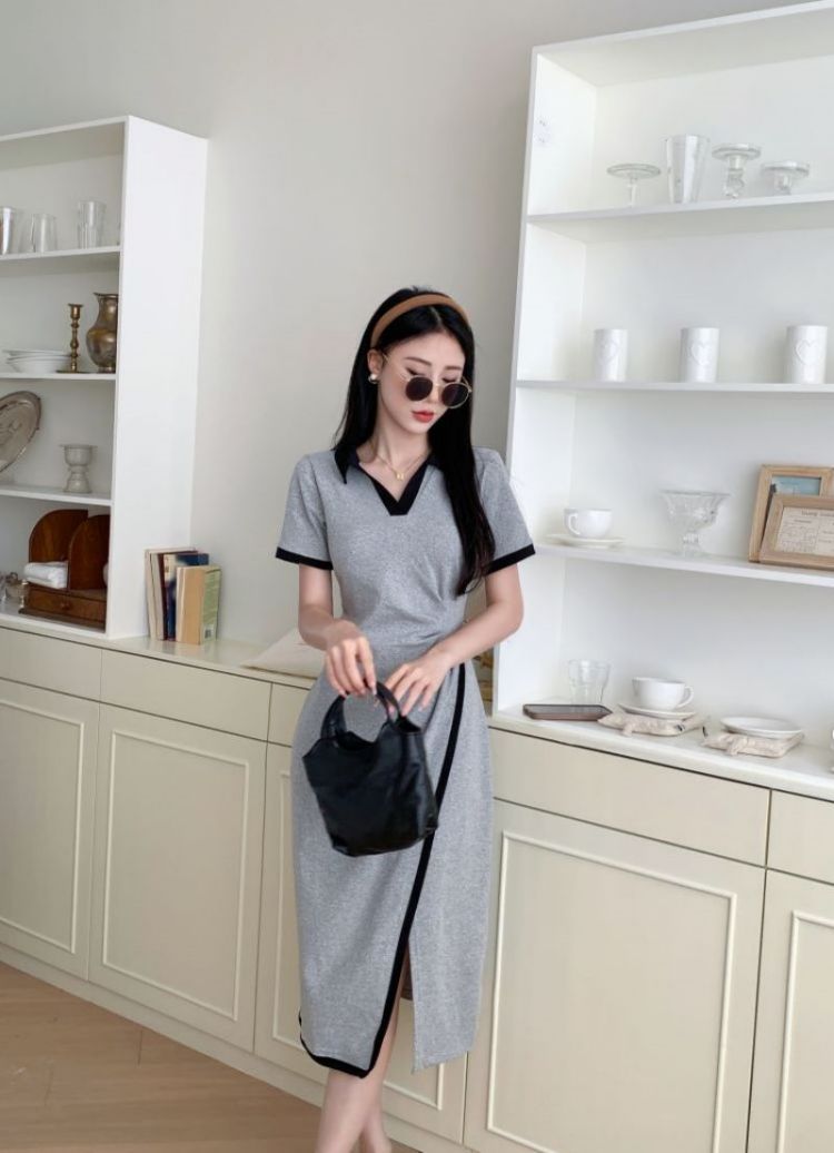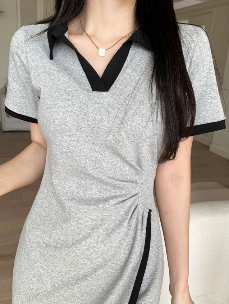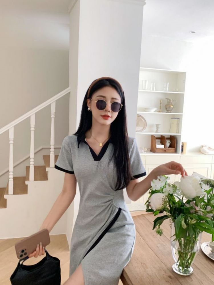 RM18258#不规则连衣裙女夏季新款中长款撞色V领开叉polo裙显瘦灰色T恤裙
