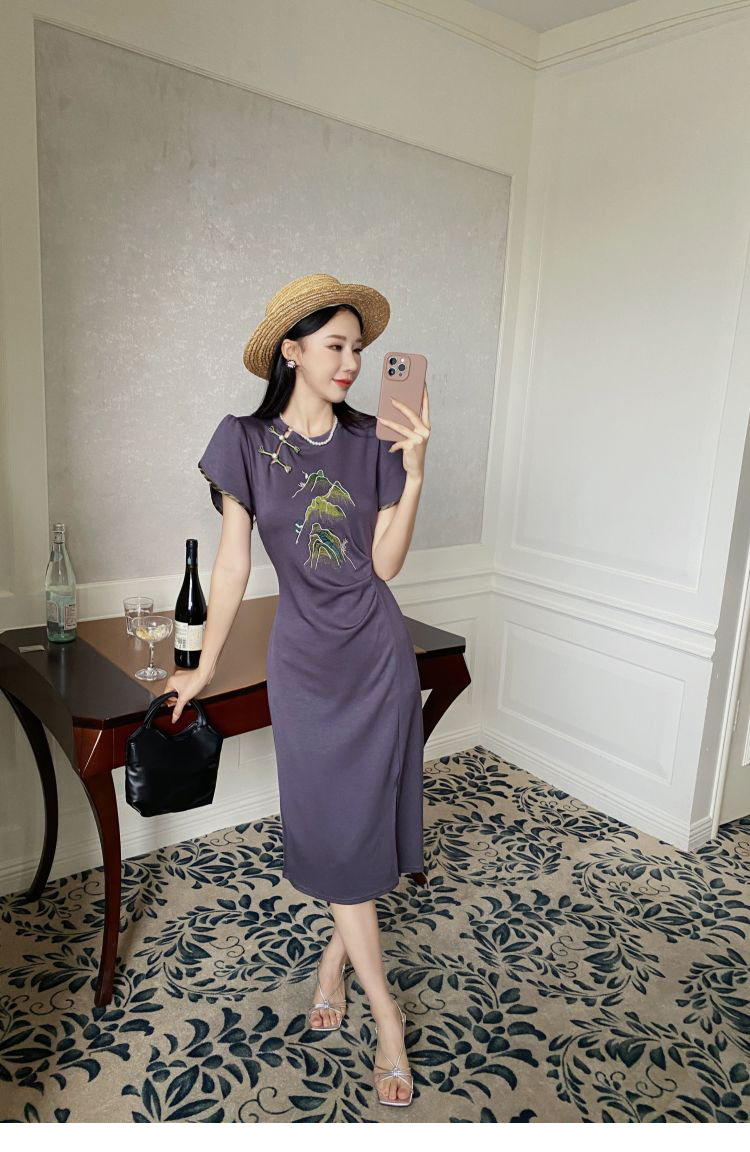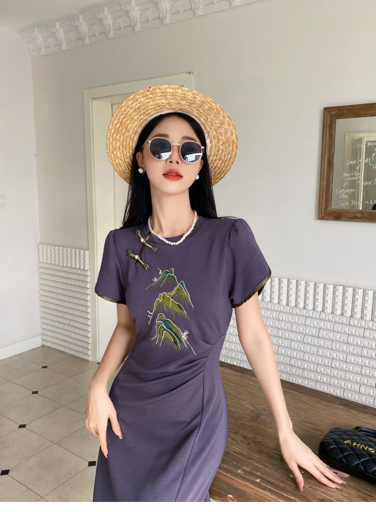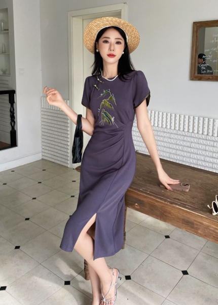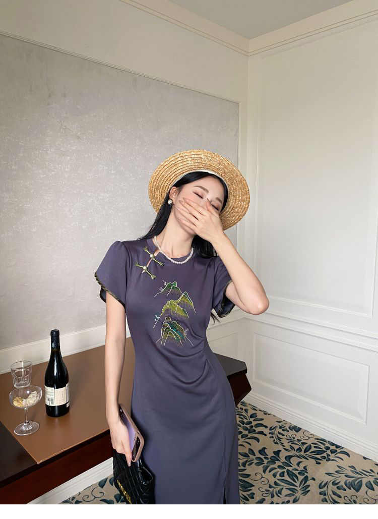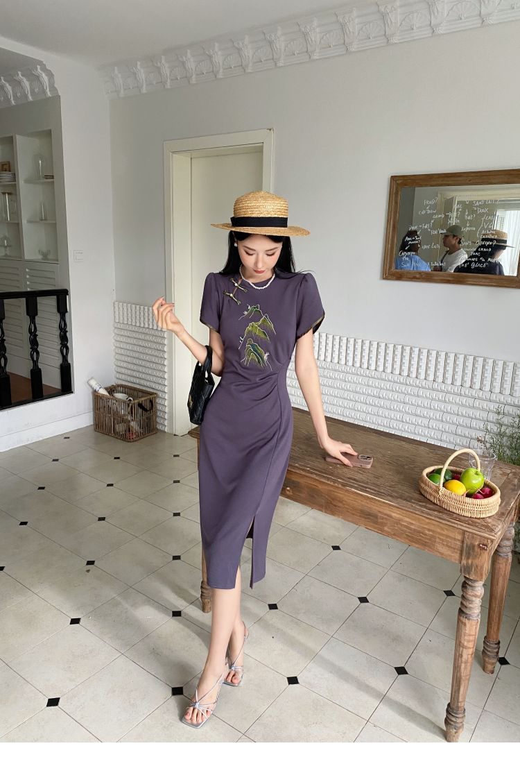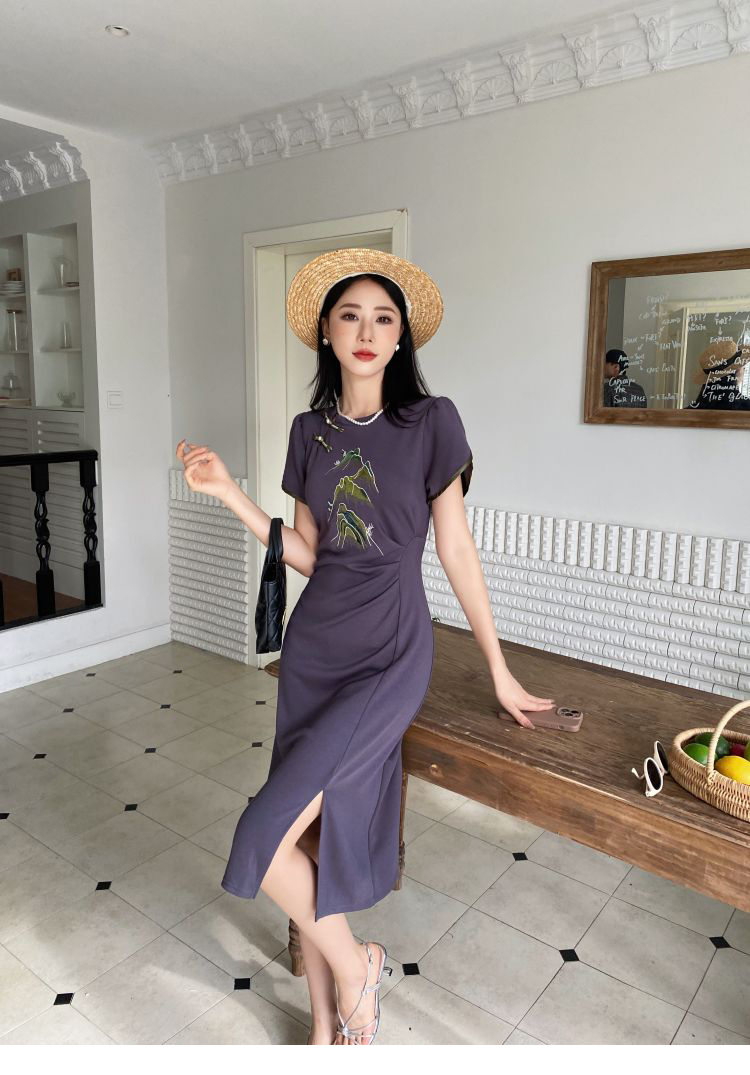 RM18268#高级轻奢气质复古褶皱收腰开叉裙女设计感国风刺绣盘扣连衣裙