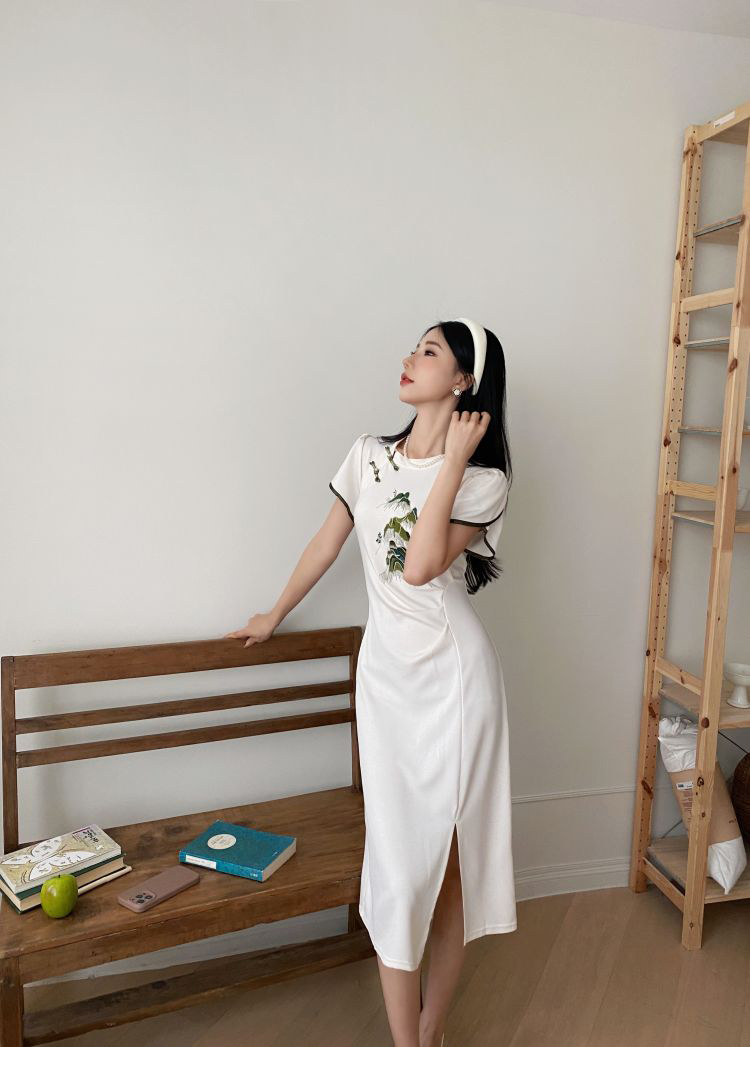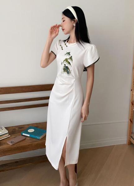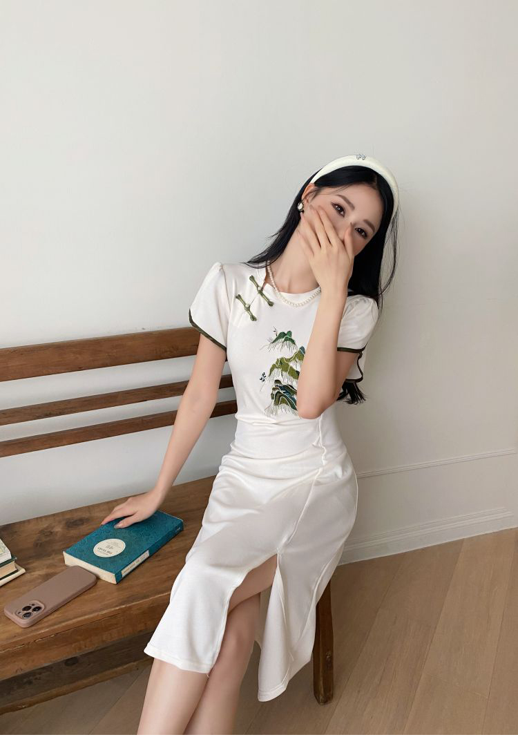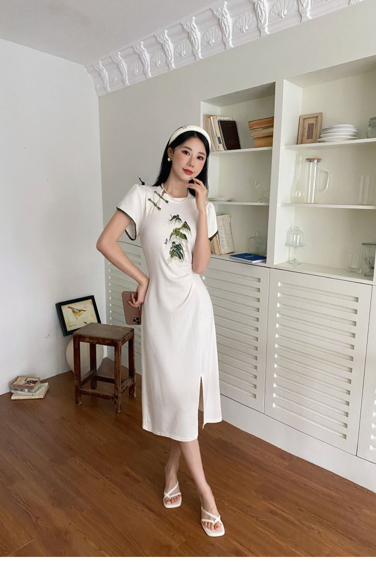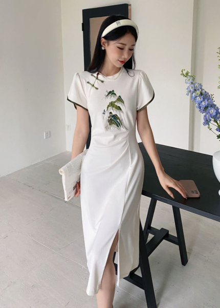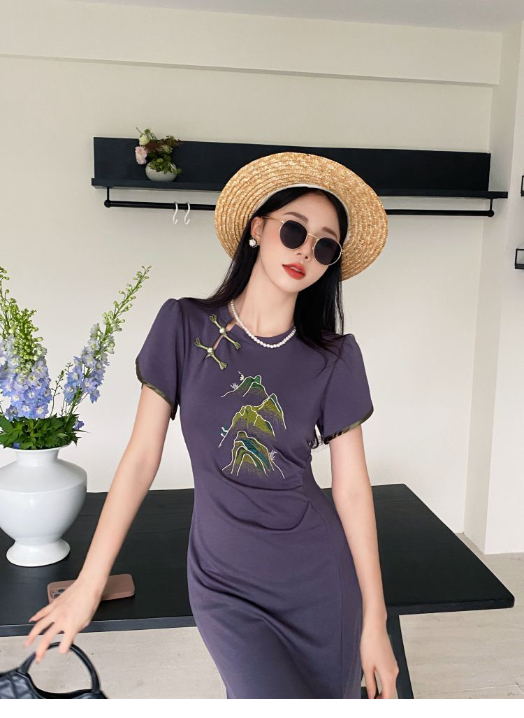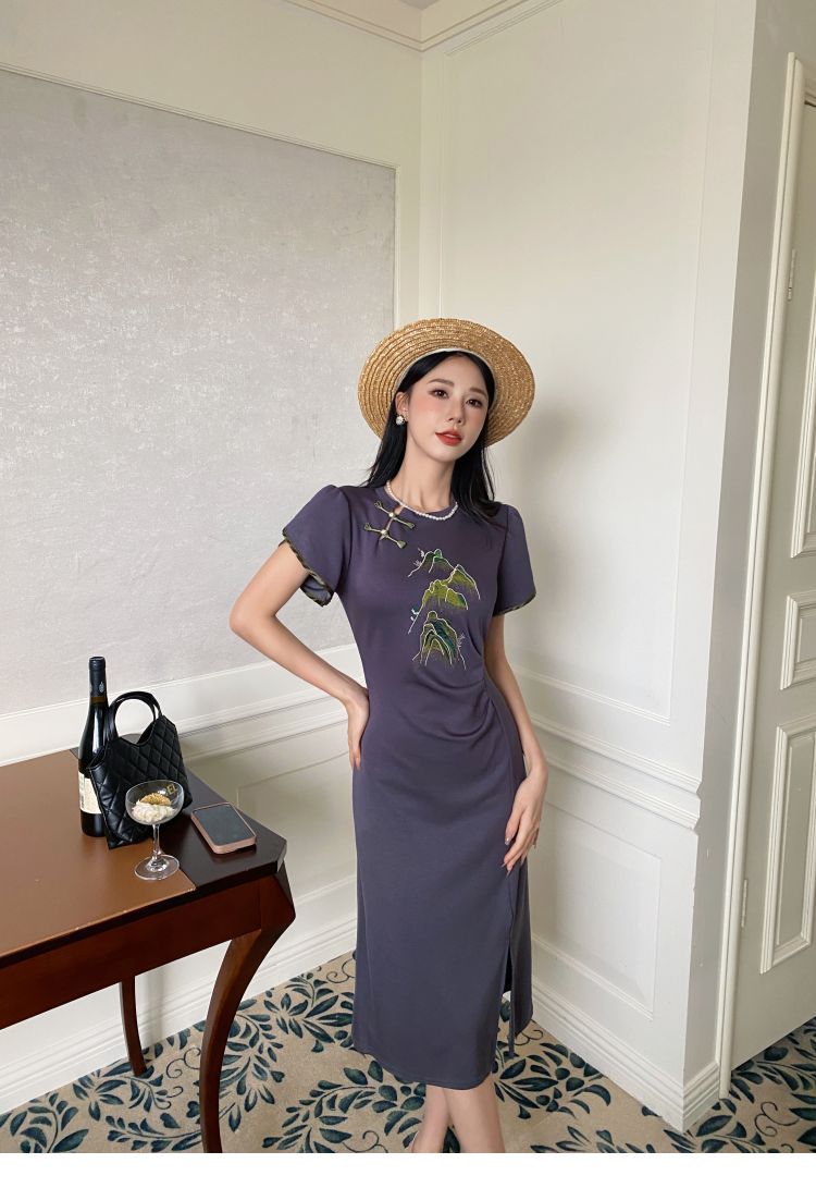 RM18268#高级轻奢气质复古褶皱收腰开叉裙女设计感国风刺绣盘扣连衣裙