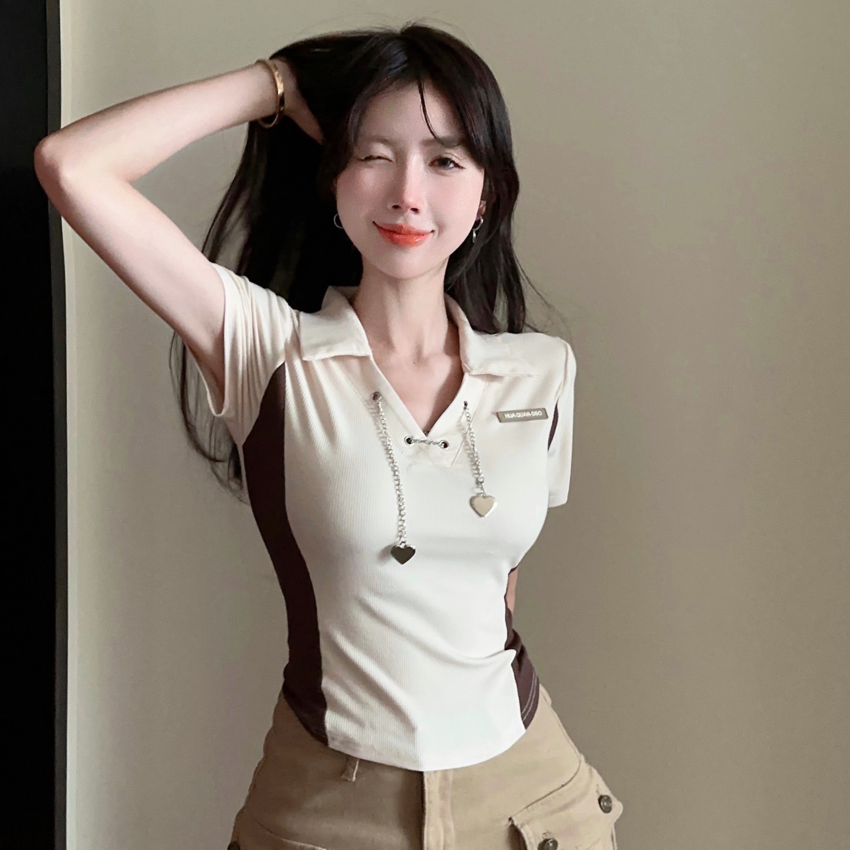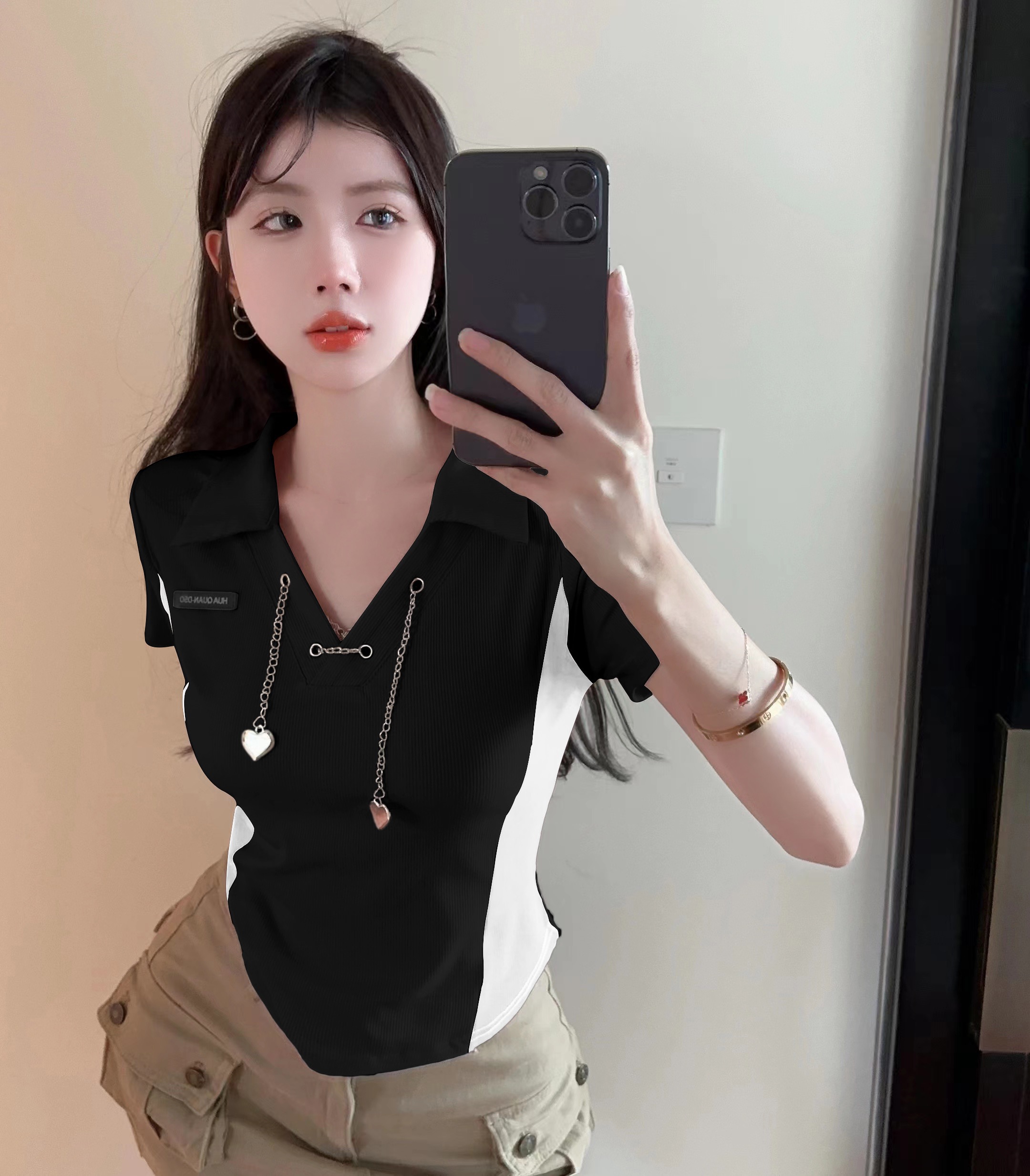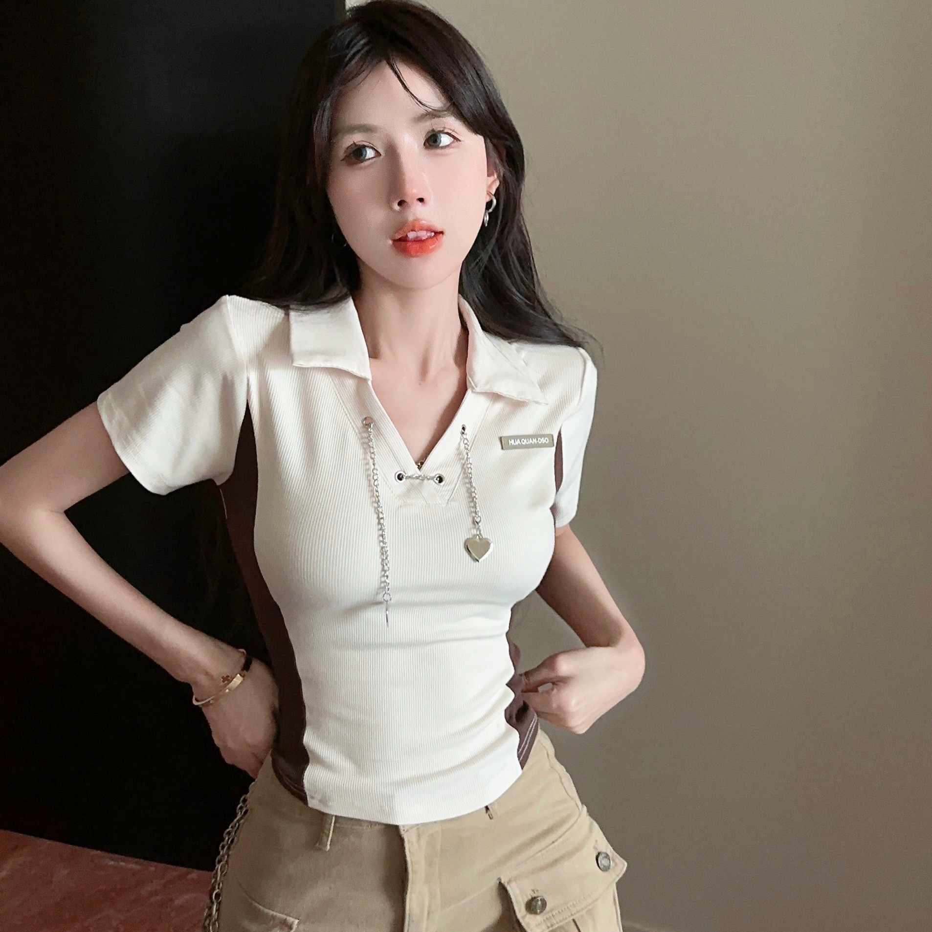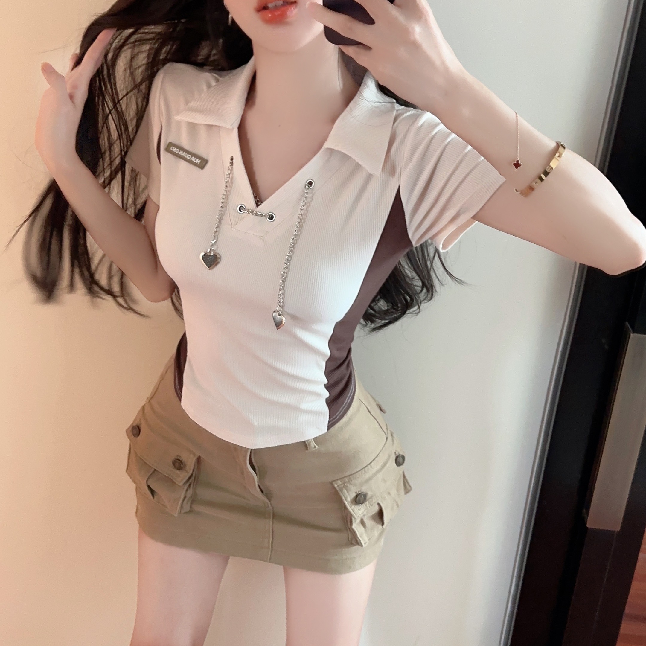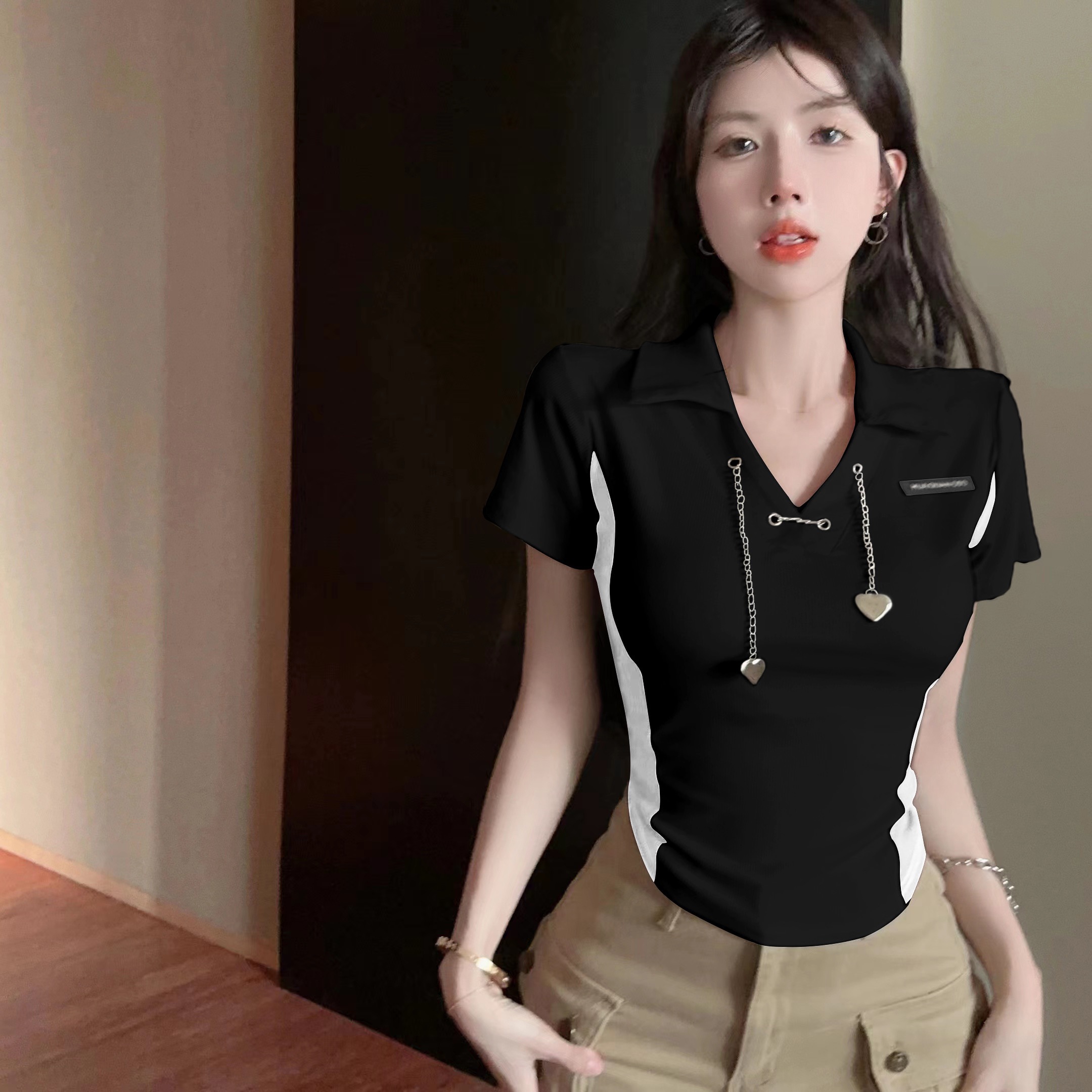 RM18304#纯欲独特美式复古甜辣妹polo衫v领上衣设计感短袖衬衫女夏