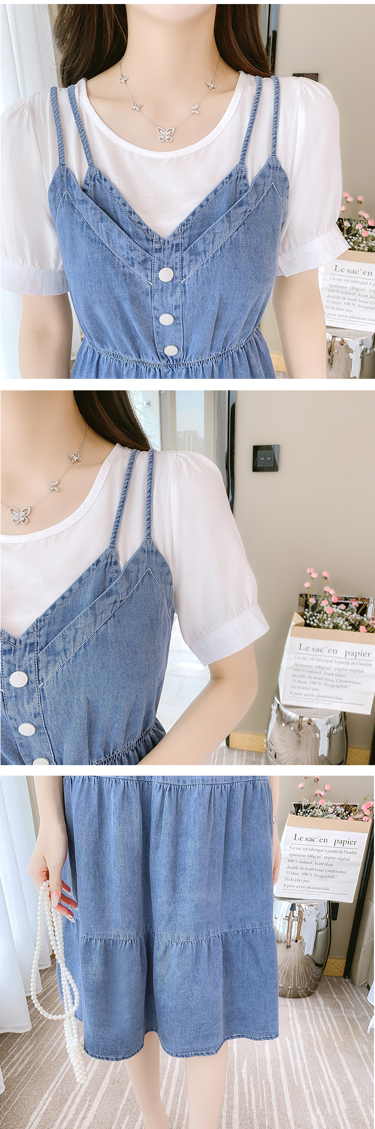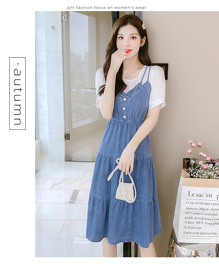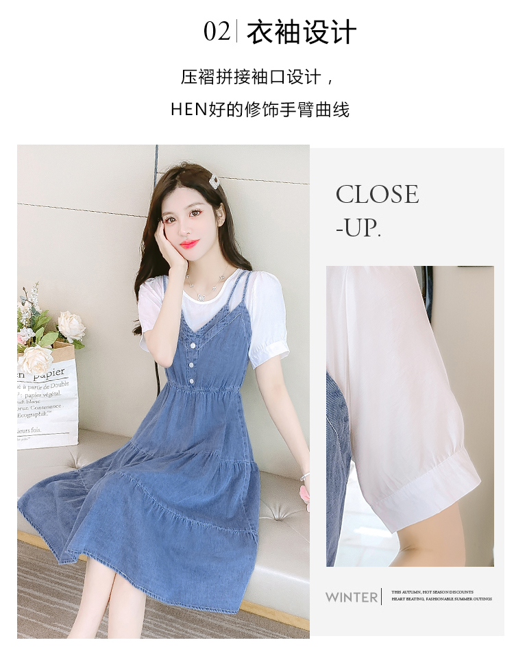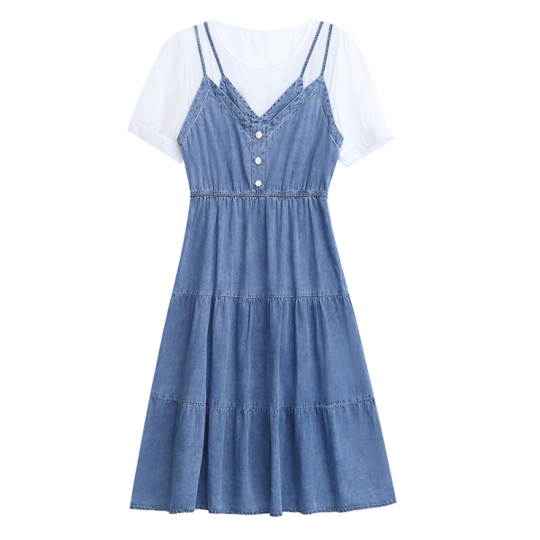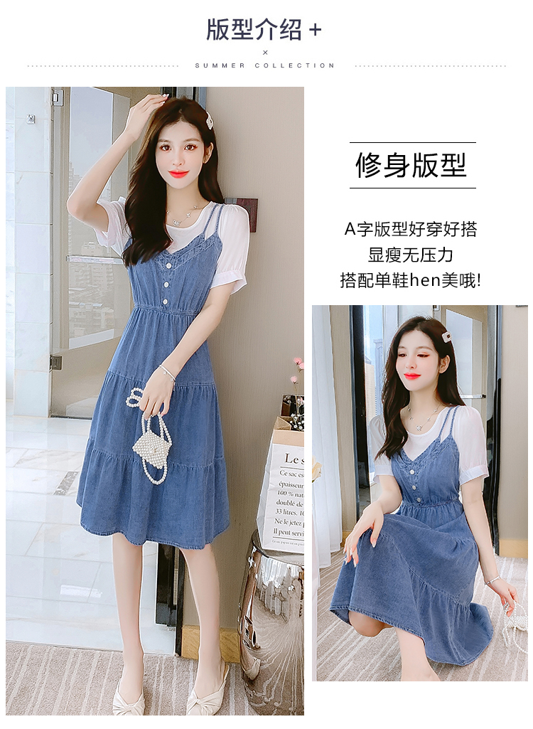 RM18327#时尚假两件2023年拼接修身显瘦遮肉小个子气质软牛仔休闲连衣裙
