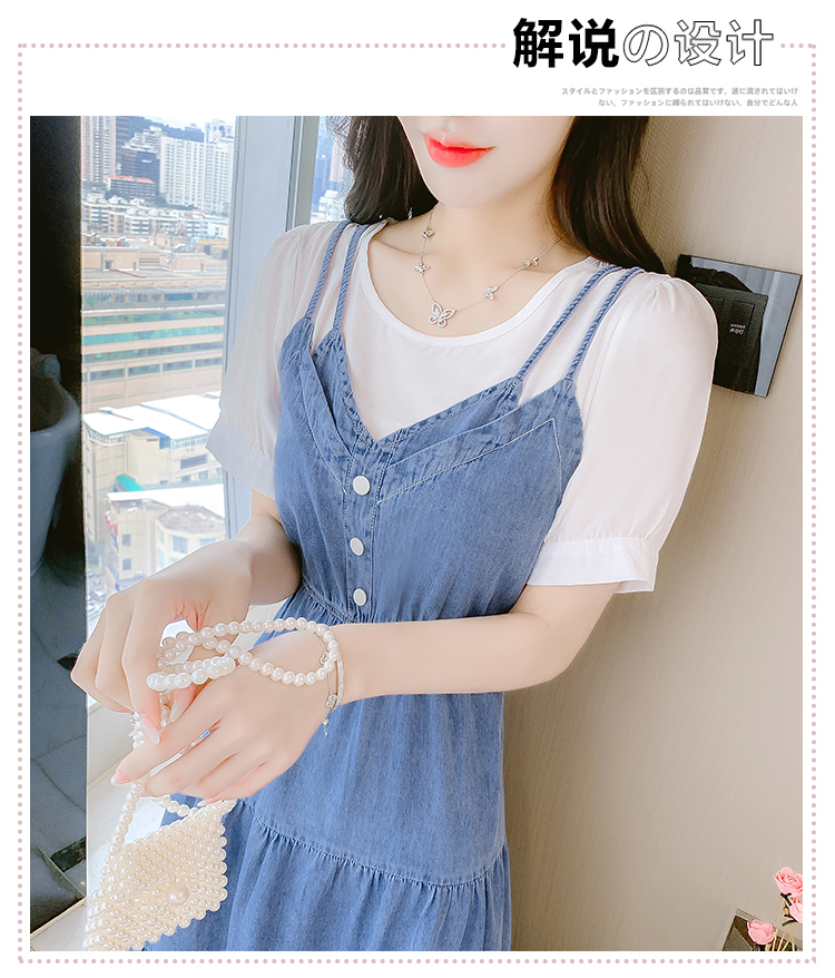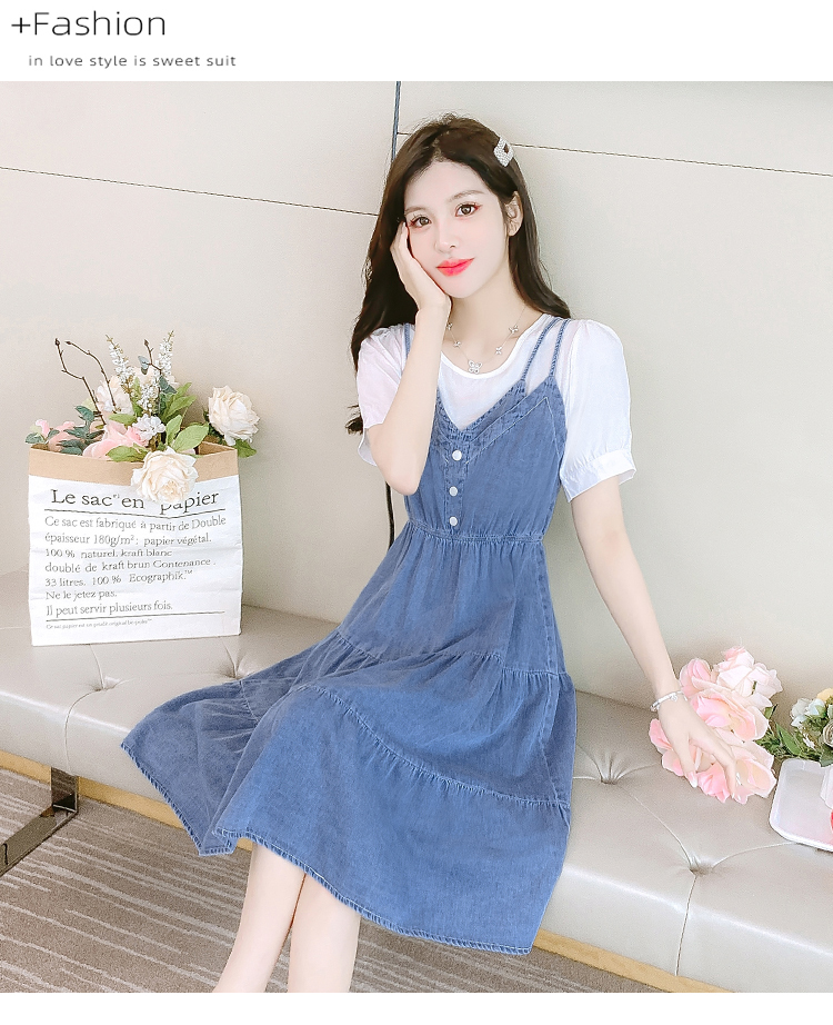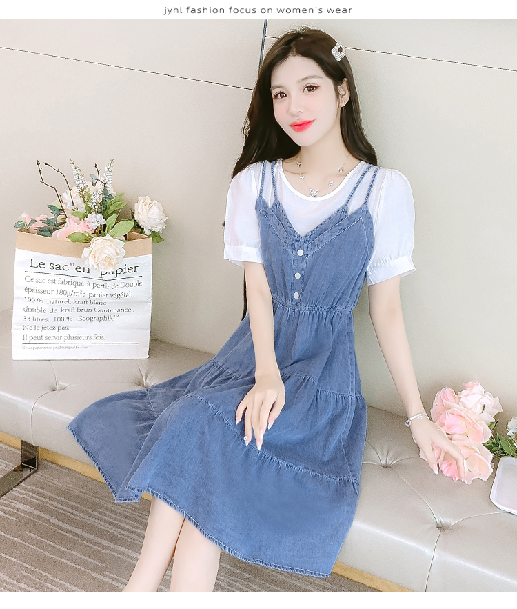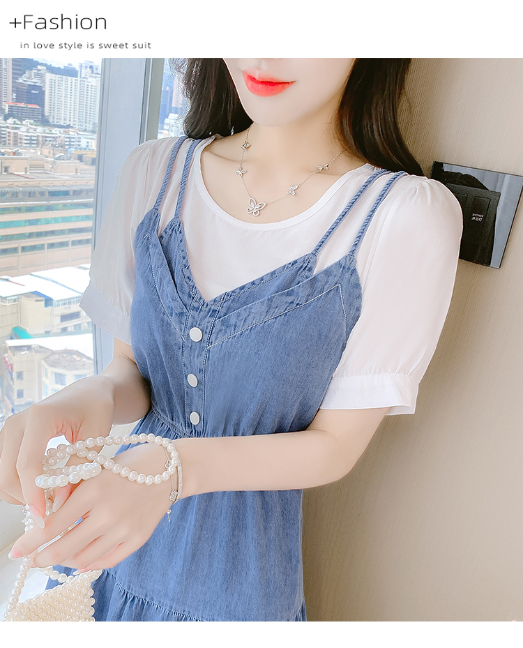 RM18327#时尚假两件2023年拼接修身显瘦遮肉小个子气质软牛仔休闲连衣裙