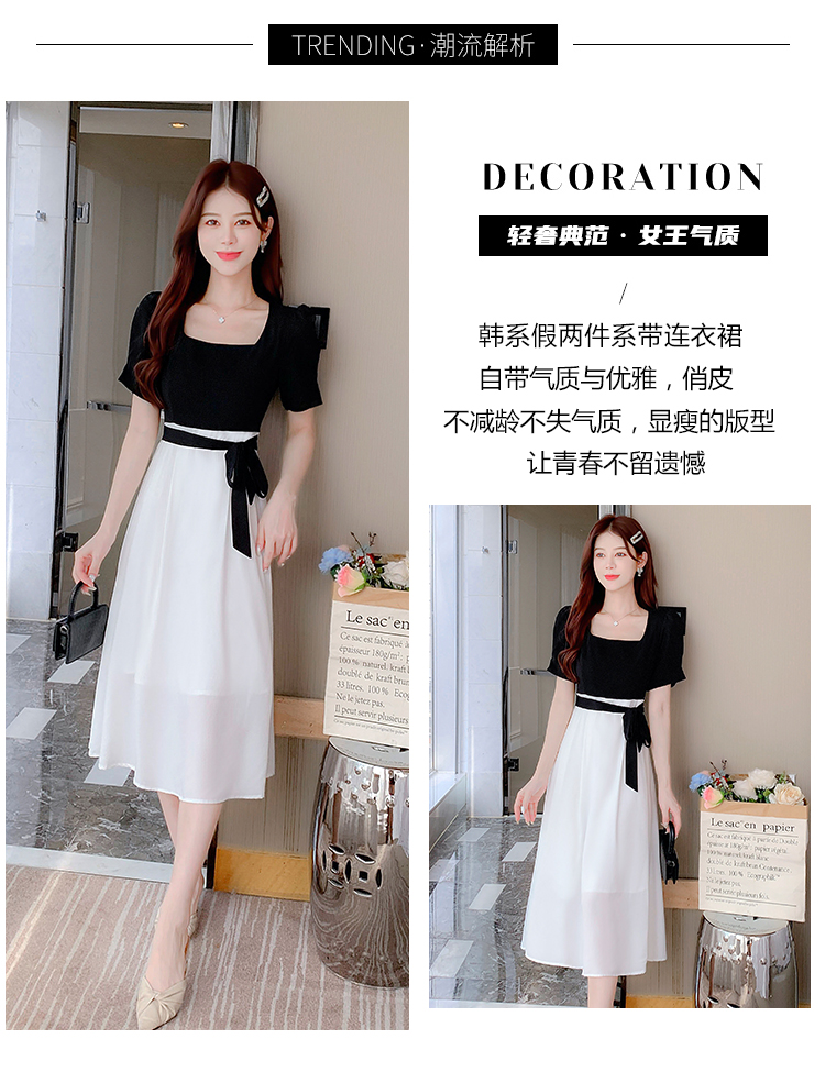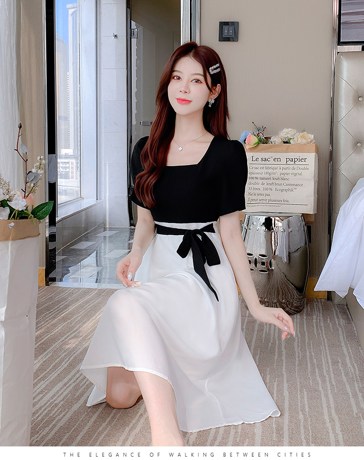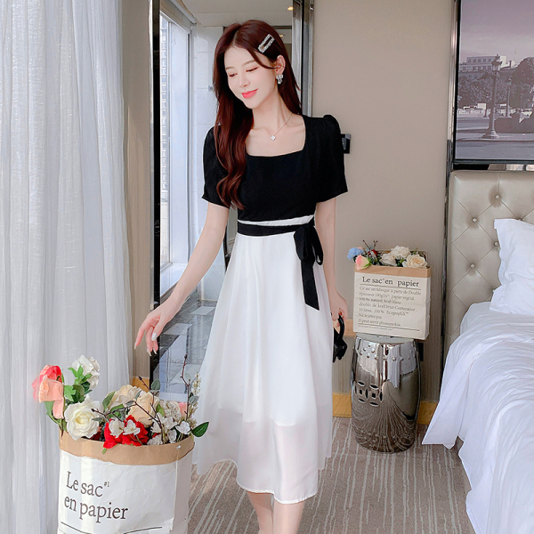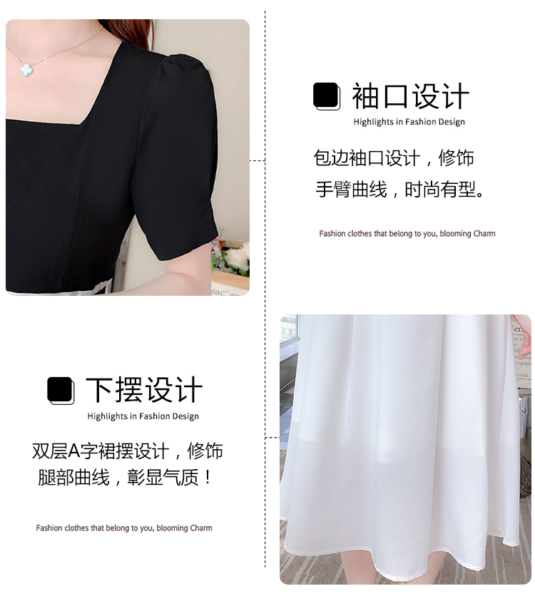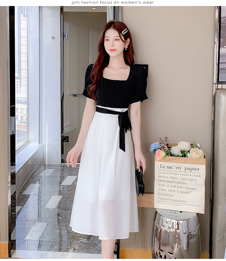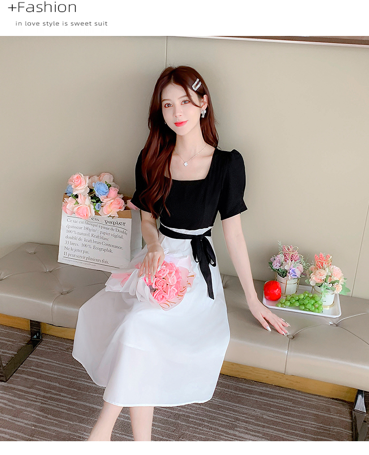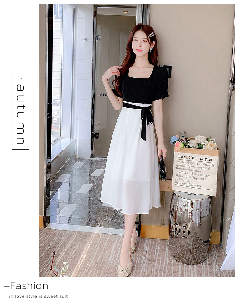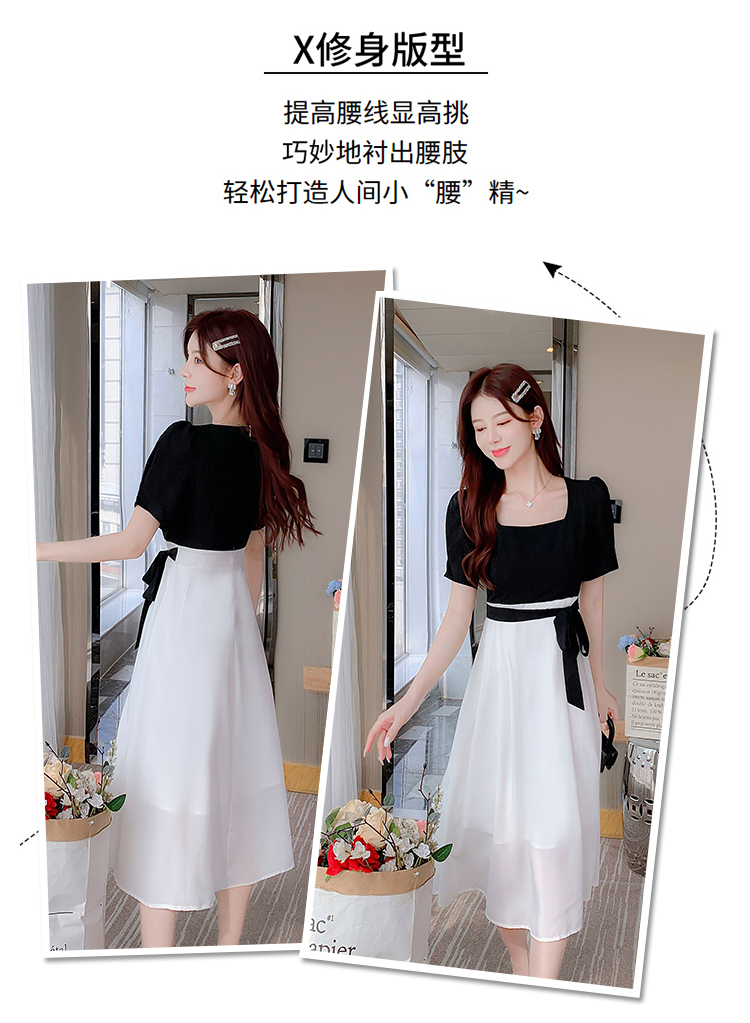 RM18328#法式赫本风设计感方领收腰显瘦连衣裙拼色小众长裙