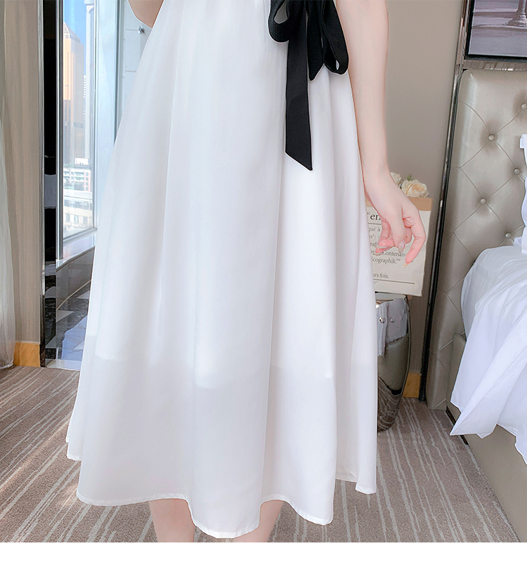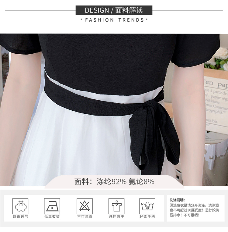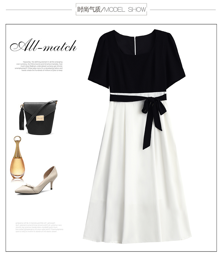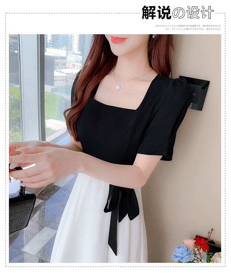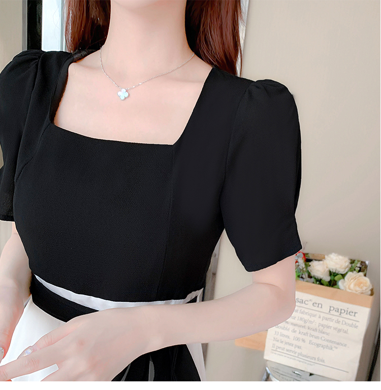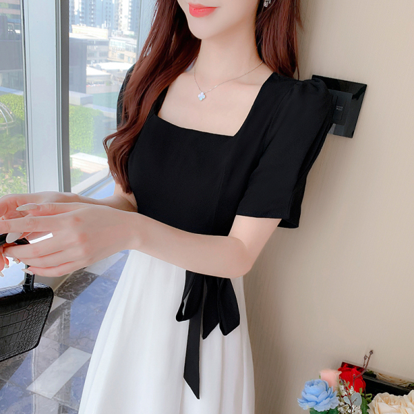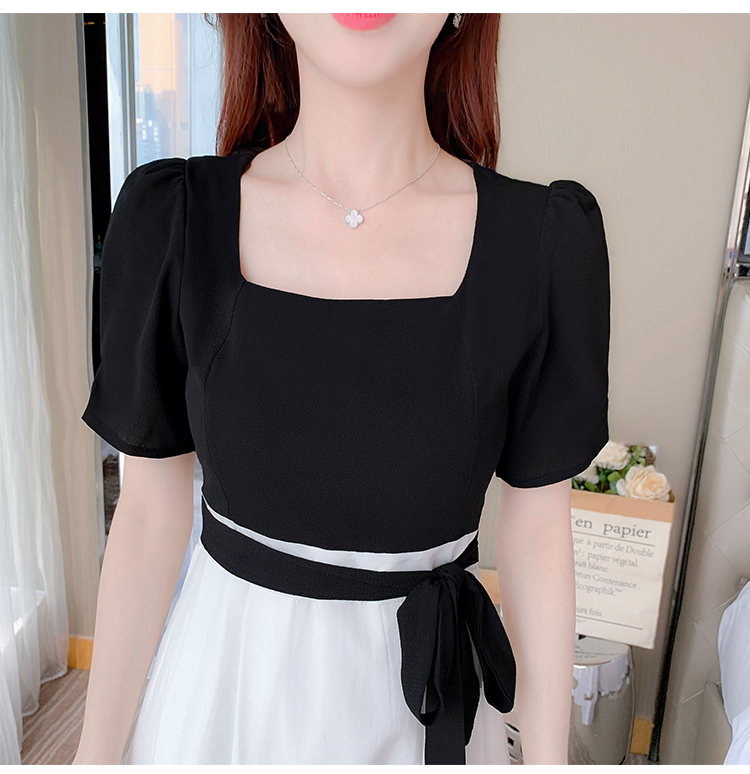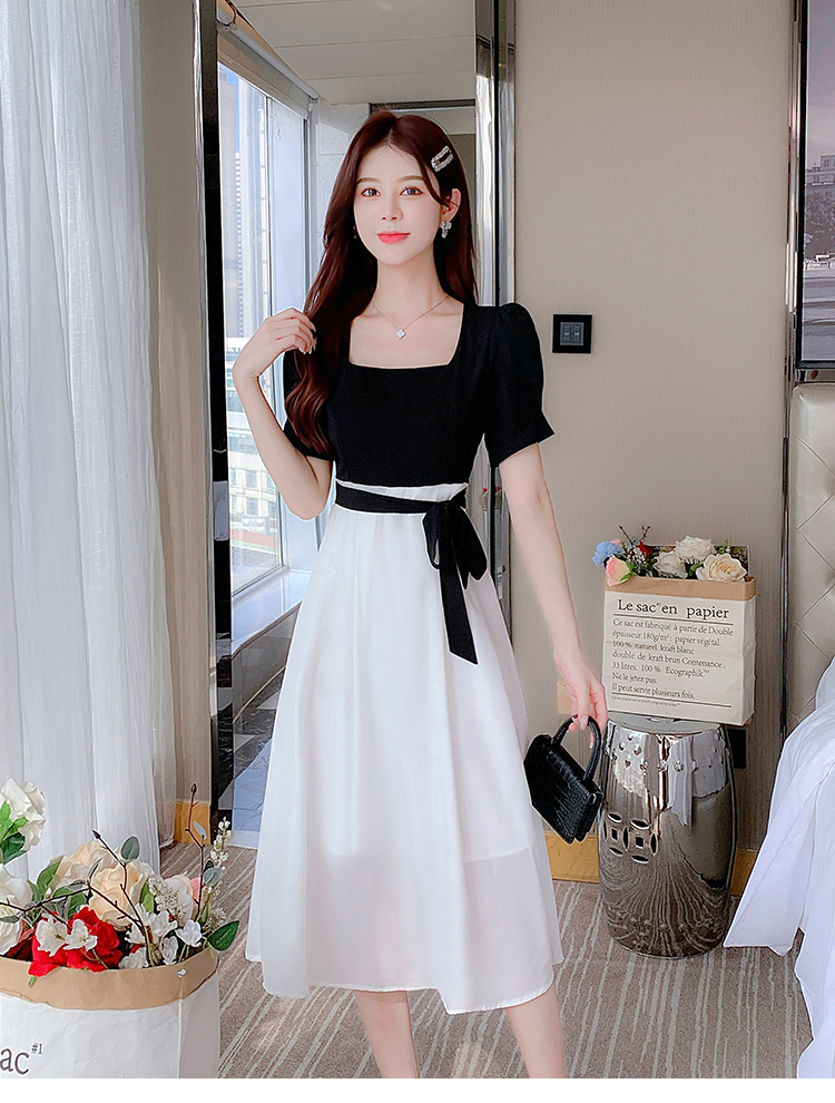 RM18328#法式赫本风设计感方领收腰显瘦连衣裙拼色小众长裙