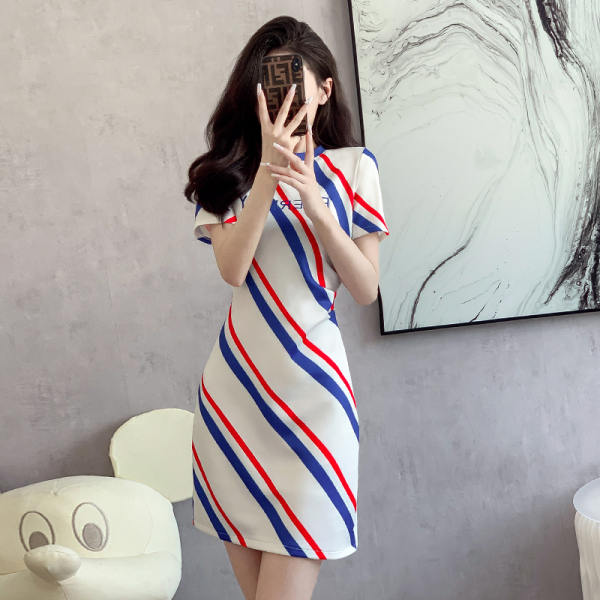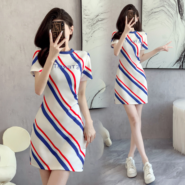 RM18337#夏季新款设计师气质收腰显瘦条纹连衣裙
