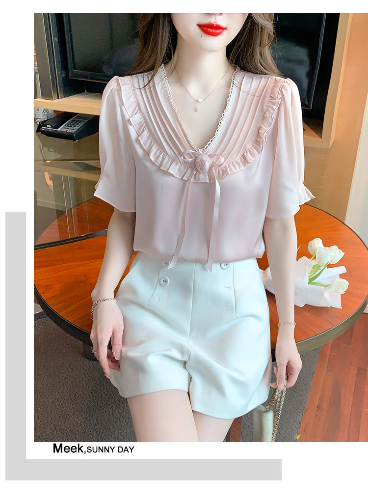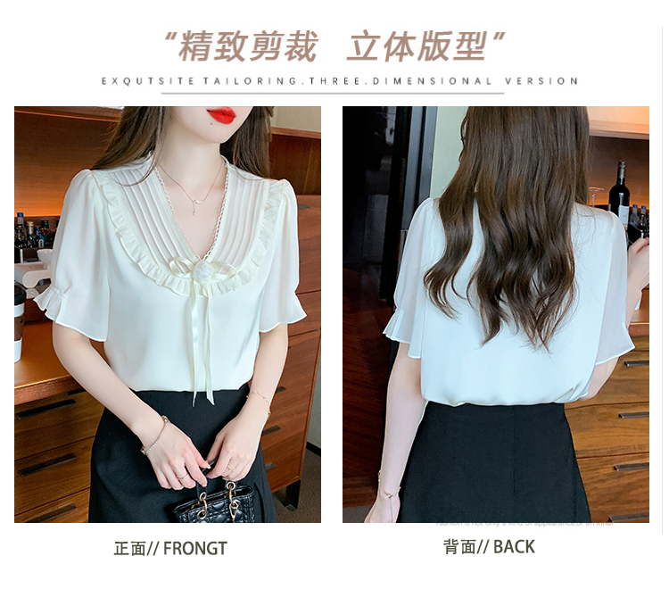 RM18576#褶皱v领雪纺衫2022夏季新款荷叶边洋气质小衫遮肚衬衫上衣女