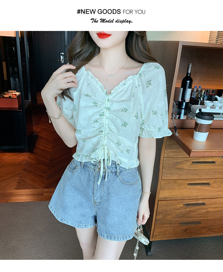 RM18501#法式印花纯棉衬衫女夏季新款荷叶边气质V领抽褶短袖