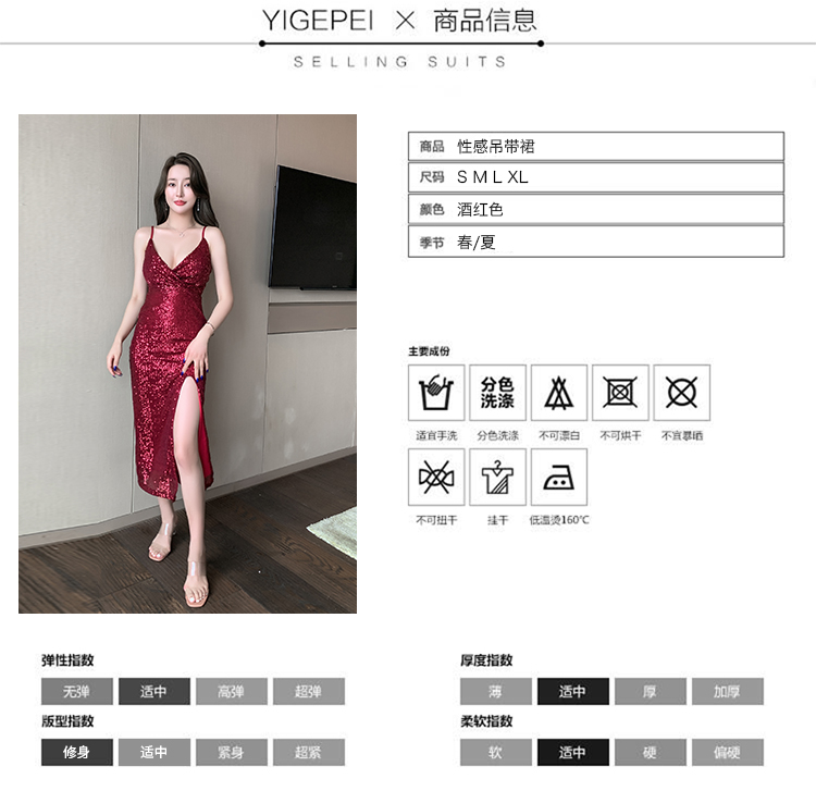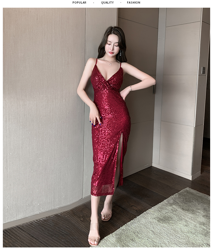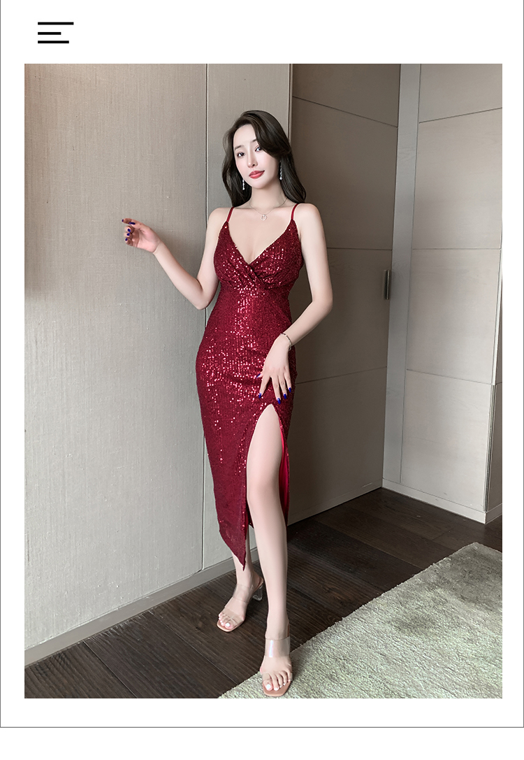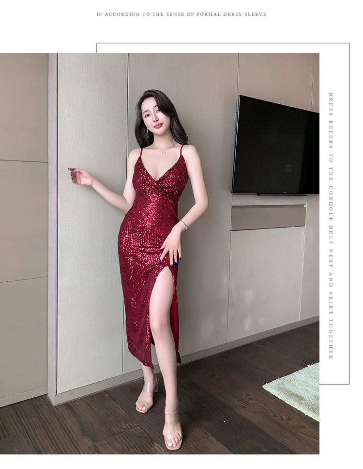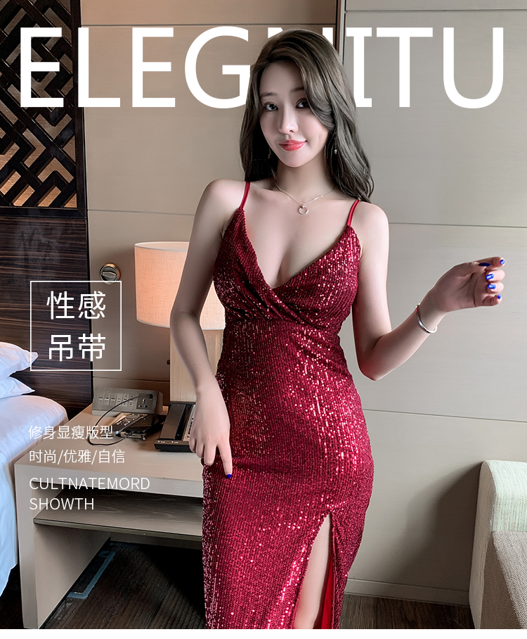 RM18683#晚礼服女宴会气质小众年会性感开叉红色吊带连衣裙