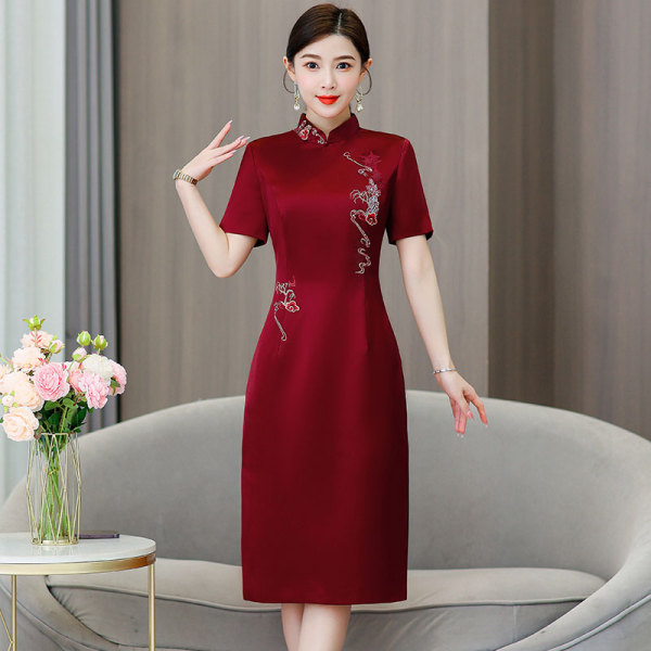 RM18738#改良旗袍轻奢东方绣花民国风2023夏气质妈妈装婚宴短袖礼服裙女