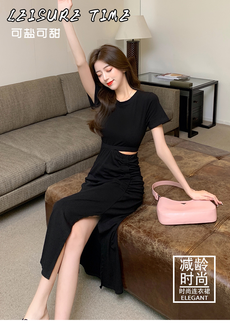 RM18626#新款侧露腰褶皱不规则设计感韩版纯色收腰显瘦开叉中长裙