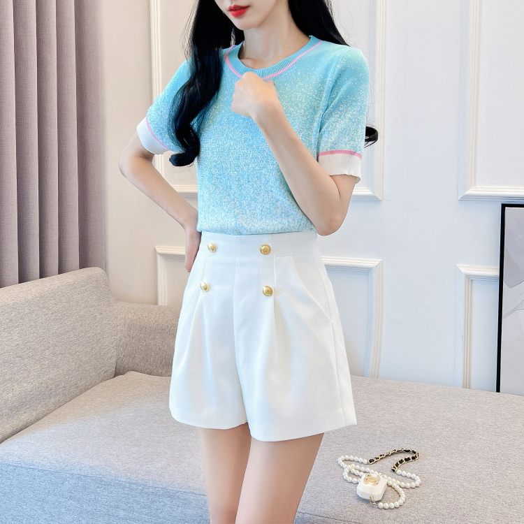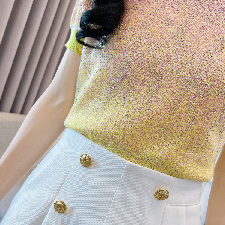 RM18429#夏季新款设计感渐变色烫钻重工T恤冰丝针织上衣女