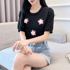 RM18430#夏季新款设计感立体花朵短袖圆领T恤冰丝针织女
