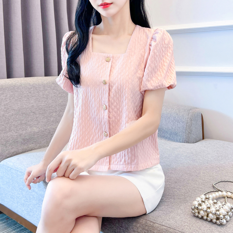 RM18507#夏季新款设计感小香风方领衬衣泡泡袖雪纺衫上衣女