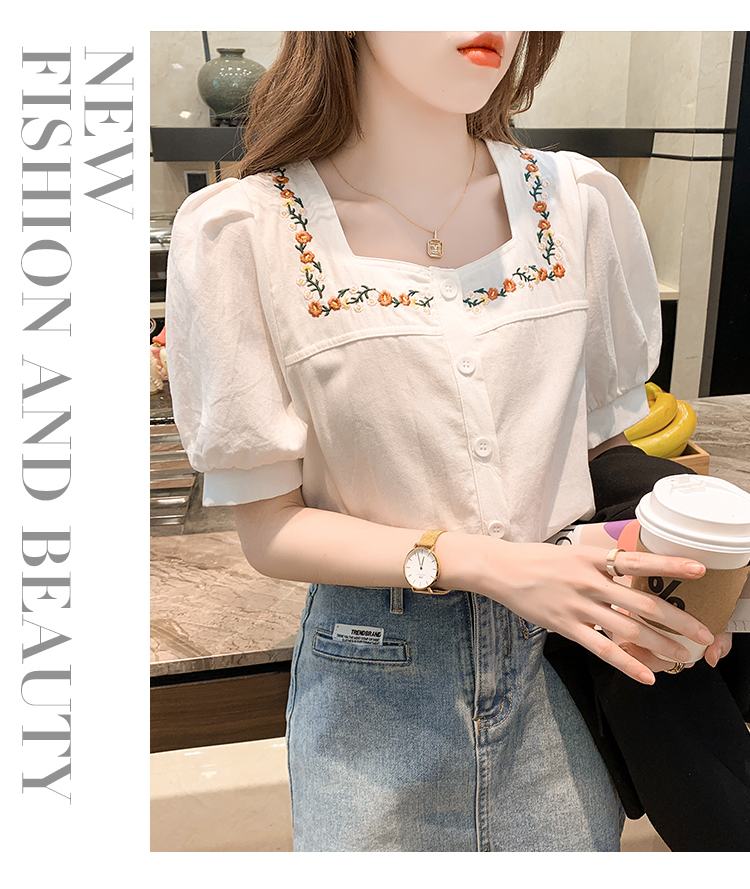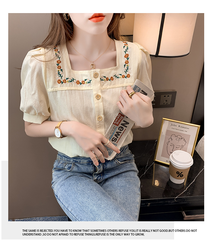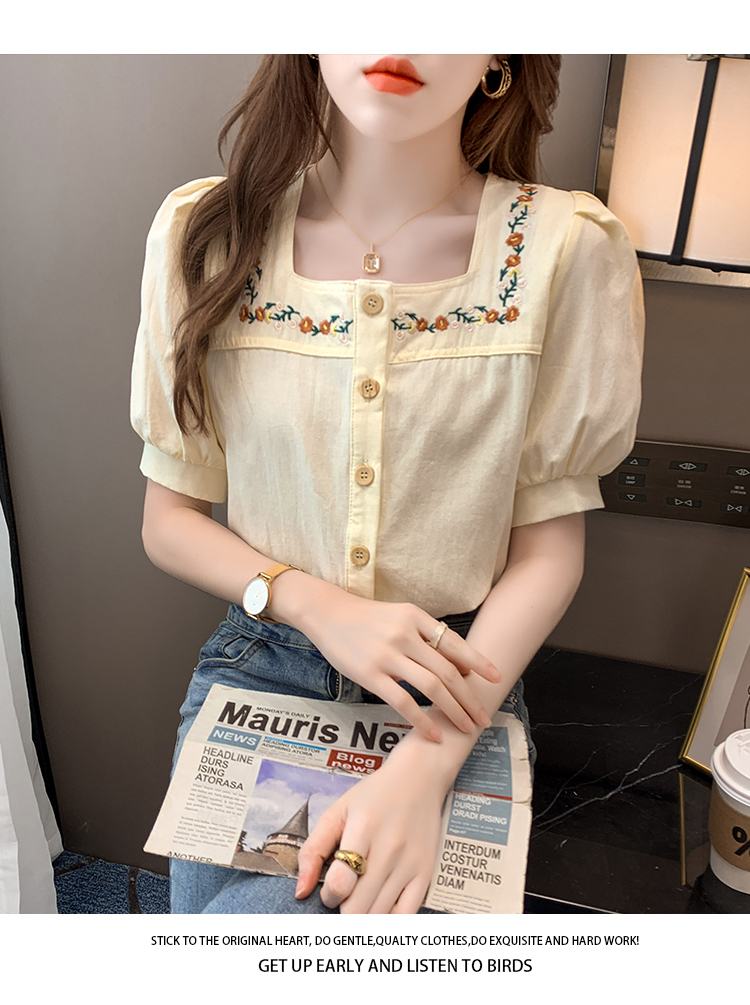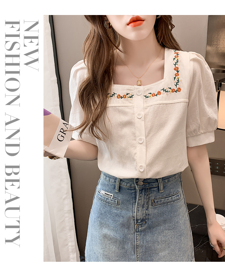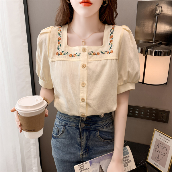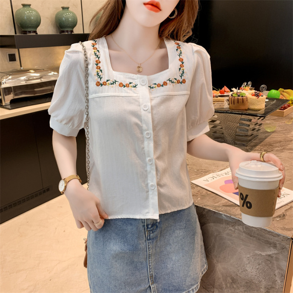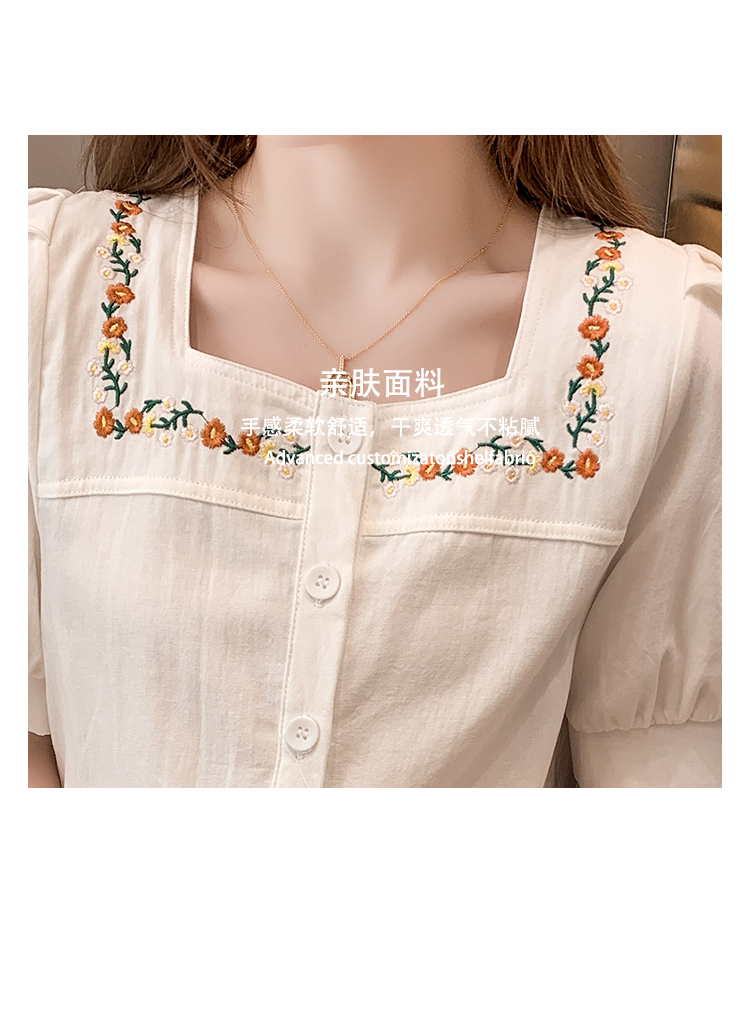 RM18514#夏季新款日系甜美减龄方领显瘦女上衣刺绣花棉衬衫