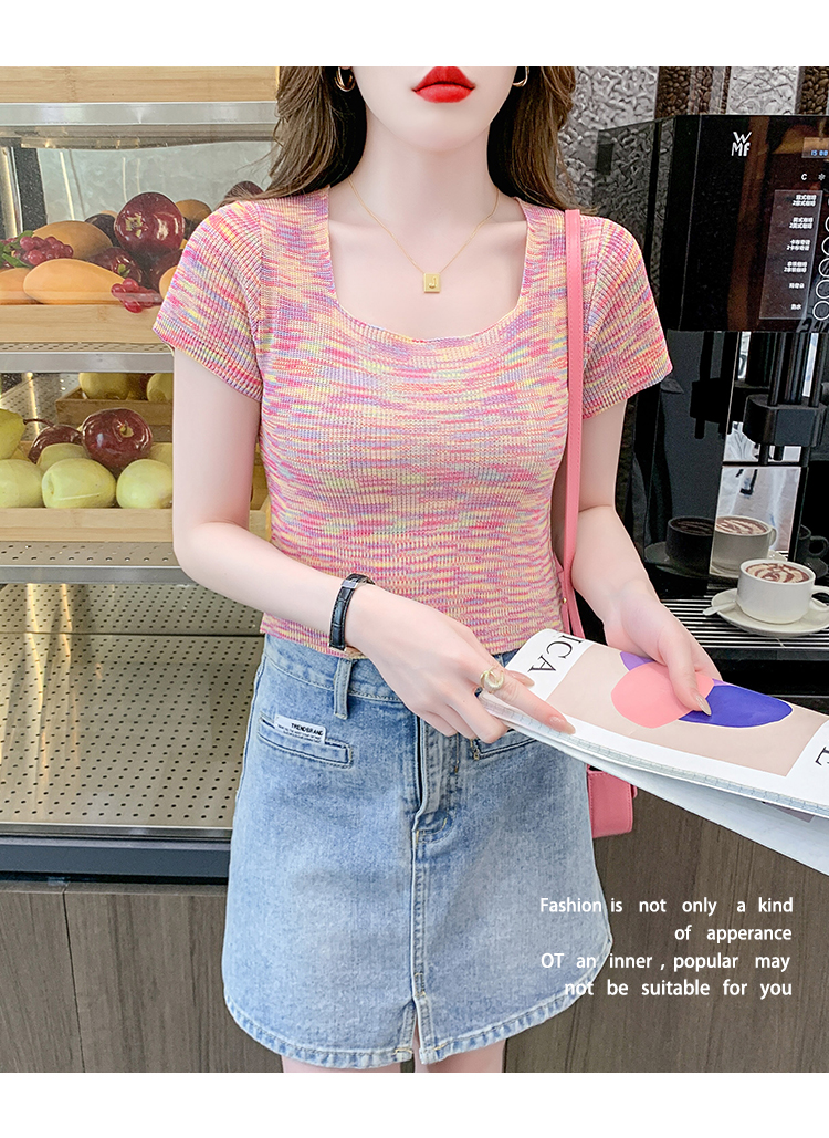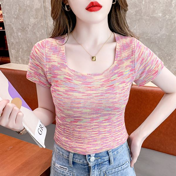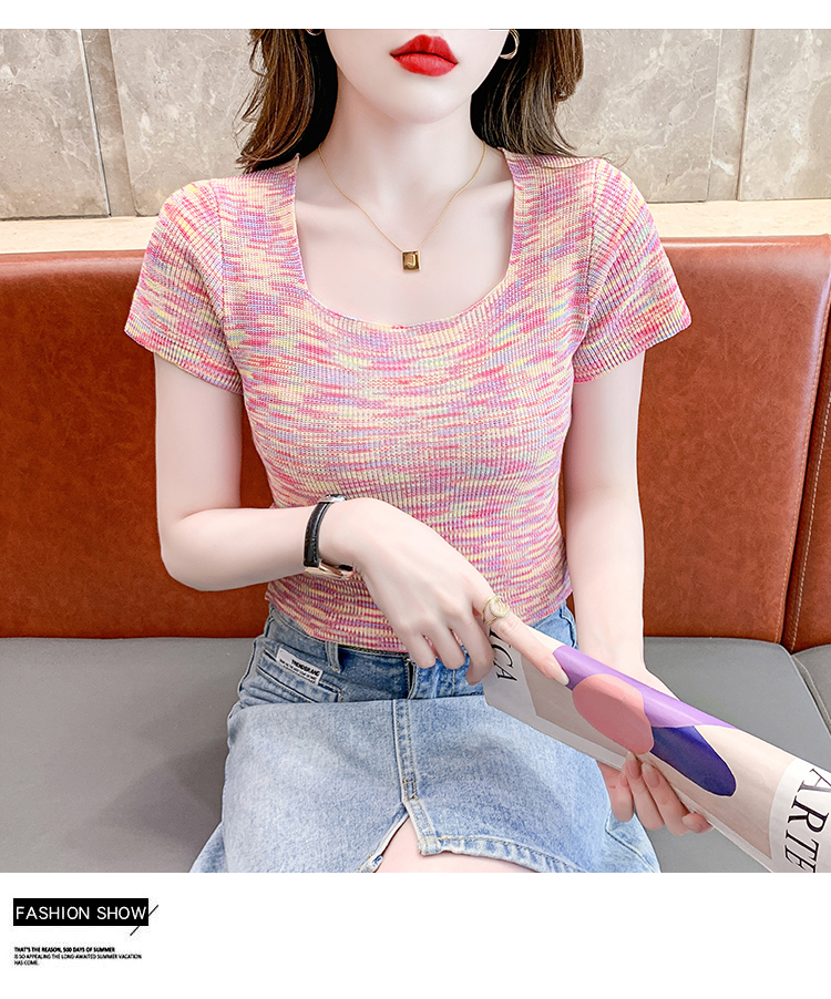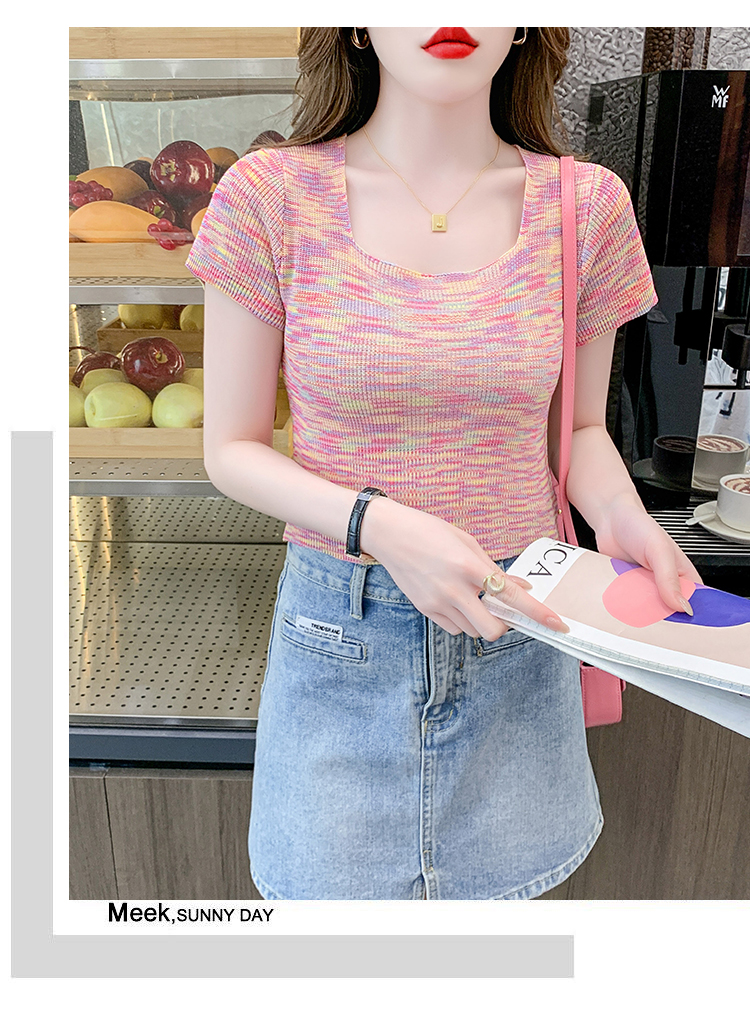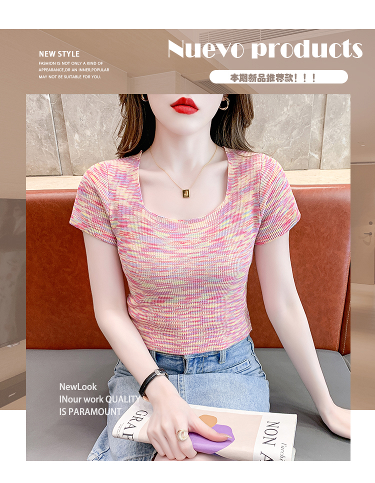 RM18434#夏季新款设计感方领修身撞色上衣彩虹色短袖针织衫女