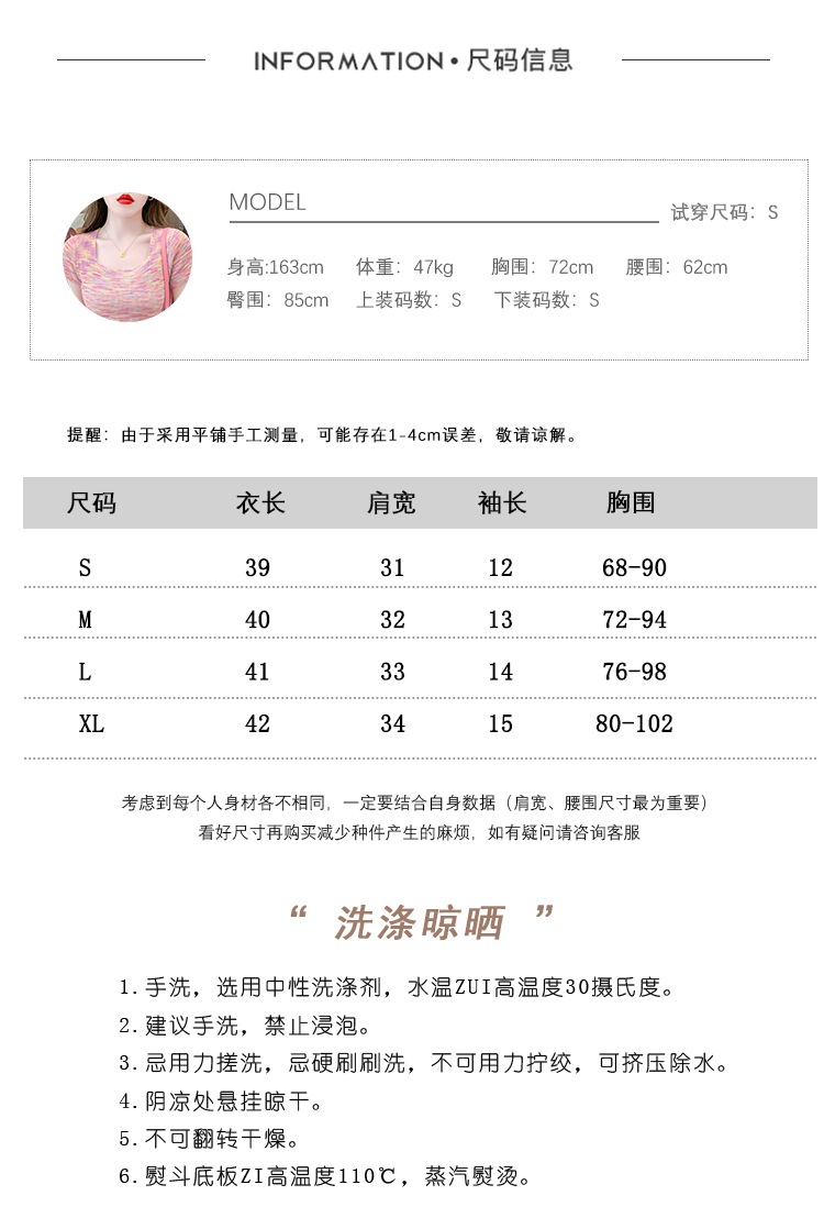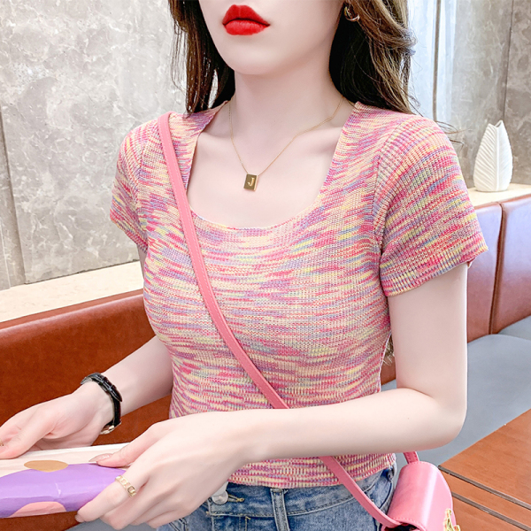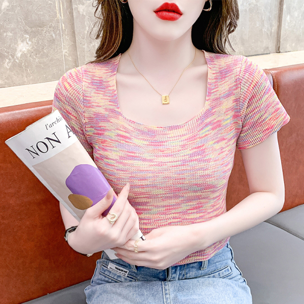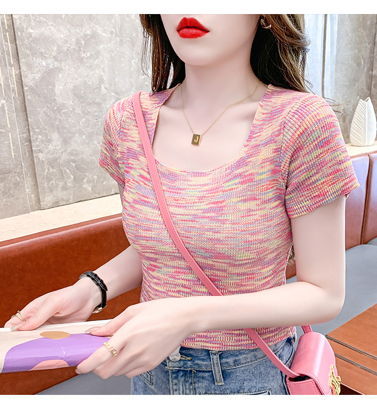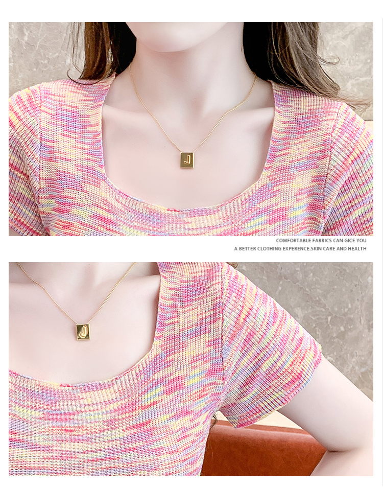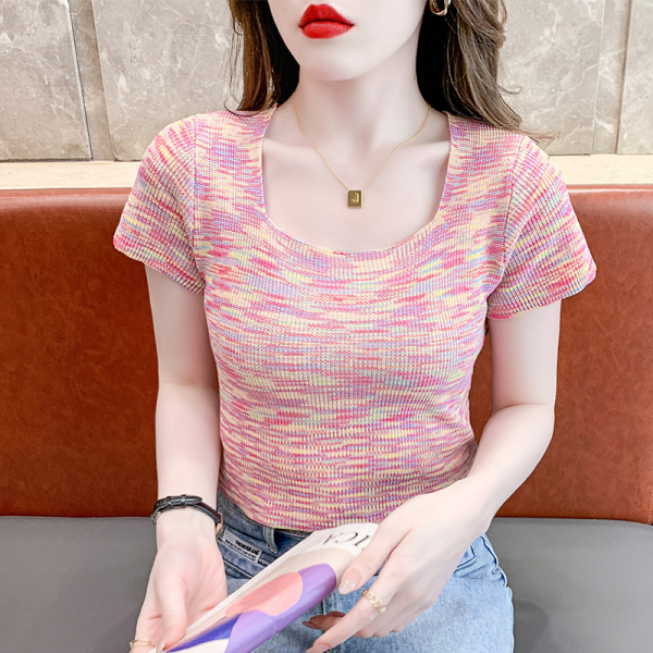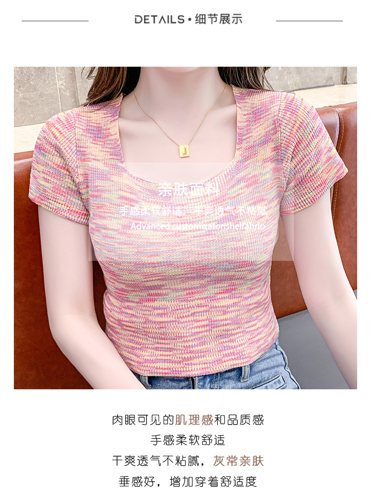 RM18434#夏季新款设计感方领修身撞色上衣彩虹色短袖针织衫女