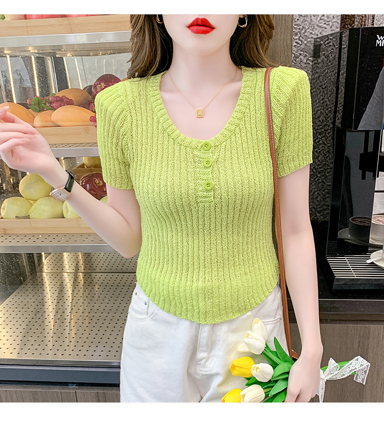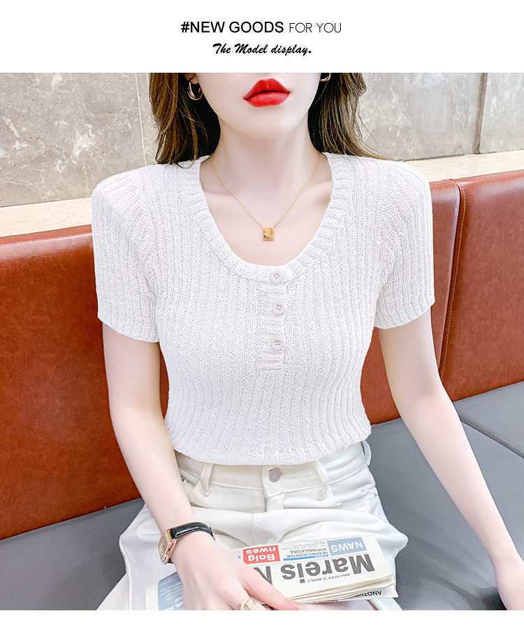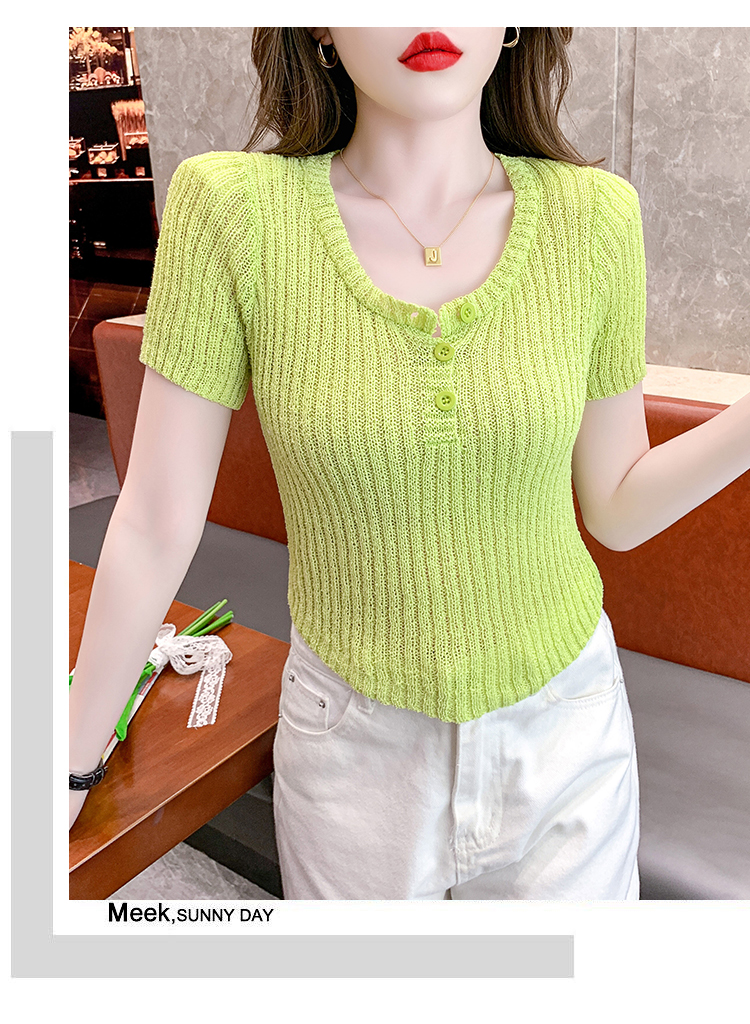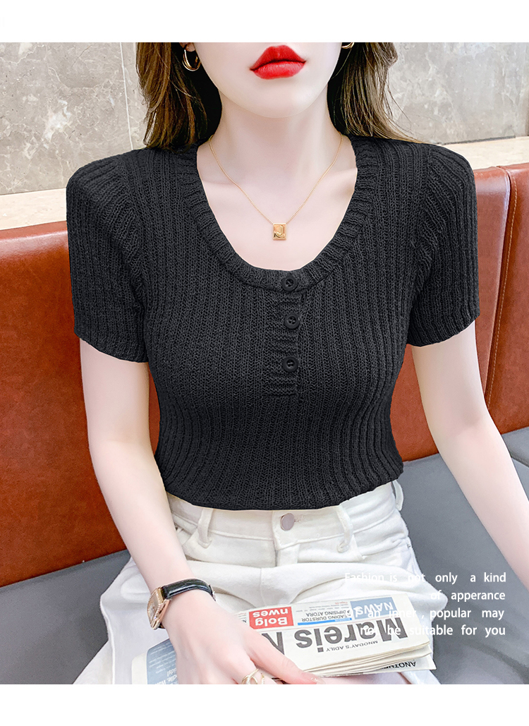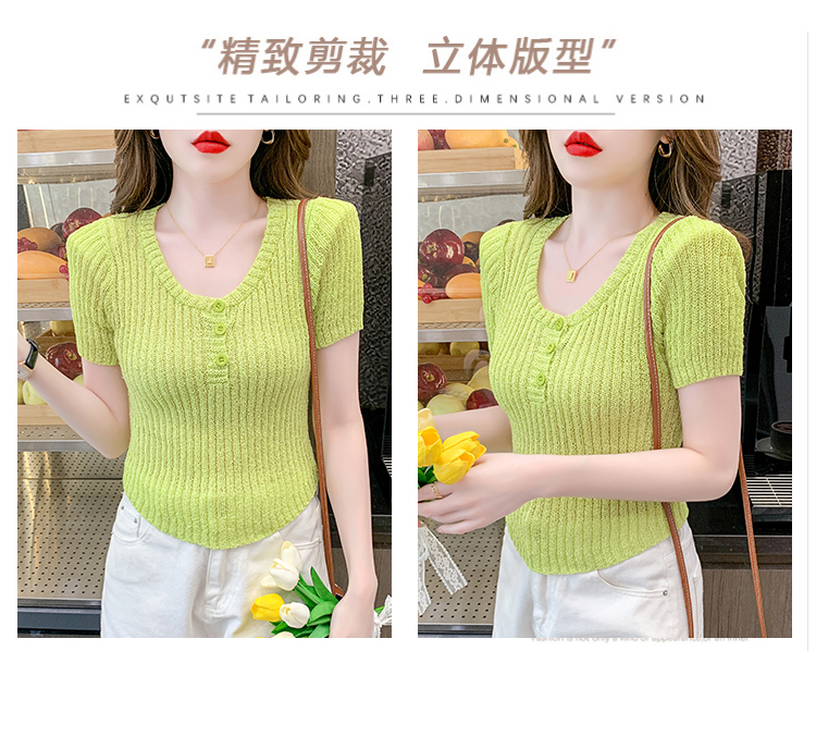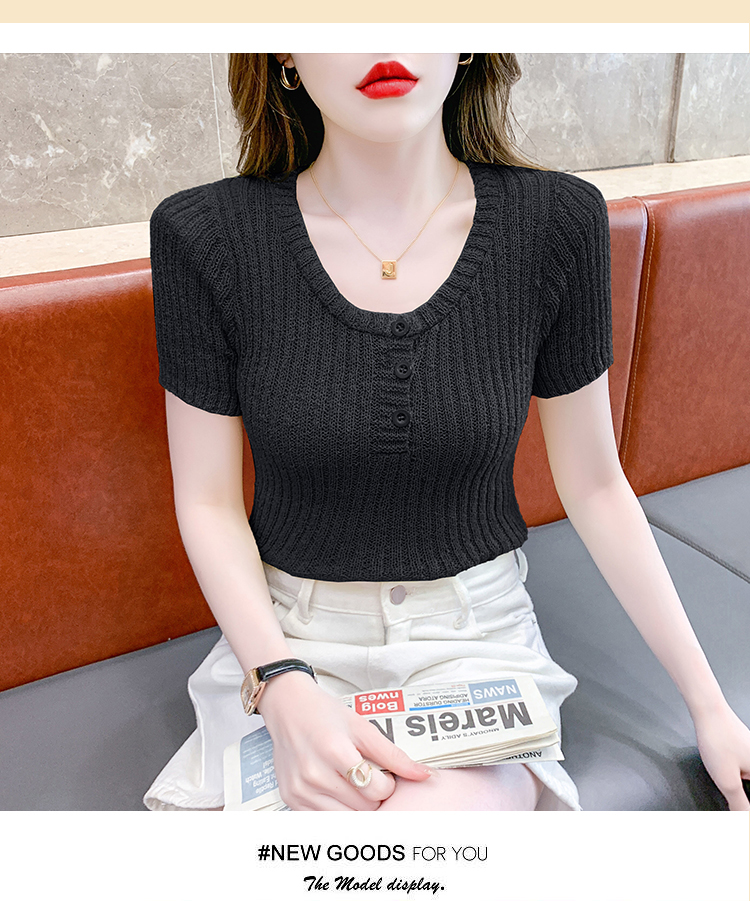 RM18448#夏季新款小众纯色短袖上衣垫肩U领短款针织衫女