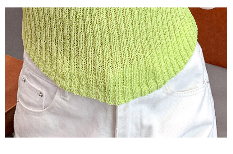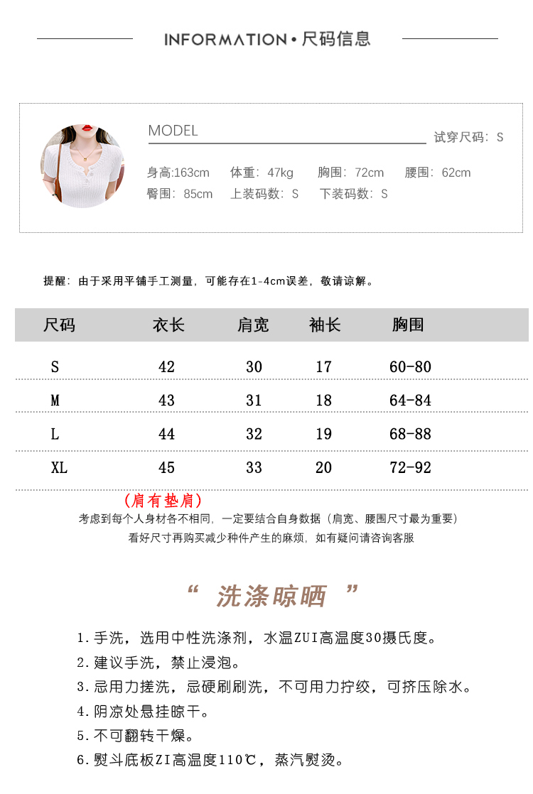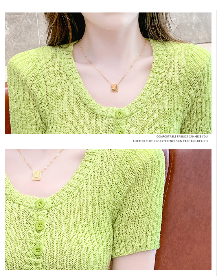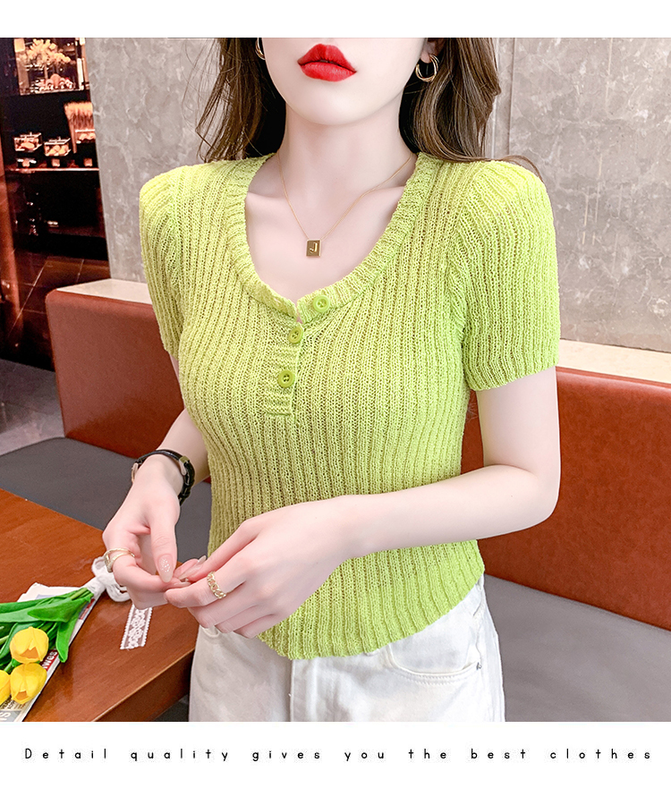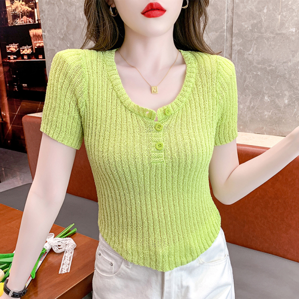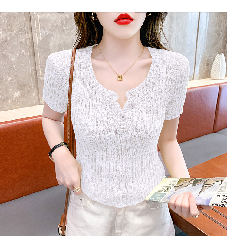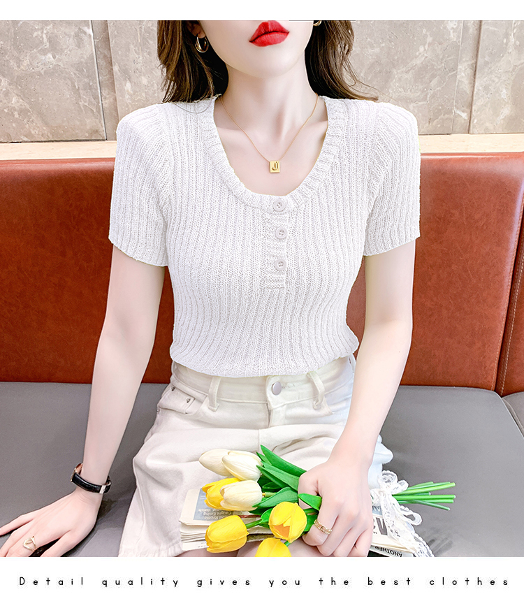 RM18448#夏季新款小众纯色短袖上衣垫肩U领短款针织衫女
