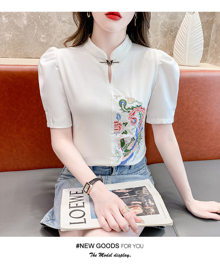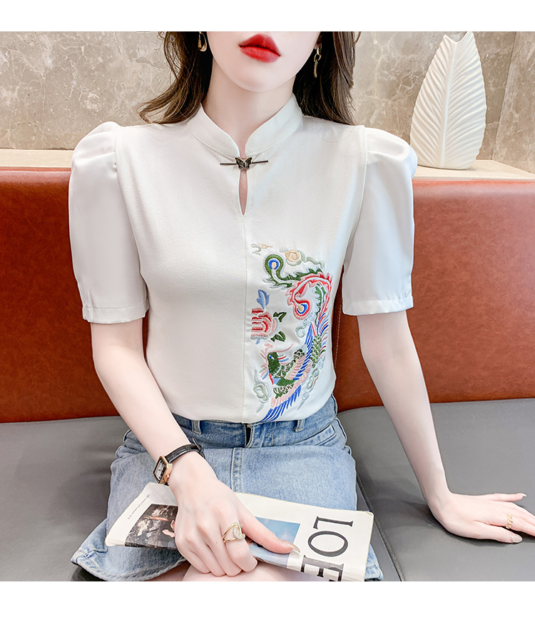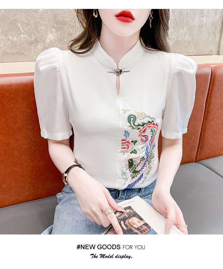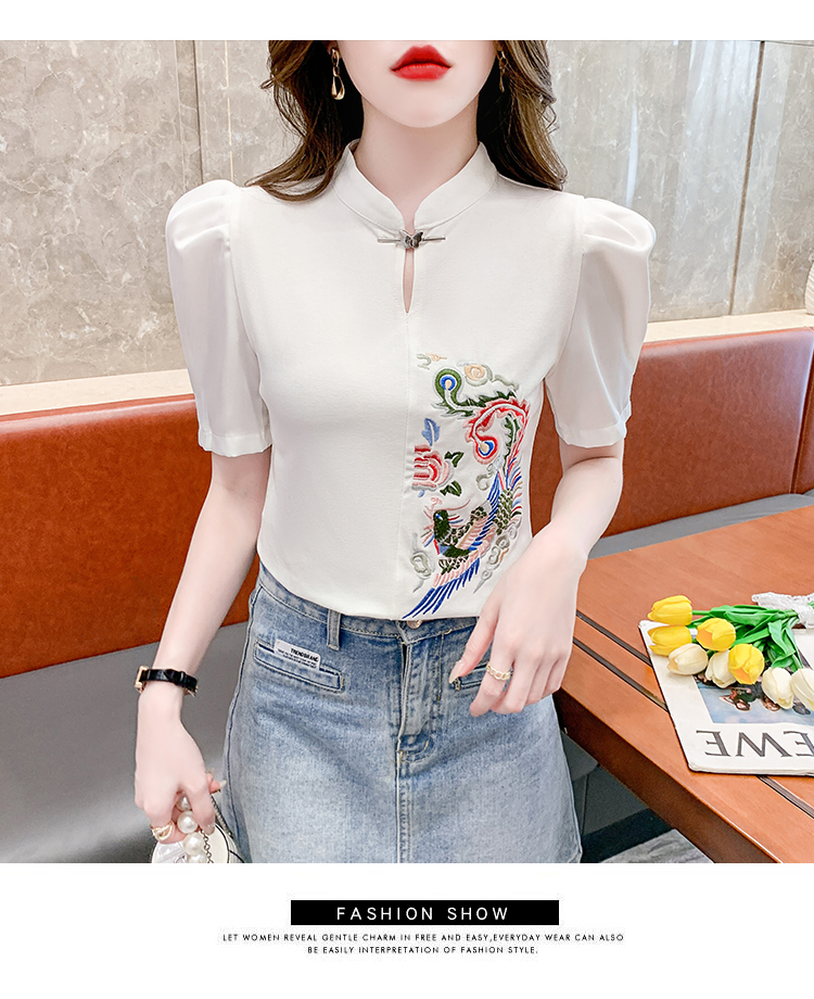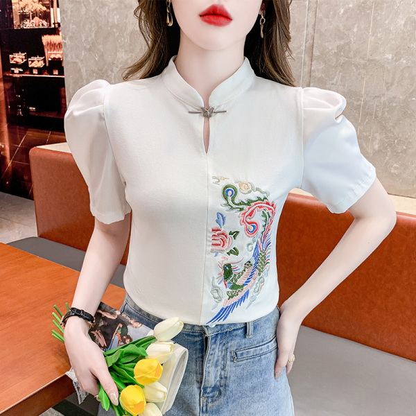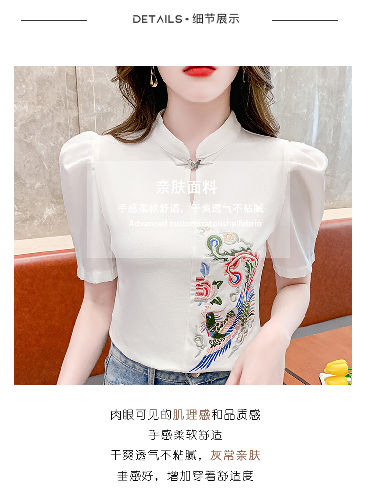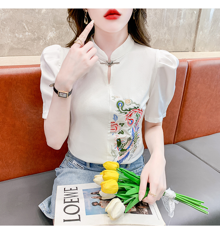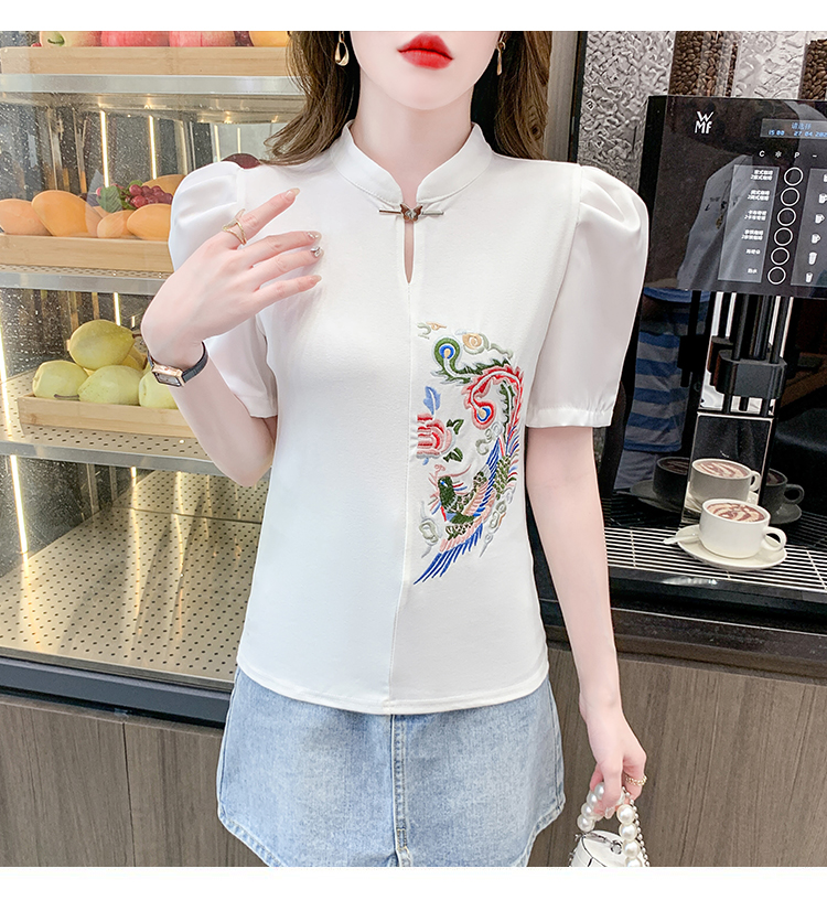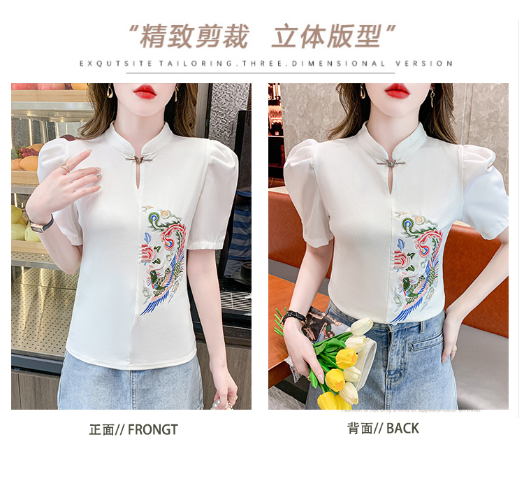 RM18516#复古旗袍刺绣泡泡袖短袖T恤2023夏季新款国潮半开领上衣