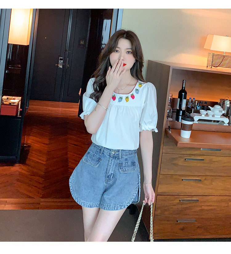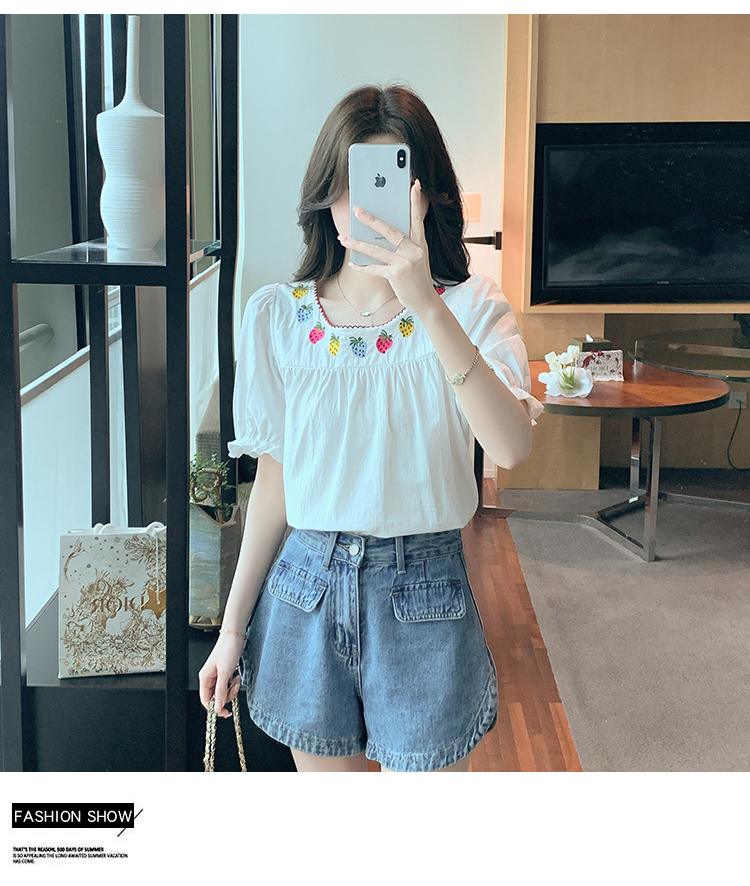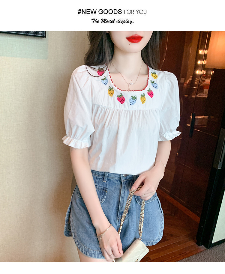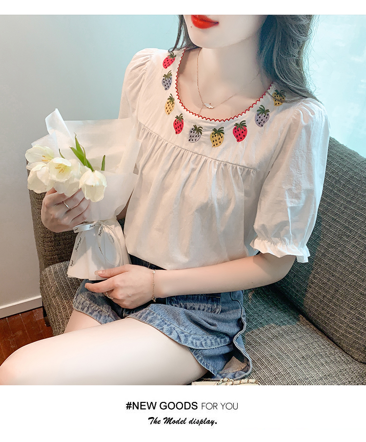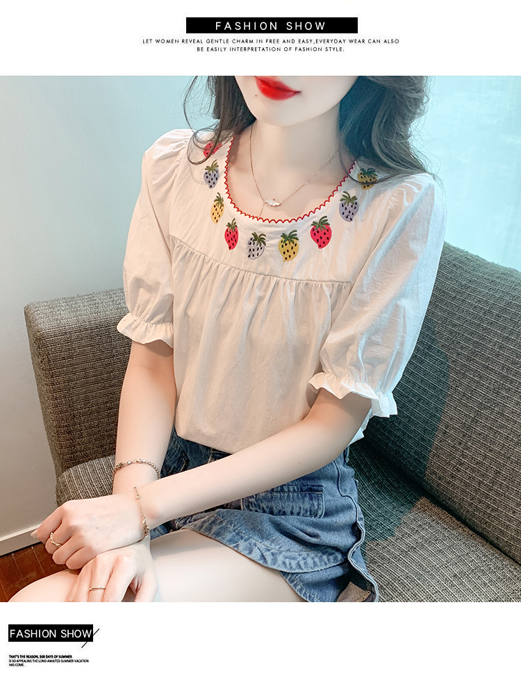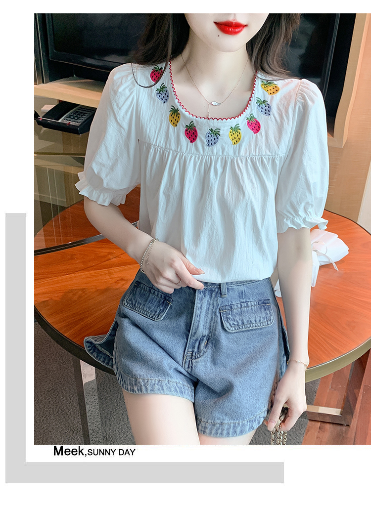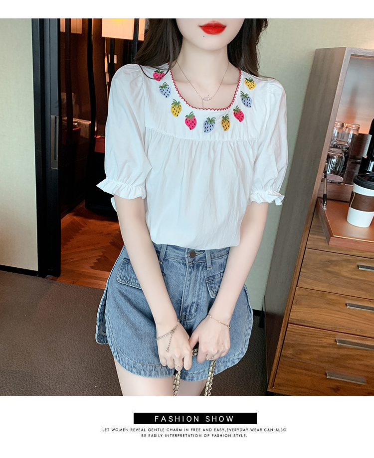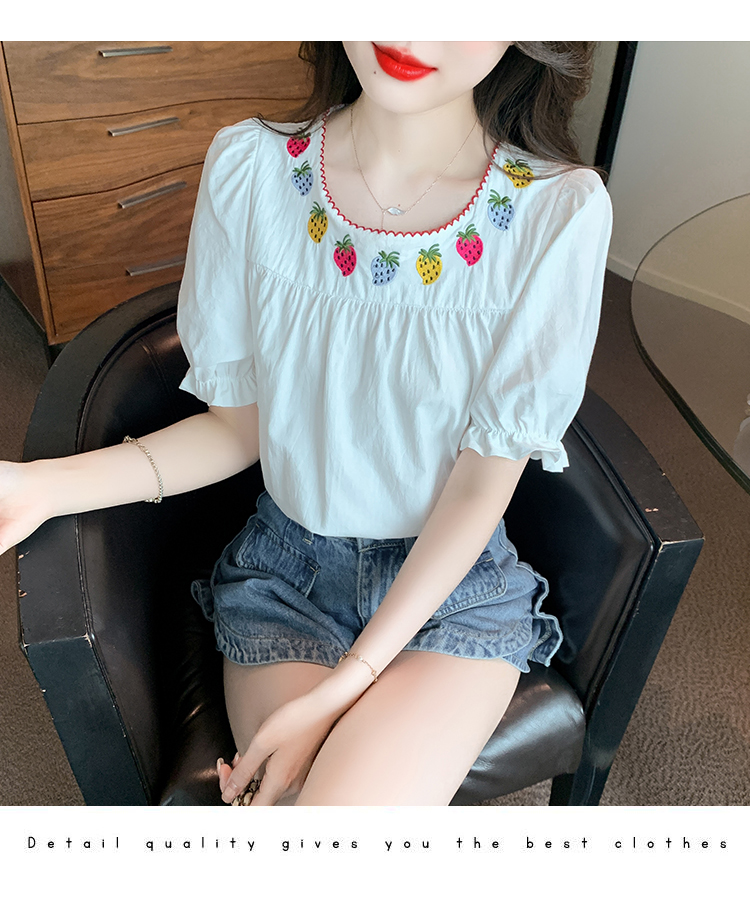 RM18568#刺绣草莓短袖圆领衬衫2023夏季新款设计感百搭减龄上衣女