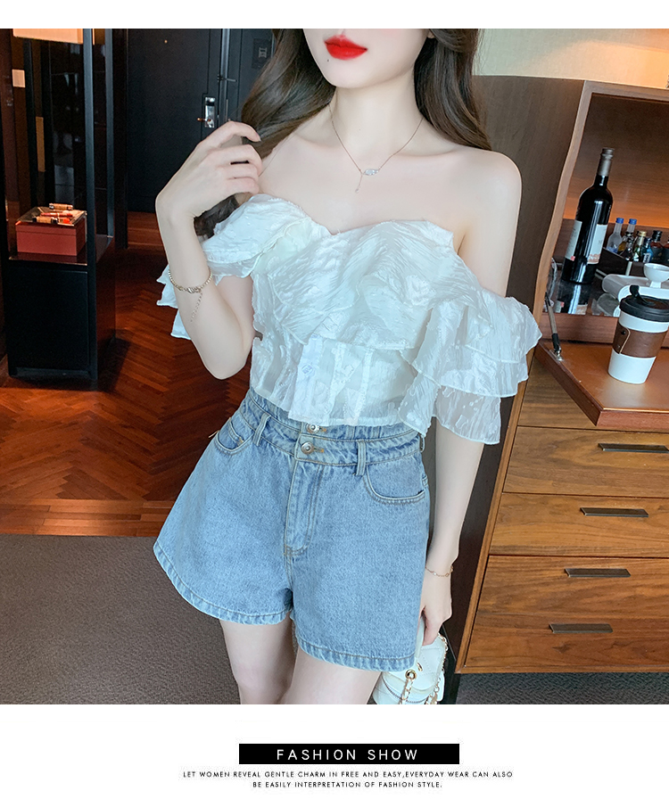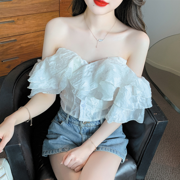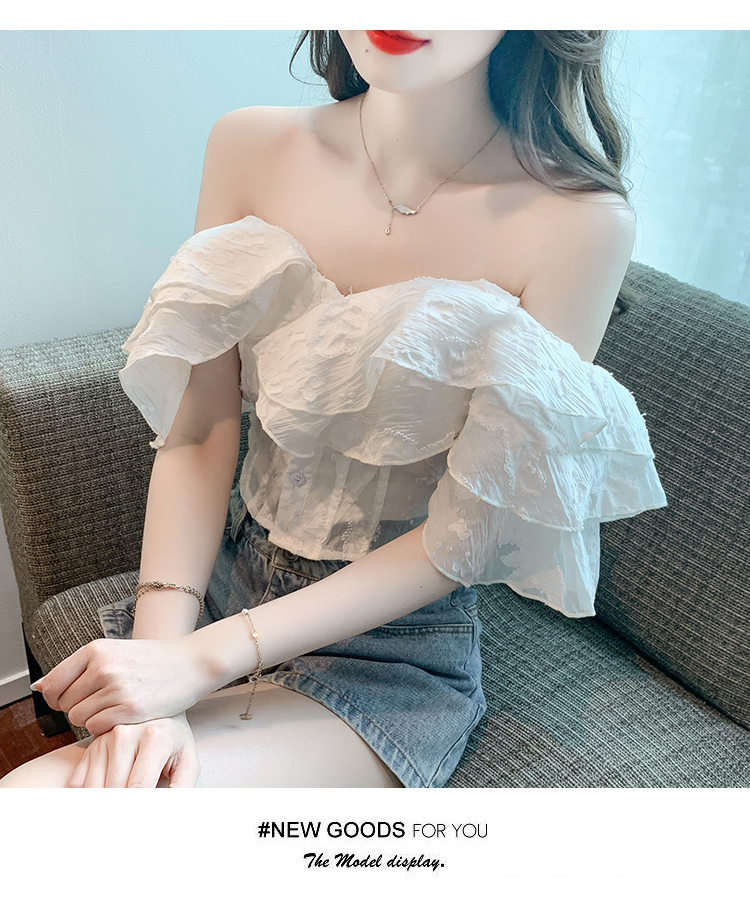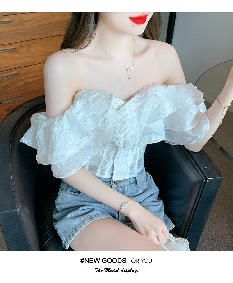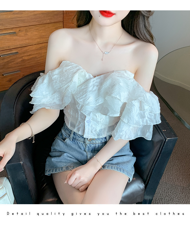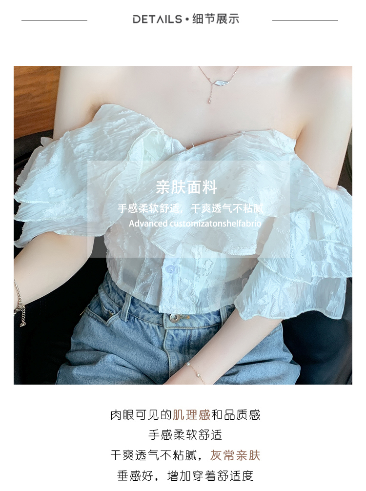 RM18614#荷叶边收腰一字肩衬衫2023夏季设计感小众鱼骨裹胸修身上衣
