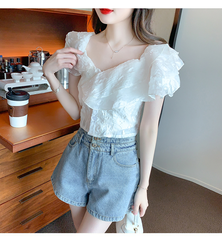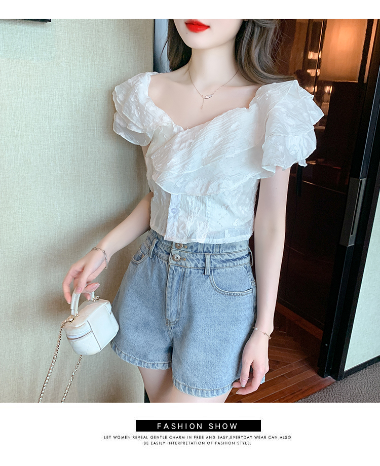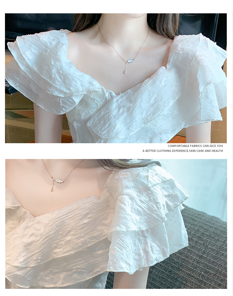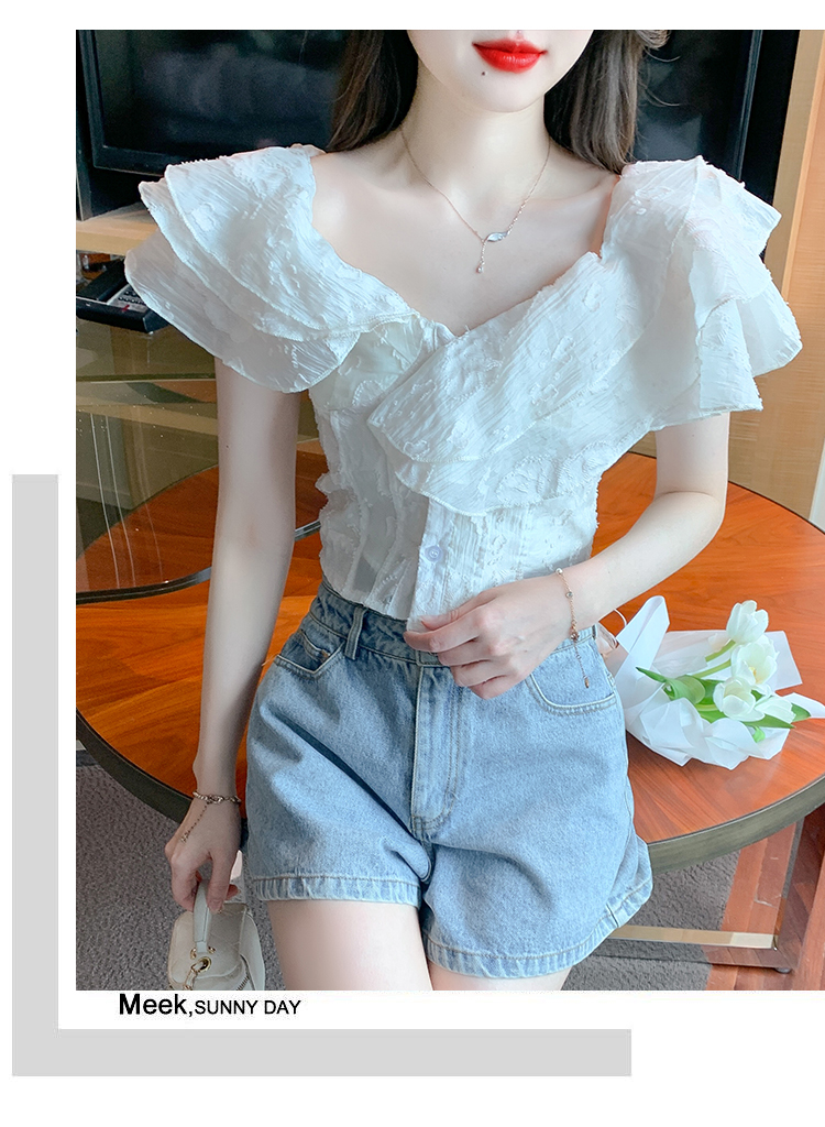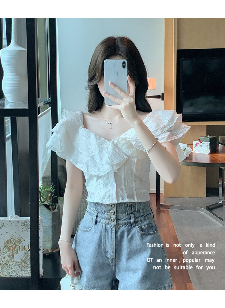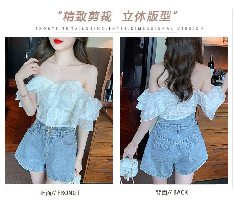 RM18614#荷叶边收腰一字肩衬衫2023夏季设计感小众鱼骨裹胸修身上衣