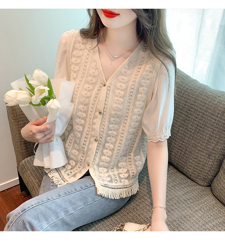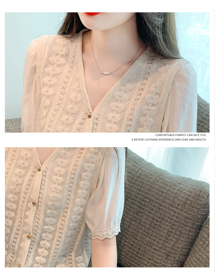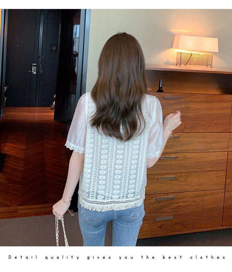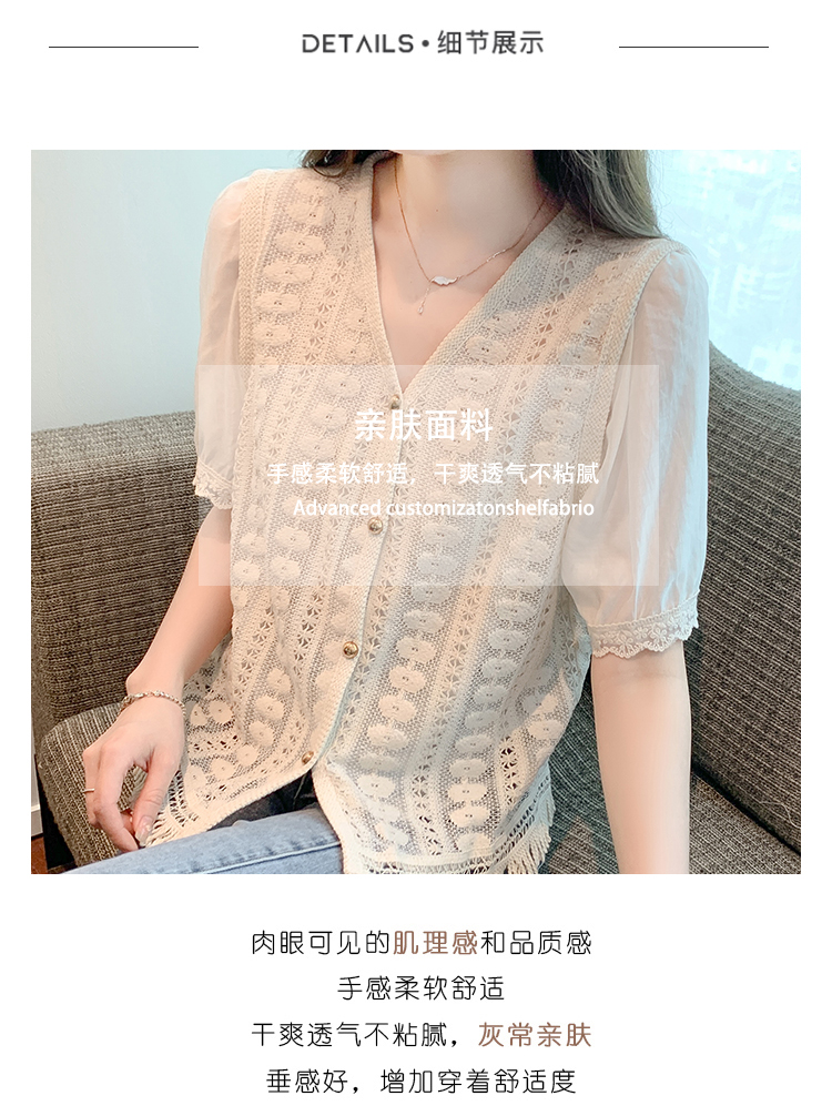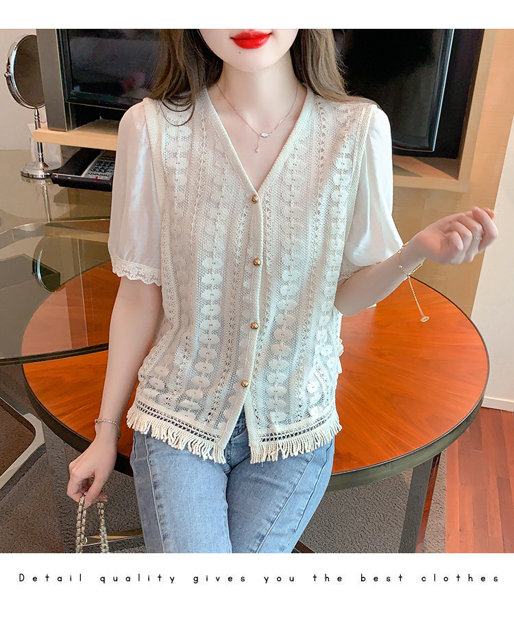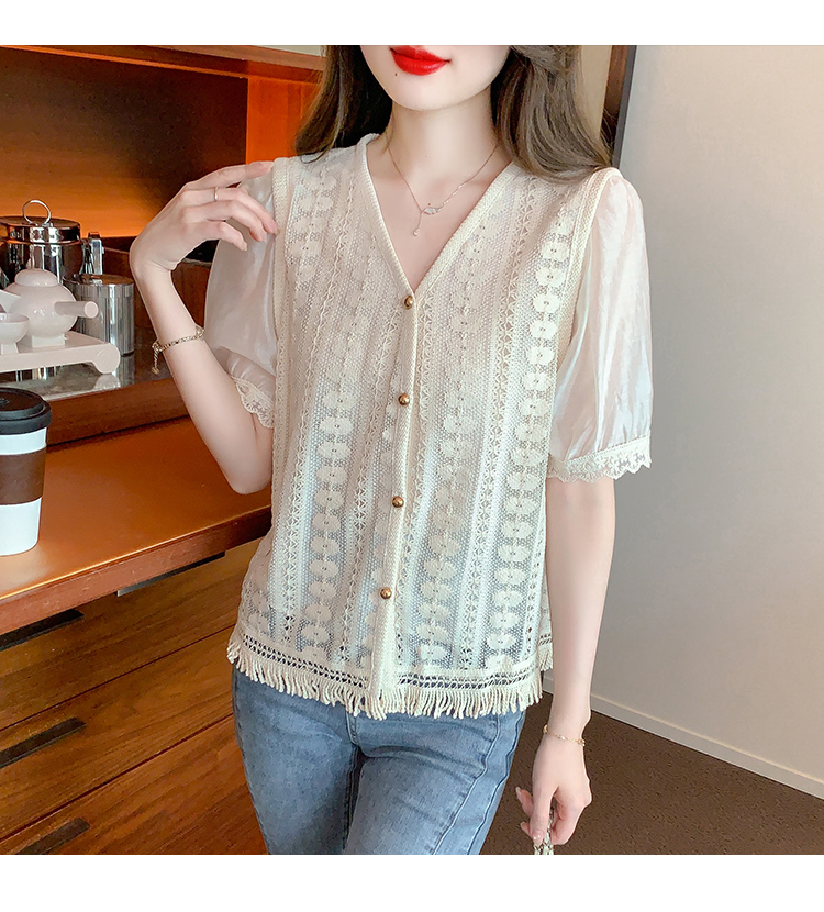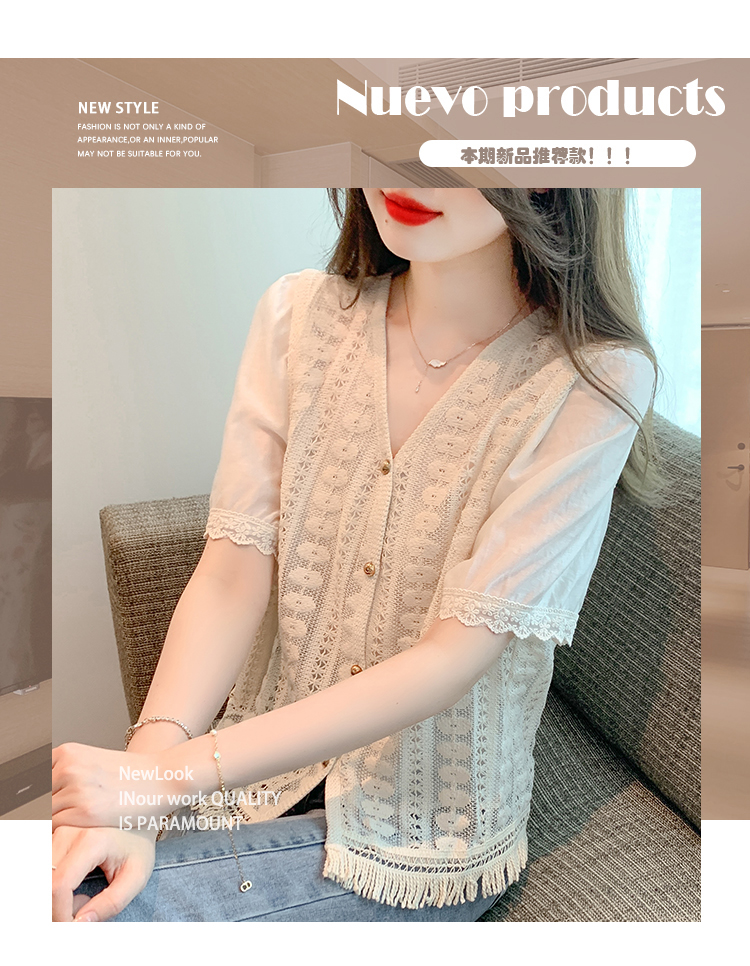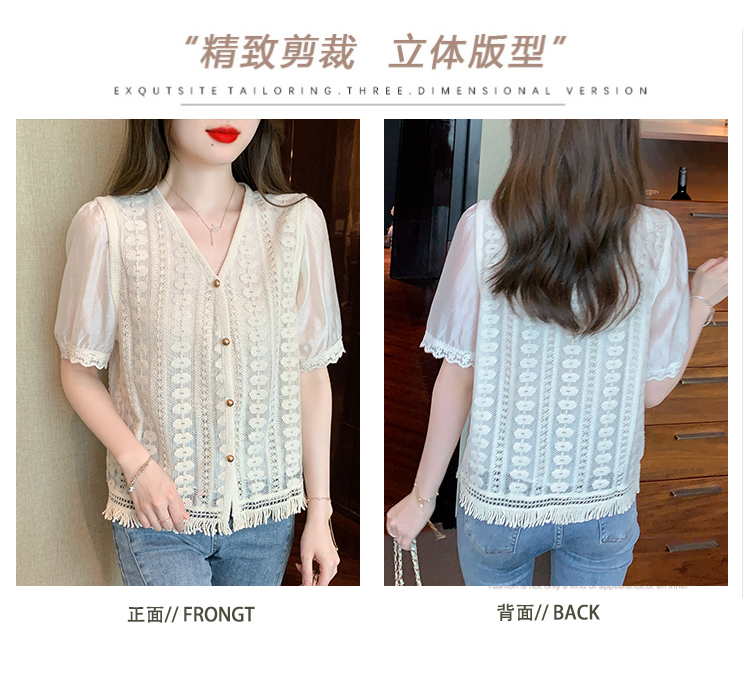 RM18592#夏季新款设计感小众钩花拼接天丝上衣V领流苏短袖衬衫女