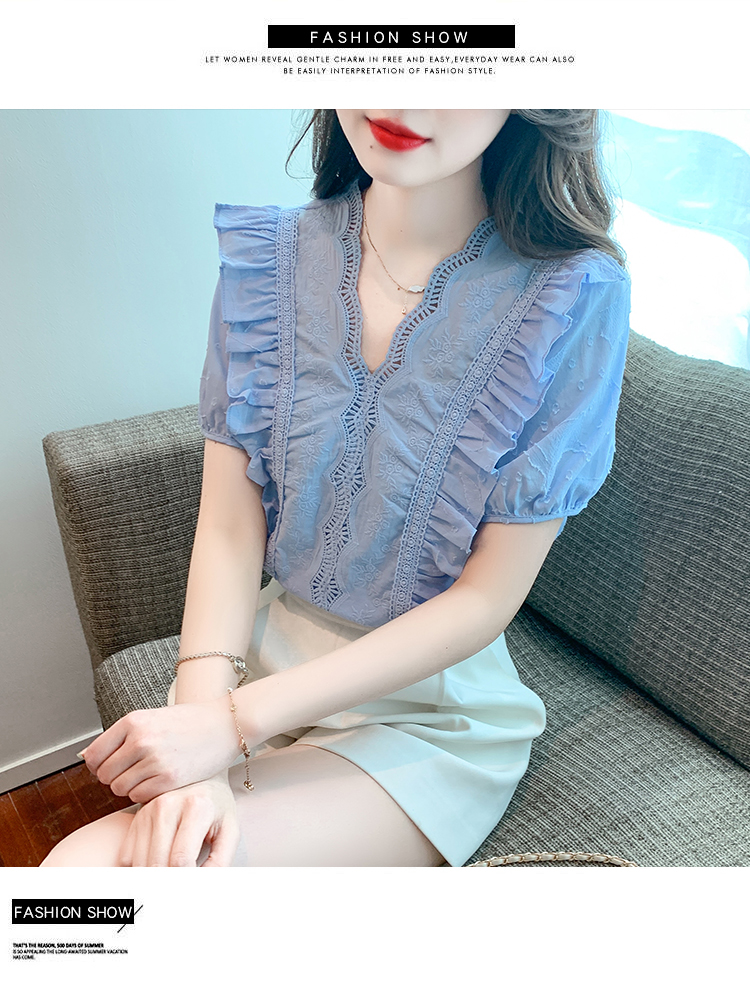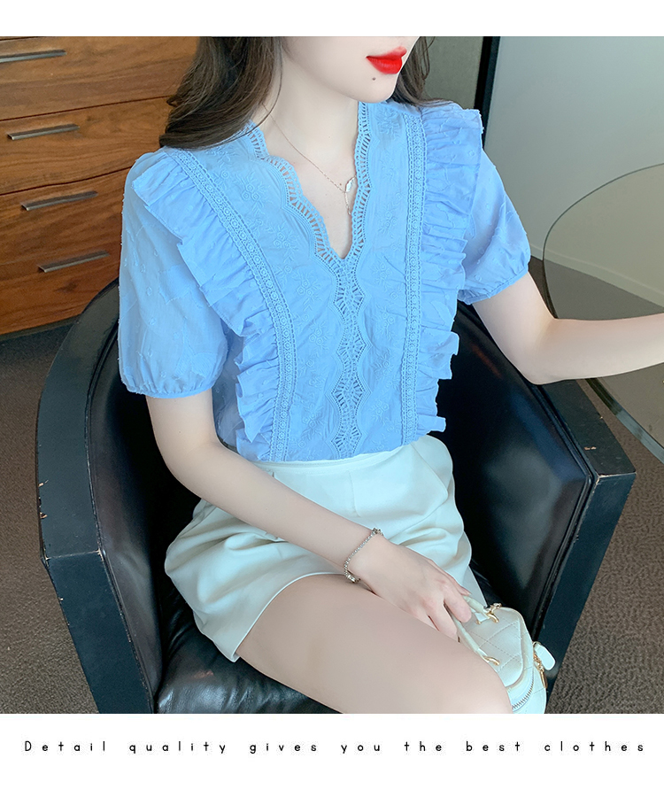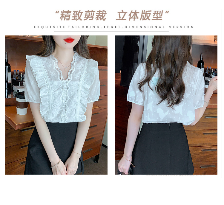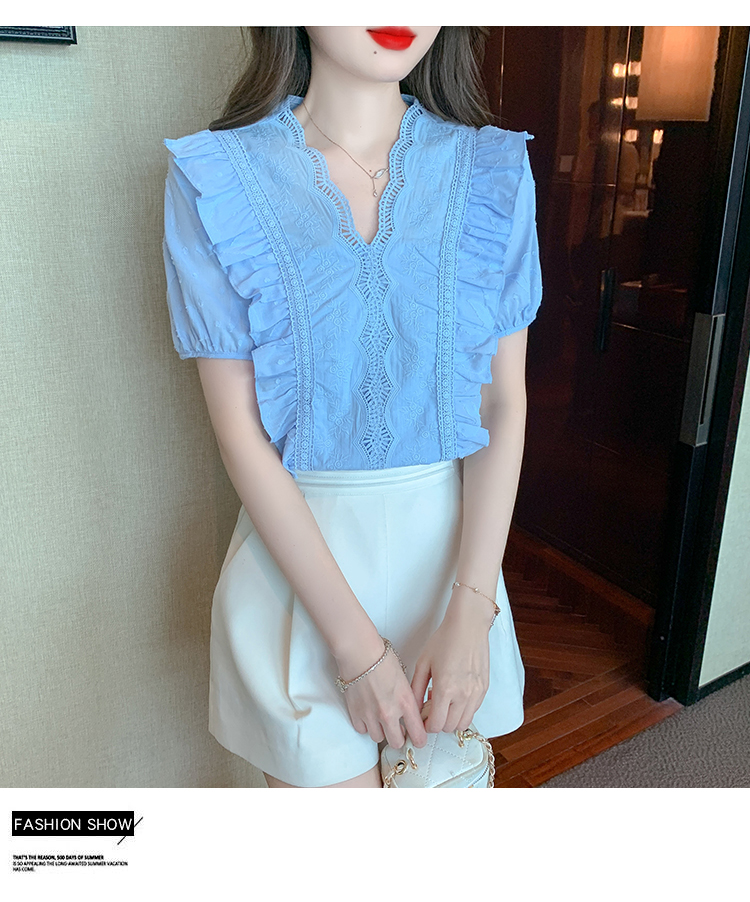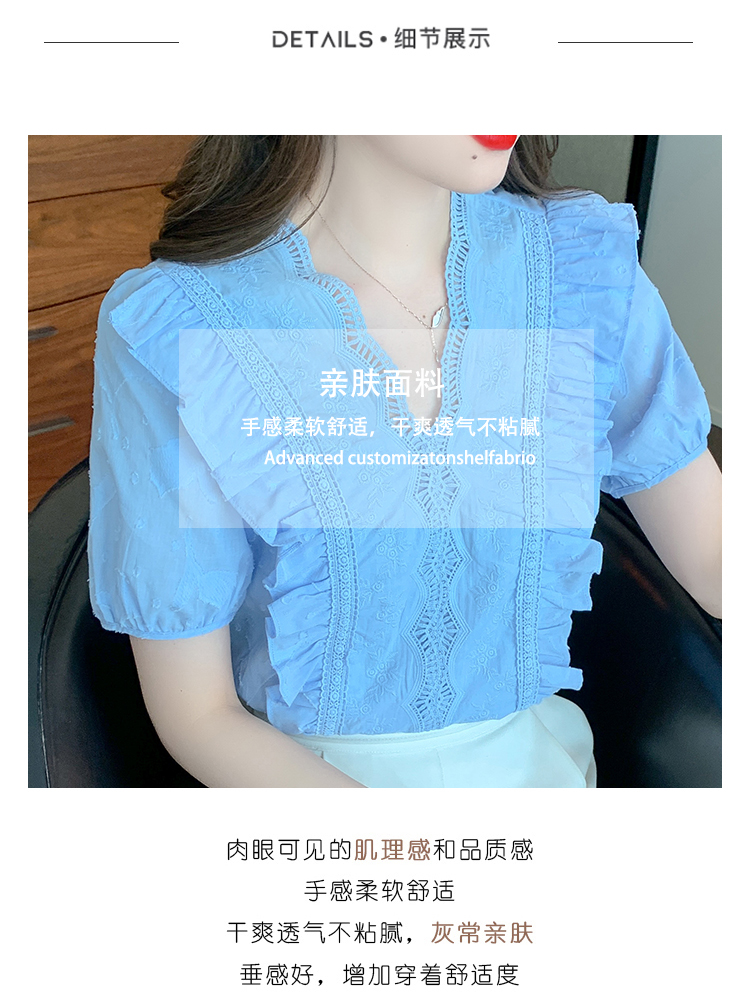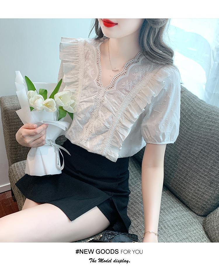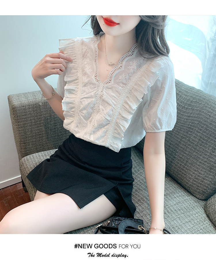 RM18558#李一桐同款法式V领荷叶边绣花衬衫女士夏季上衣