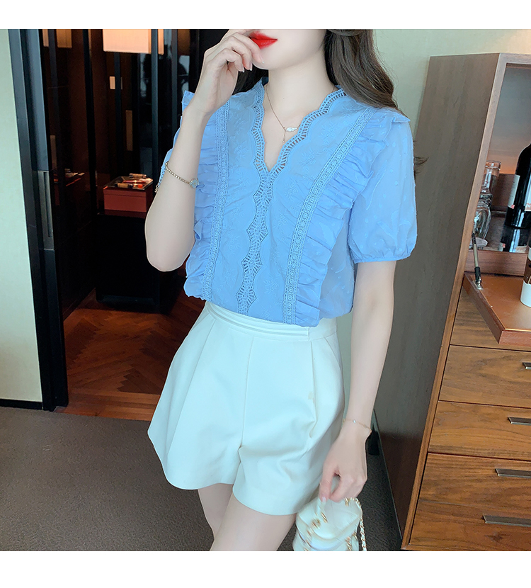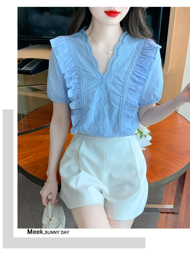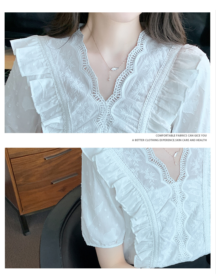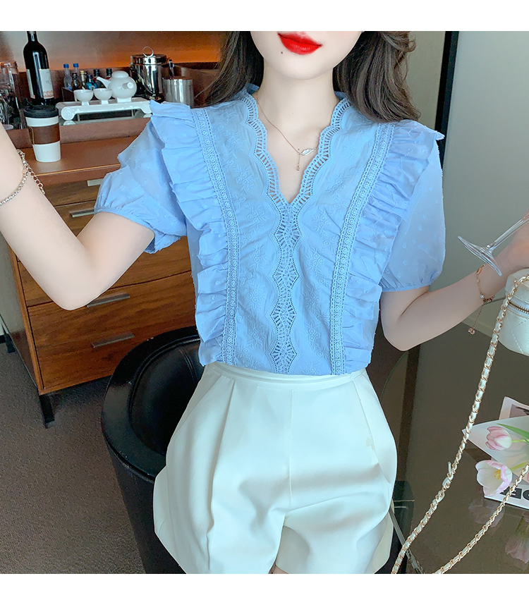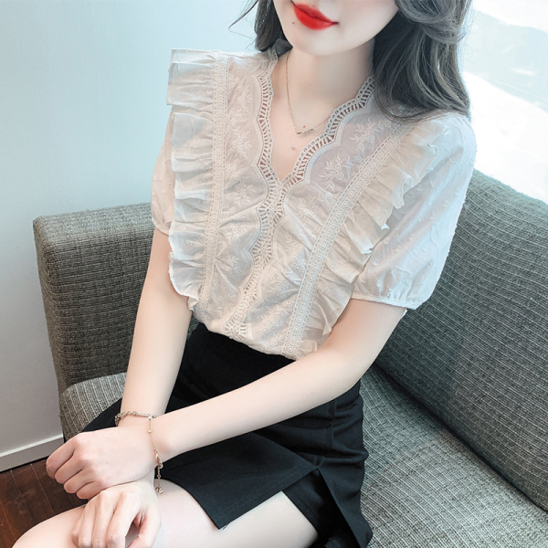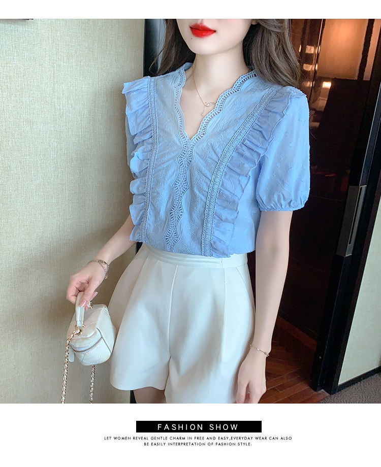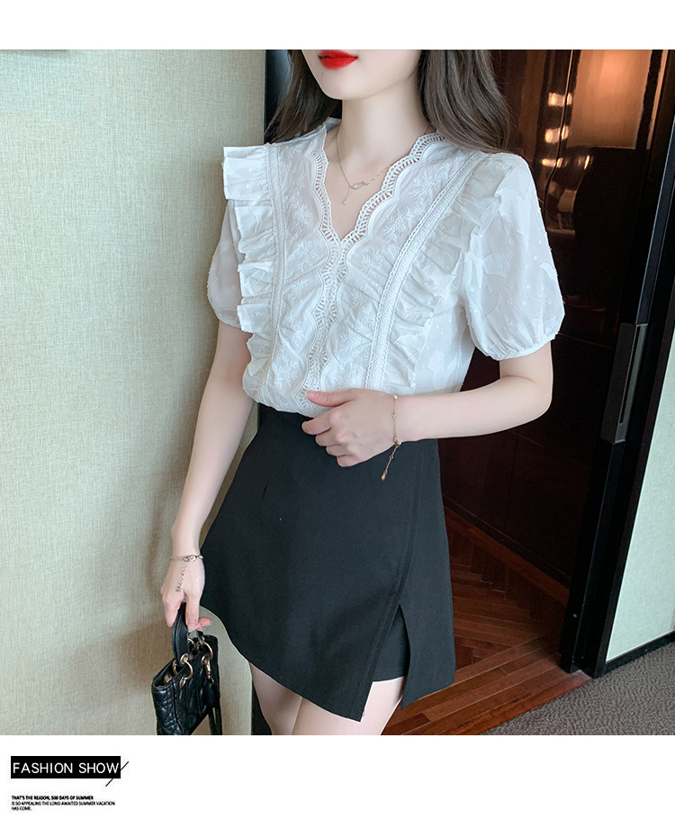 RM18558#李一桐同款法式V领荷叶边绣花衬衫女士夏季上衣