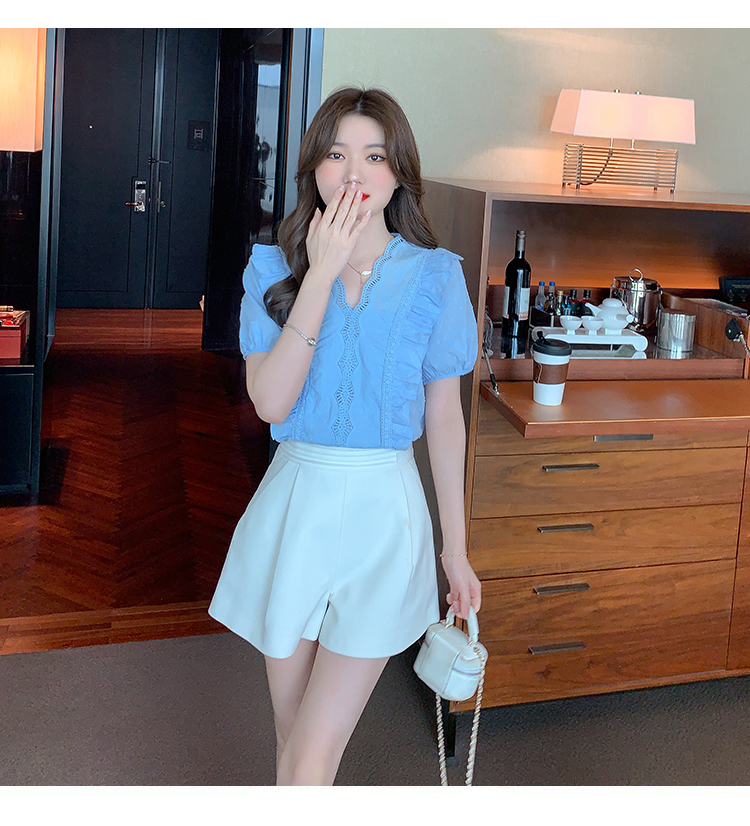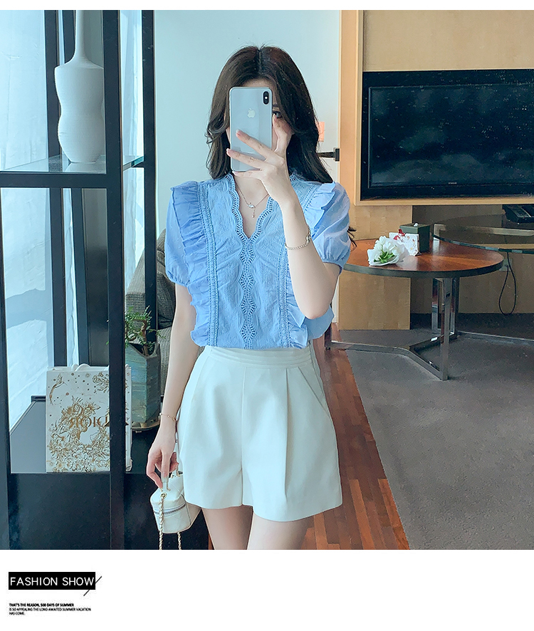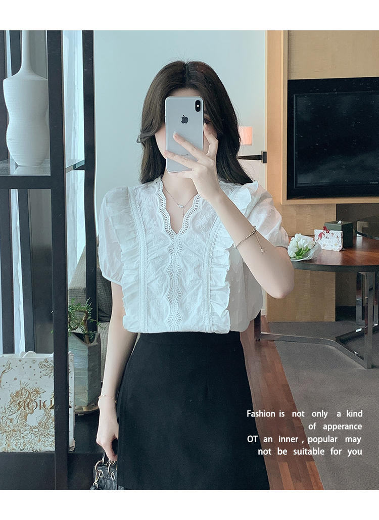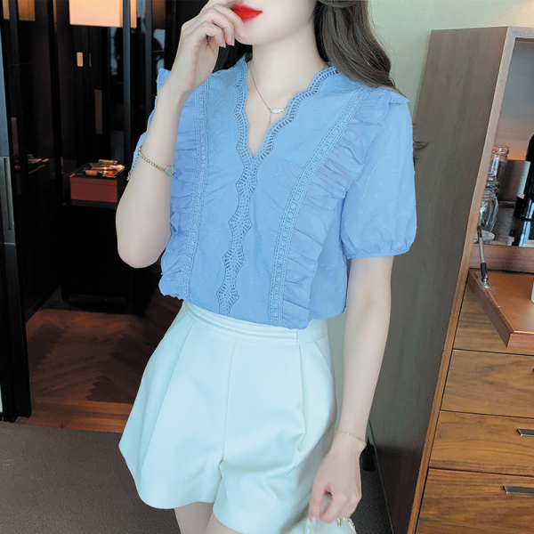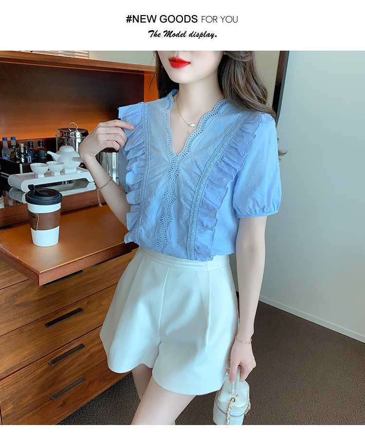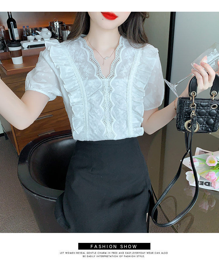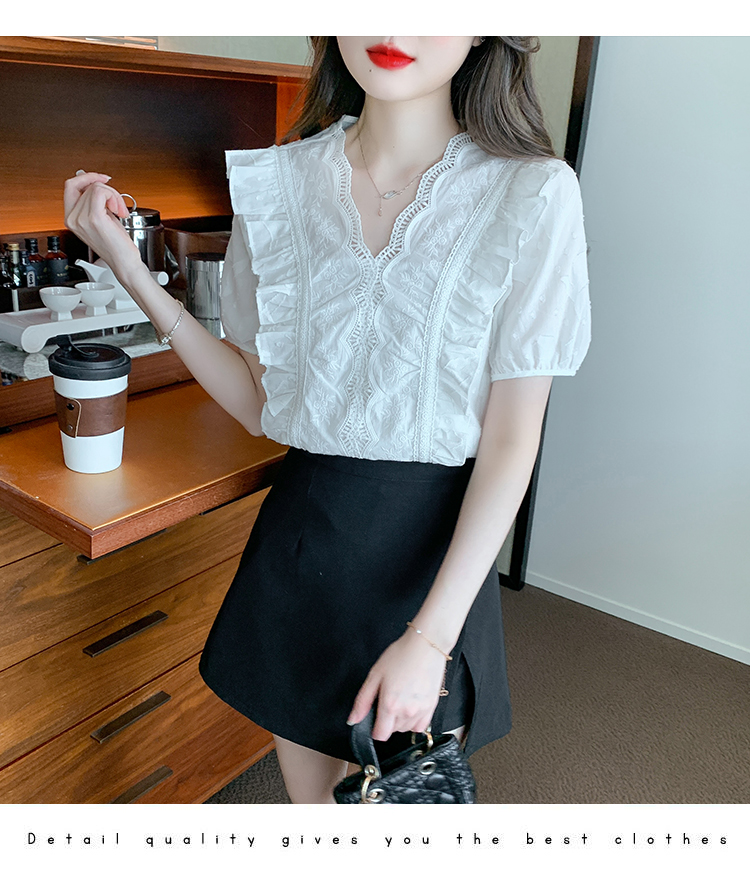 RM18558#李一桐同款法式V领荷叶边绣花衬衫女士夏季上衣