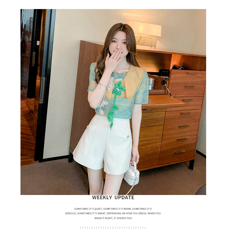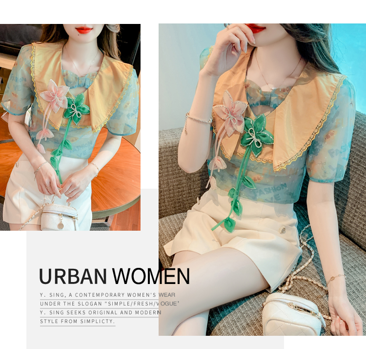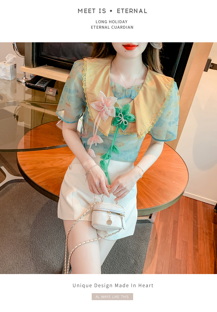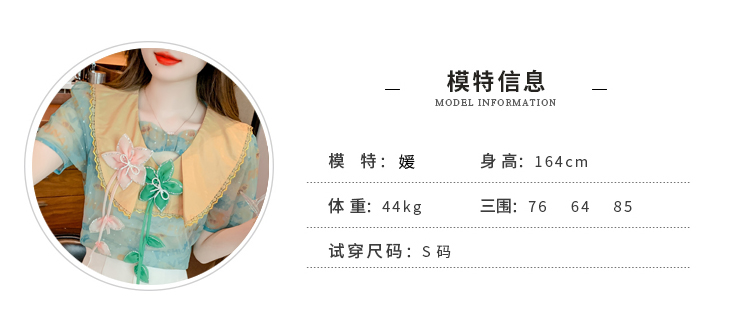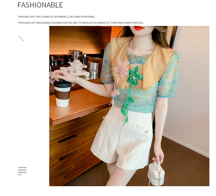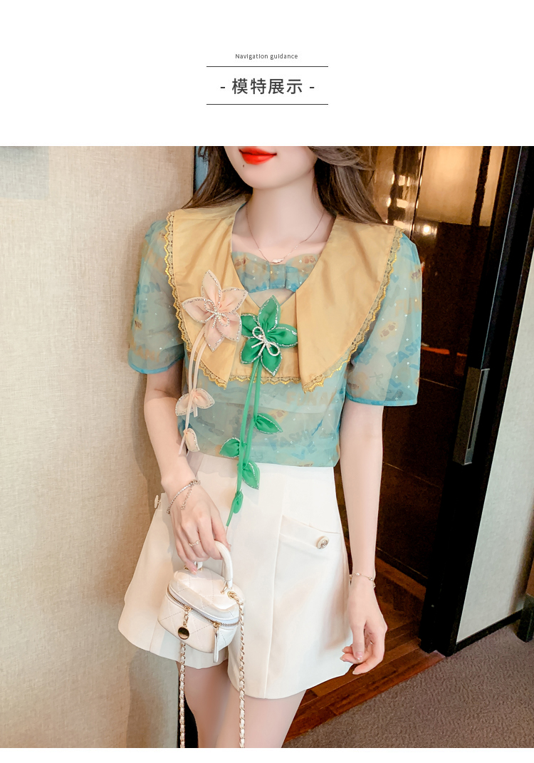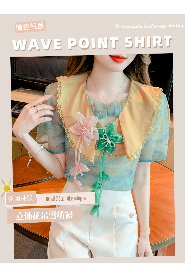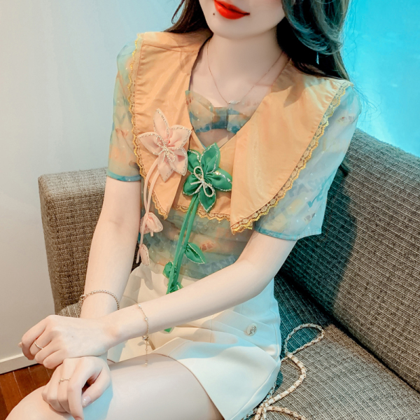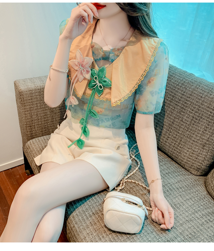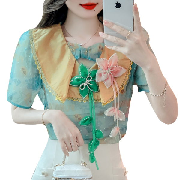 RM18672#夏季新款雪纺网纱衬衫重工花朵订珠钉钻短袖上衣