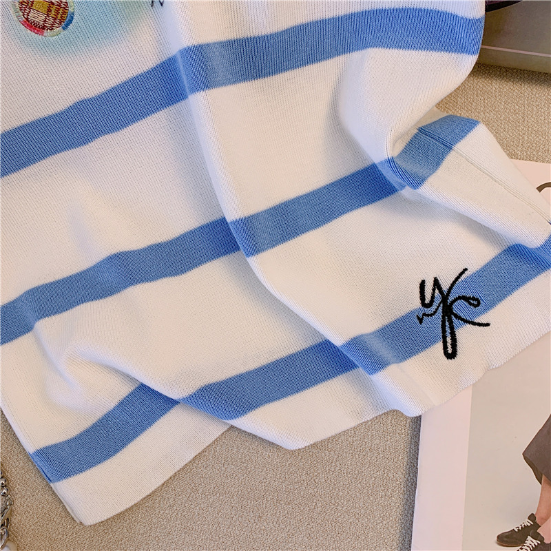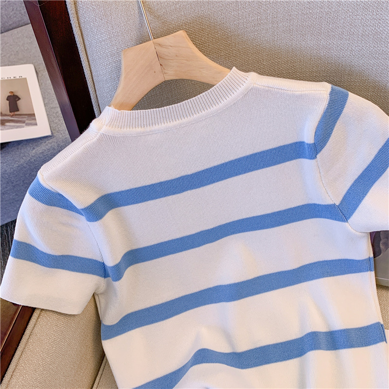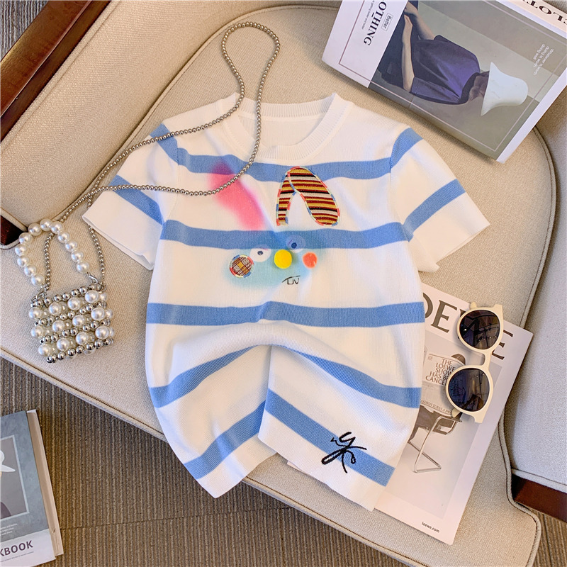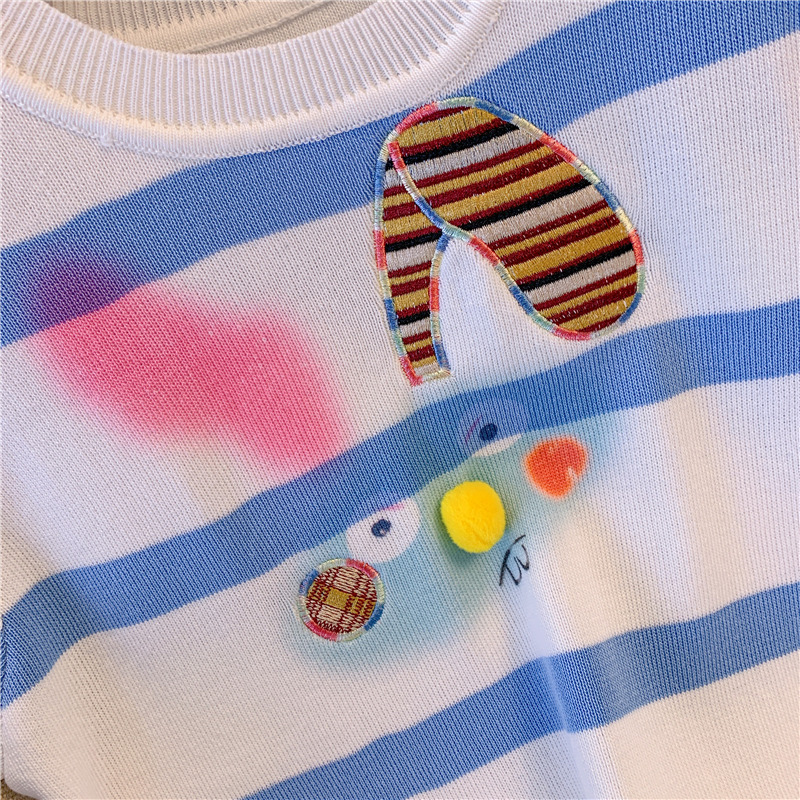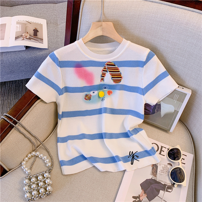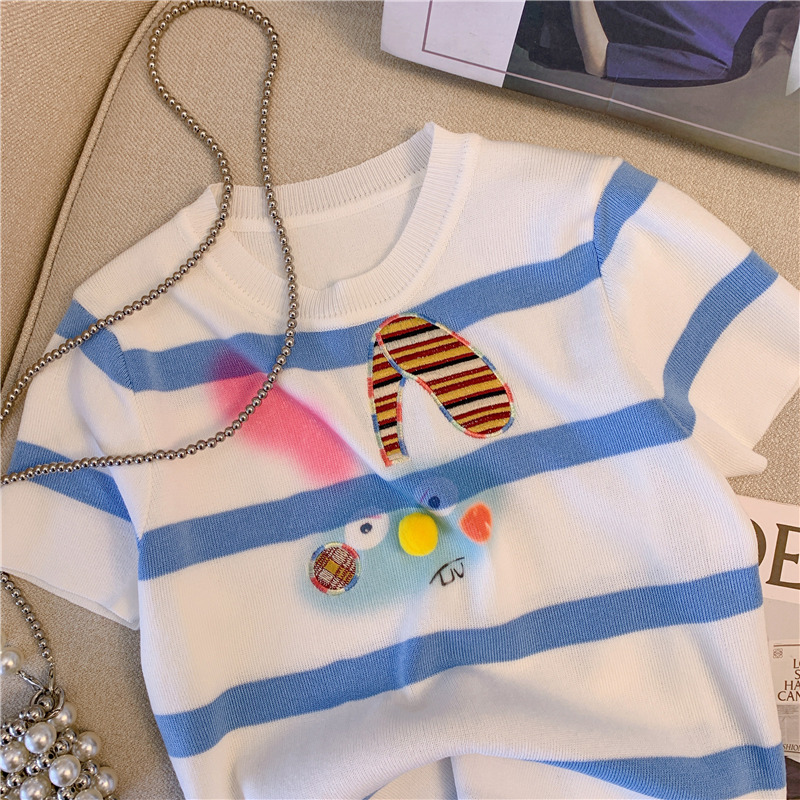 RM18464#撞色条纹兔子刺绣正肩短袖T恤女2023夏季新款别致修身短上衣