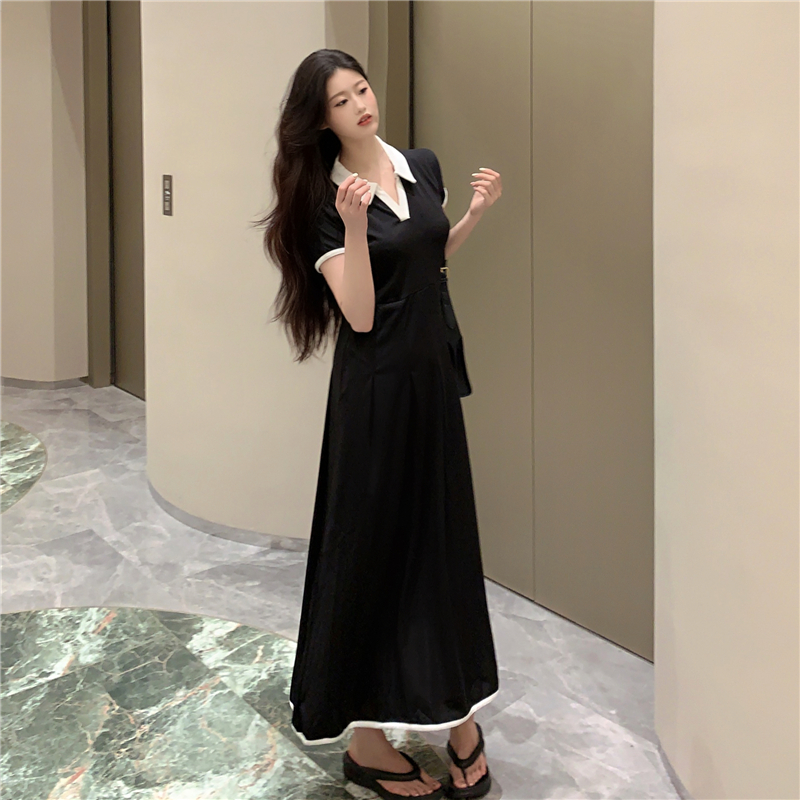 RM18395#大码女装胖mm撞色短袖Polo领百褶设计感气质连衣裙
