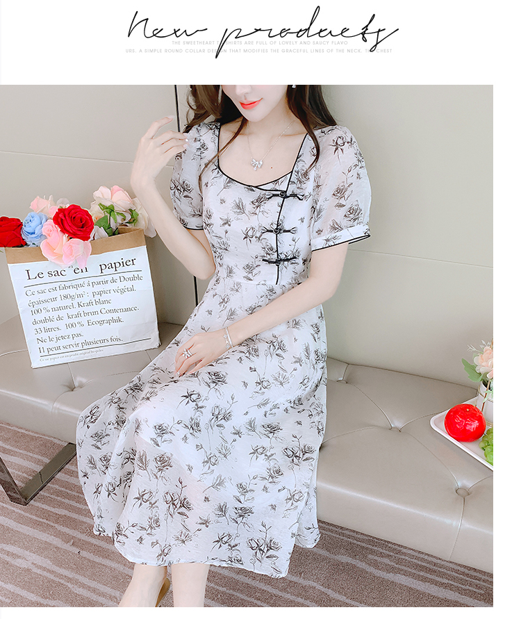 RM18715#国风印花连衣裙2023新款女夏季泡泡袖水墨画收腰裙子