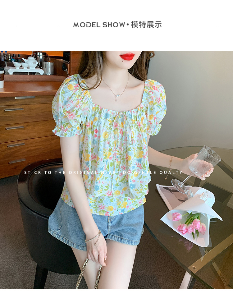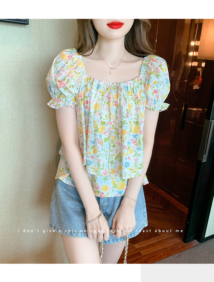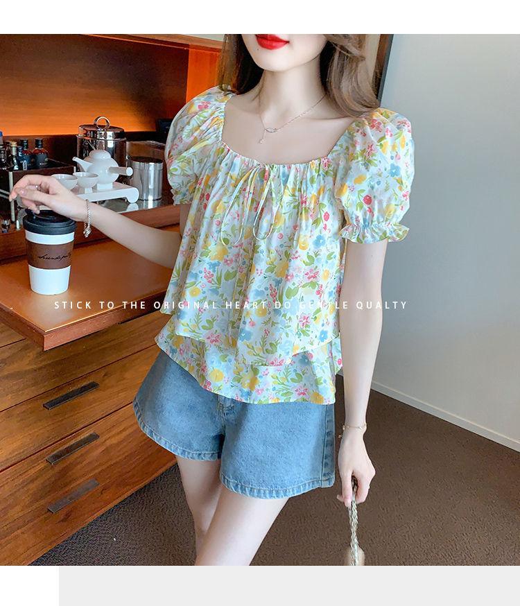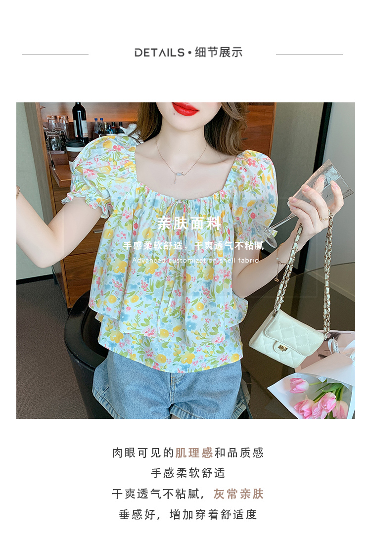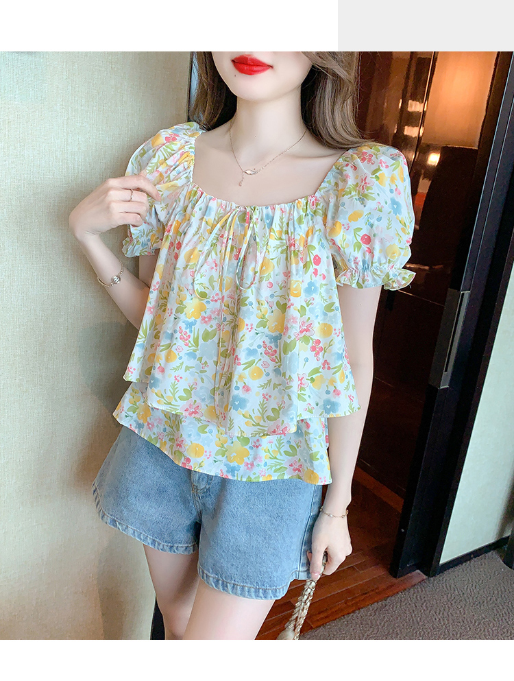 RM18780#夏季新韩系碎花泡泡袖收腰双层小个子气质女衬衫上衣女