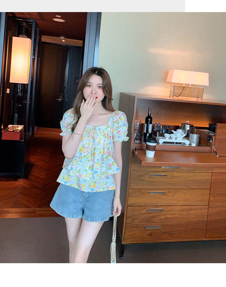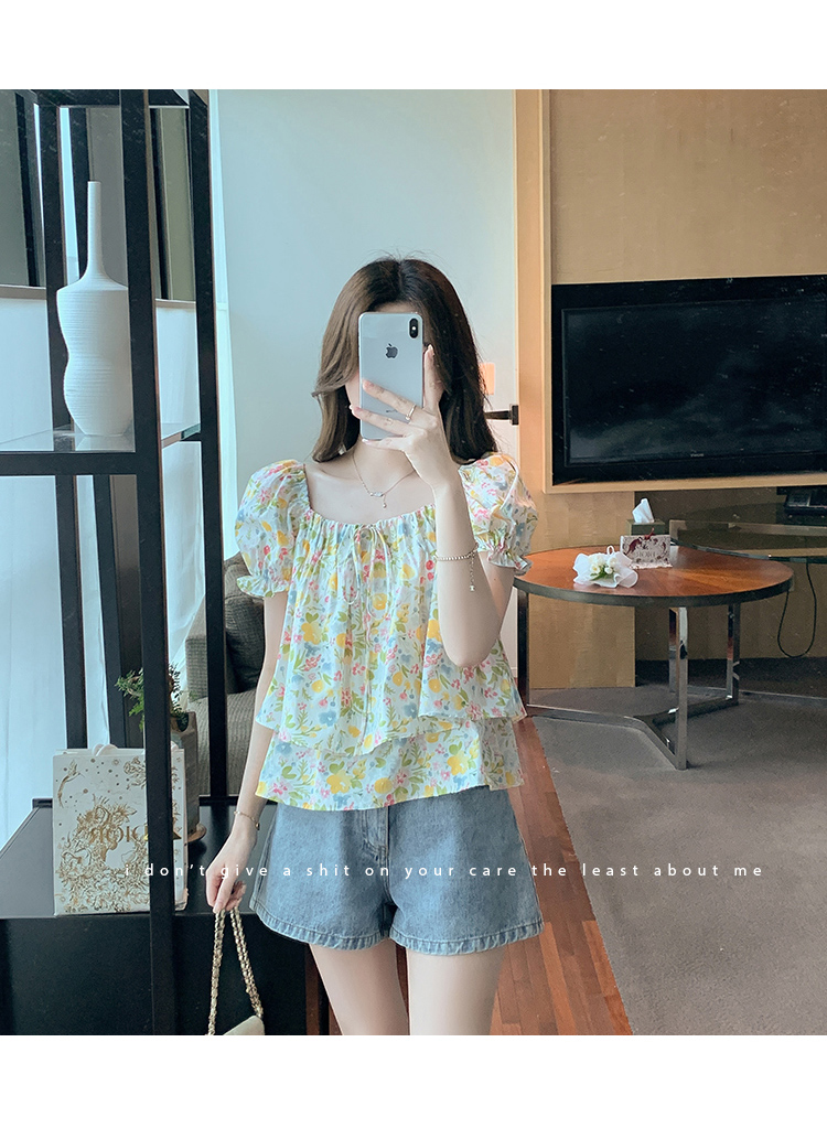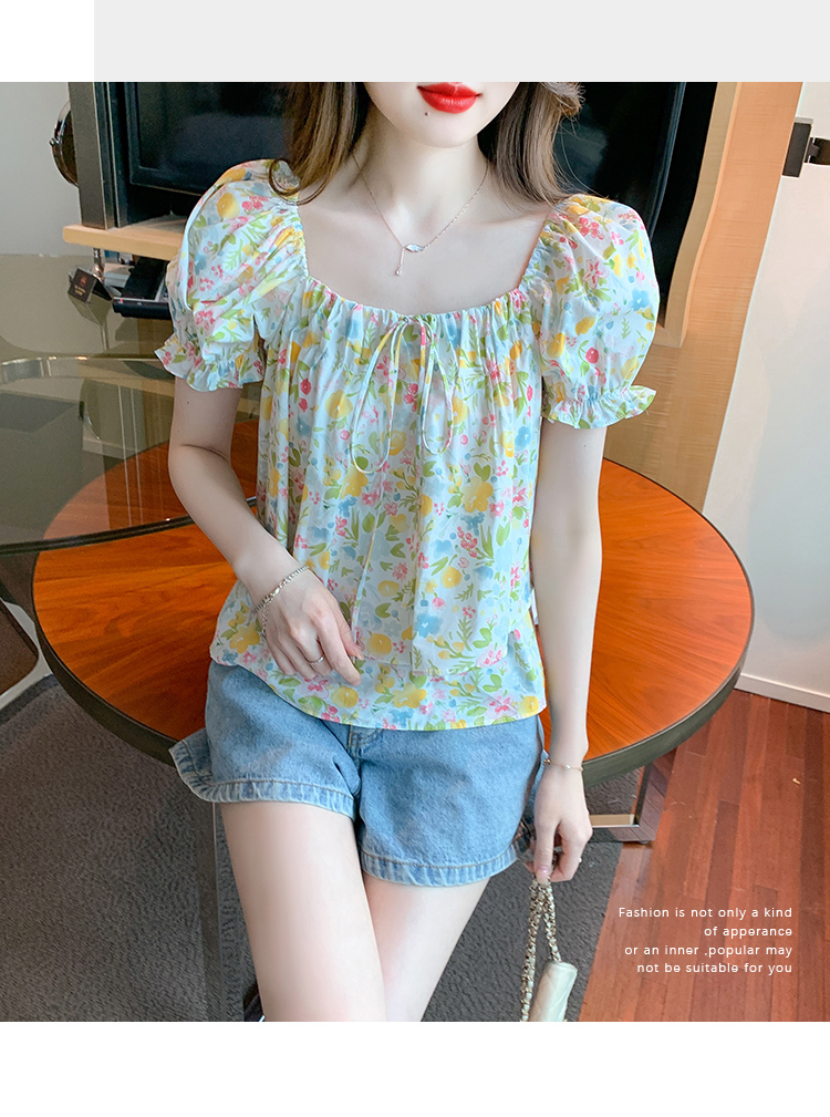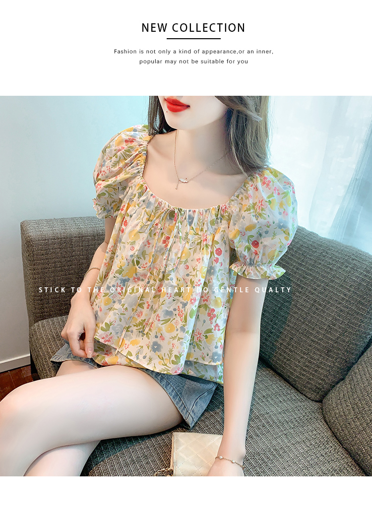 RM18780#夏季新韩系碎花泡泡袖收腰双层小个子气质女衬衫上衣女